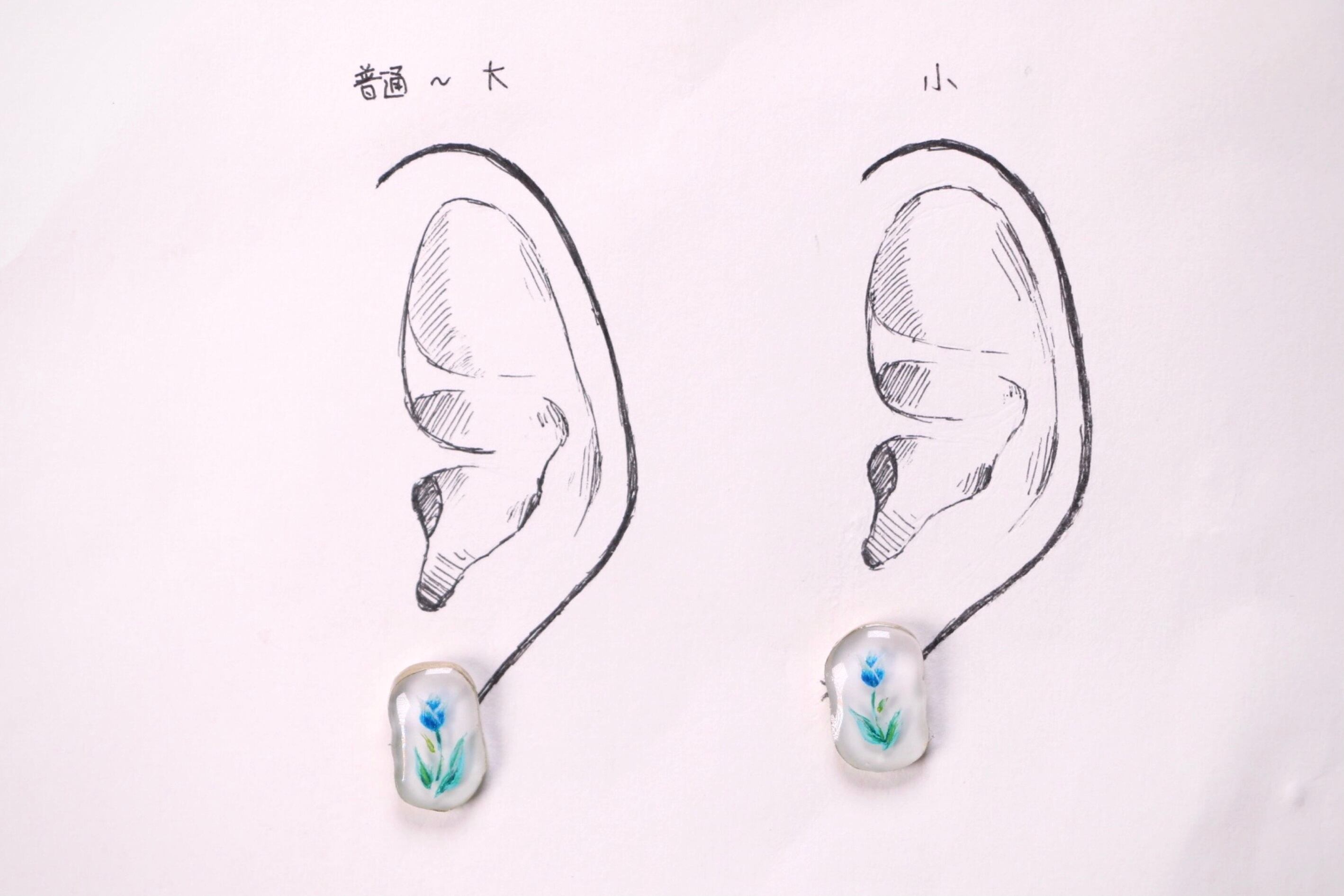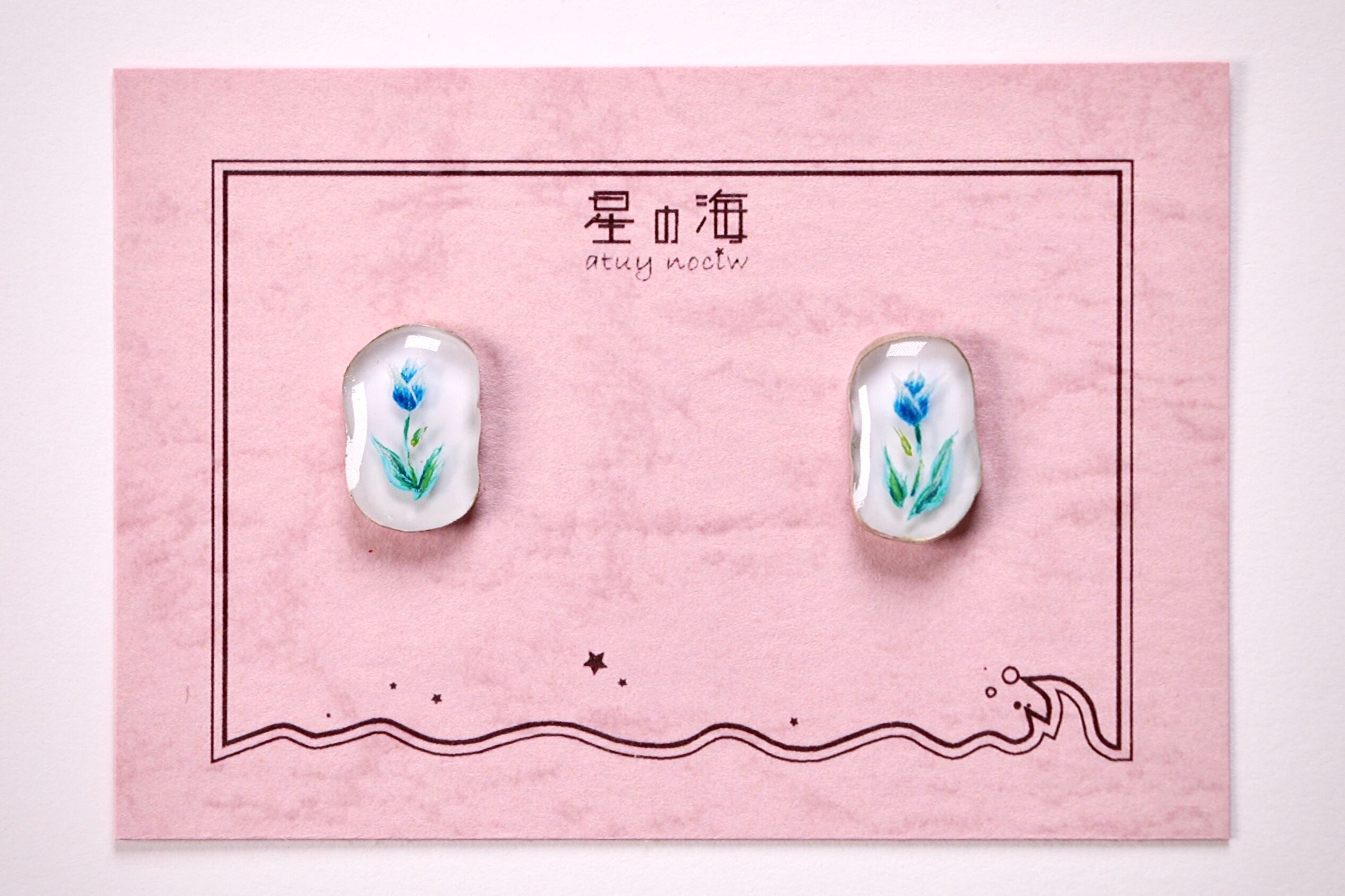 ハンドメイド アクセサリー 金アレ対応 金属アレルギー対応 ノンホールピアス レジン プラ板 かわいい 手描き 綺麗 高見え プレゼント ギフト 彼女 友人 恋人 カジュアル タイル 小ぶり 秋 ファッション コーディネート 服 デザイン チューリップ 青 花言葉 ゆがみ アシメ クール キュート