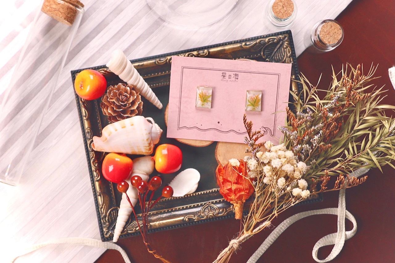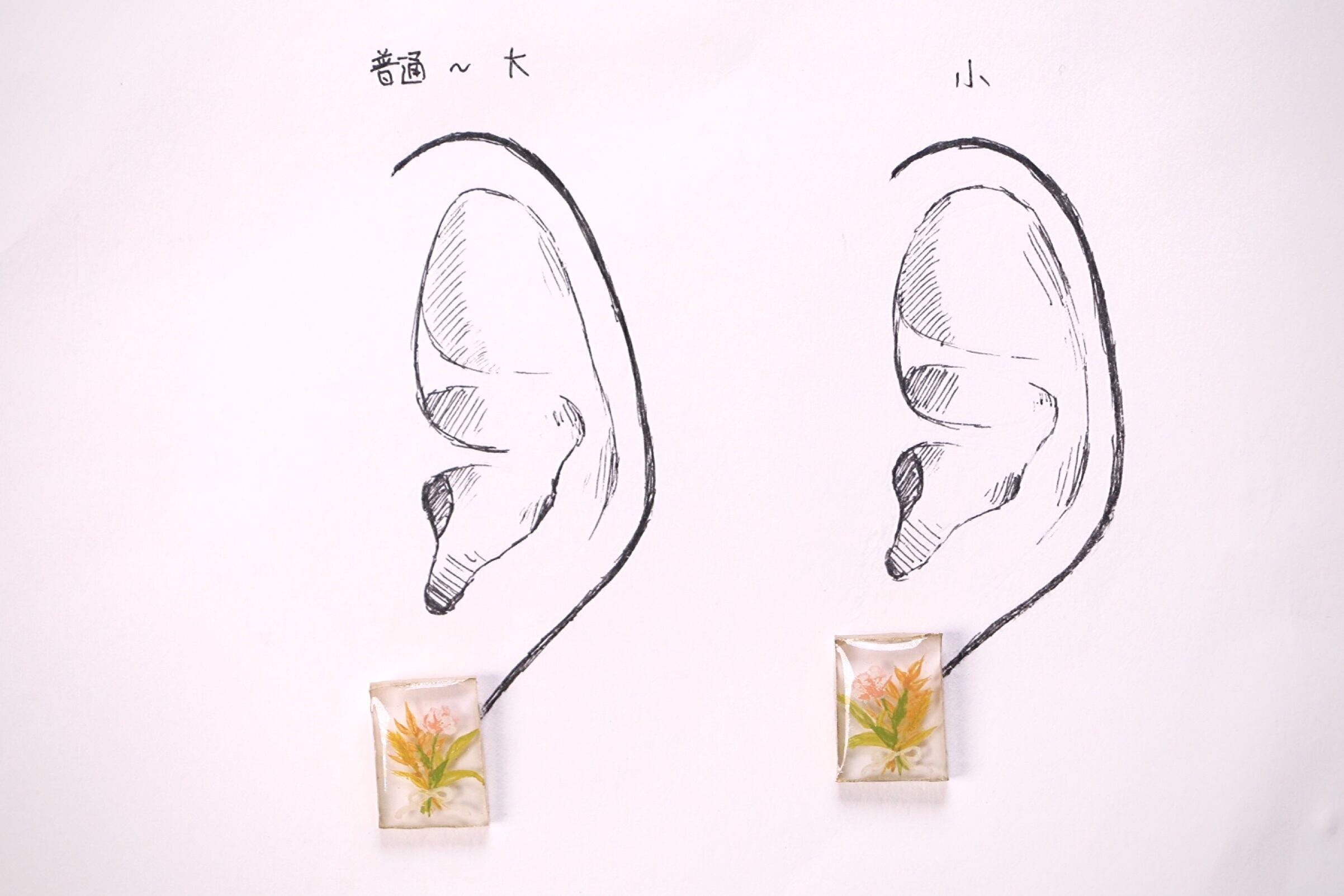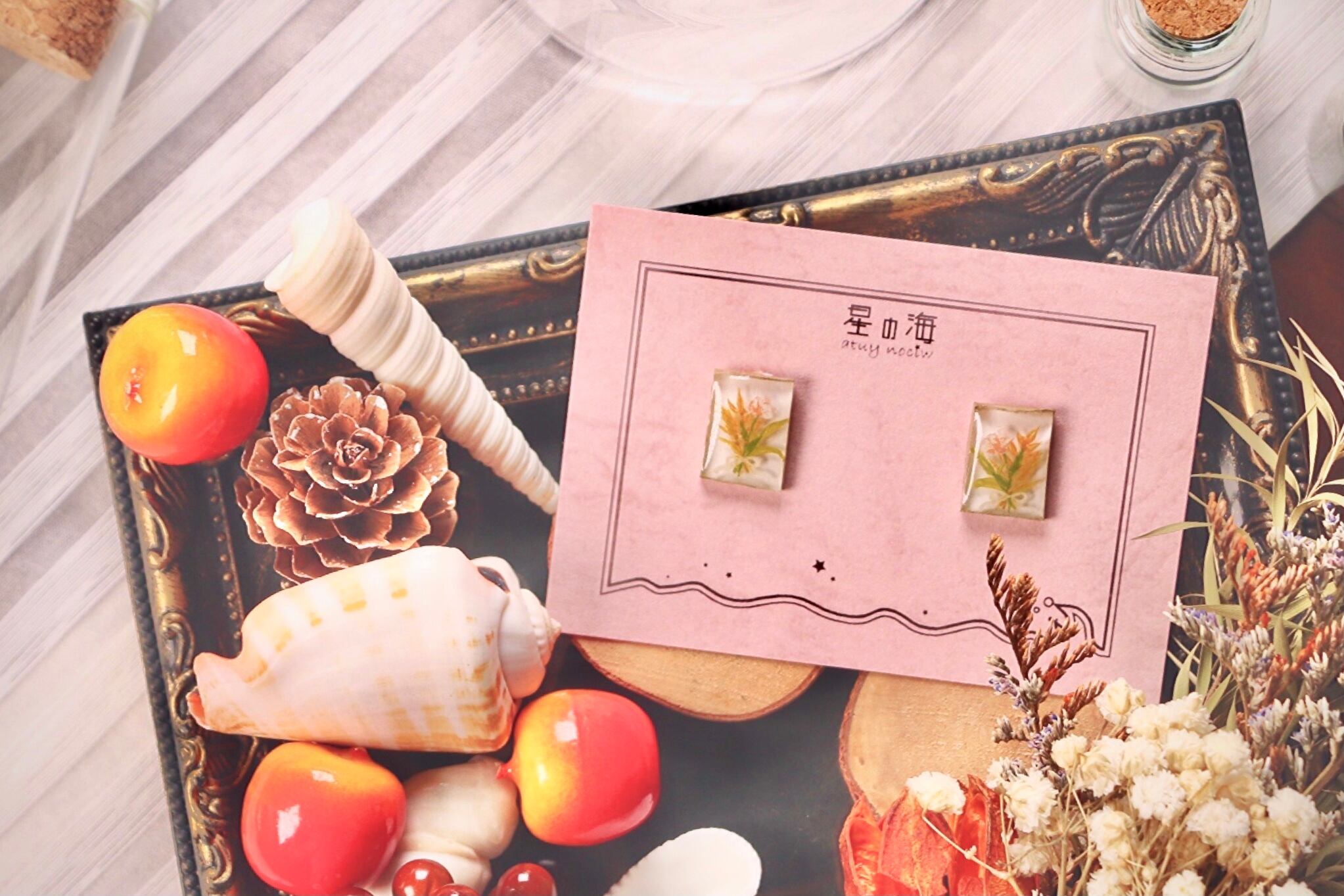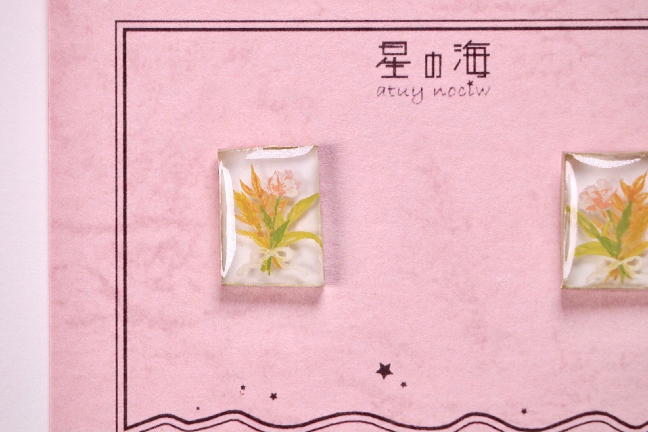 ハンドメイド アクセサリー ピアス イヤリング ノンホールピアス レジン プラ板 かわいい 手描き 綺麗 ドライフラワー サンクスギビングデー 感謝祭 高見え 花束 プレゼント ギフト 彼女 友人 恋人 カジュアル タイル 四角 小ぶり カーネーション 秋 ファッション コーディネート 服 デザイン 秋色