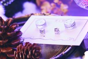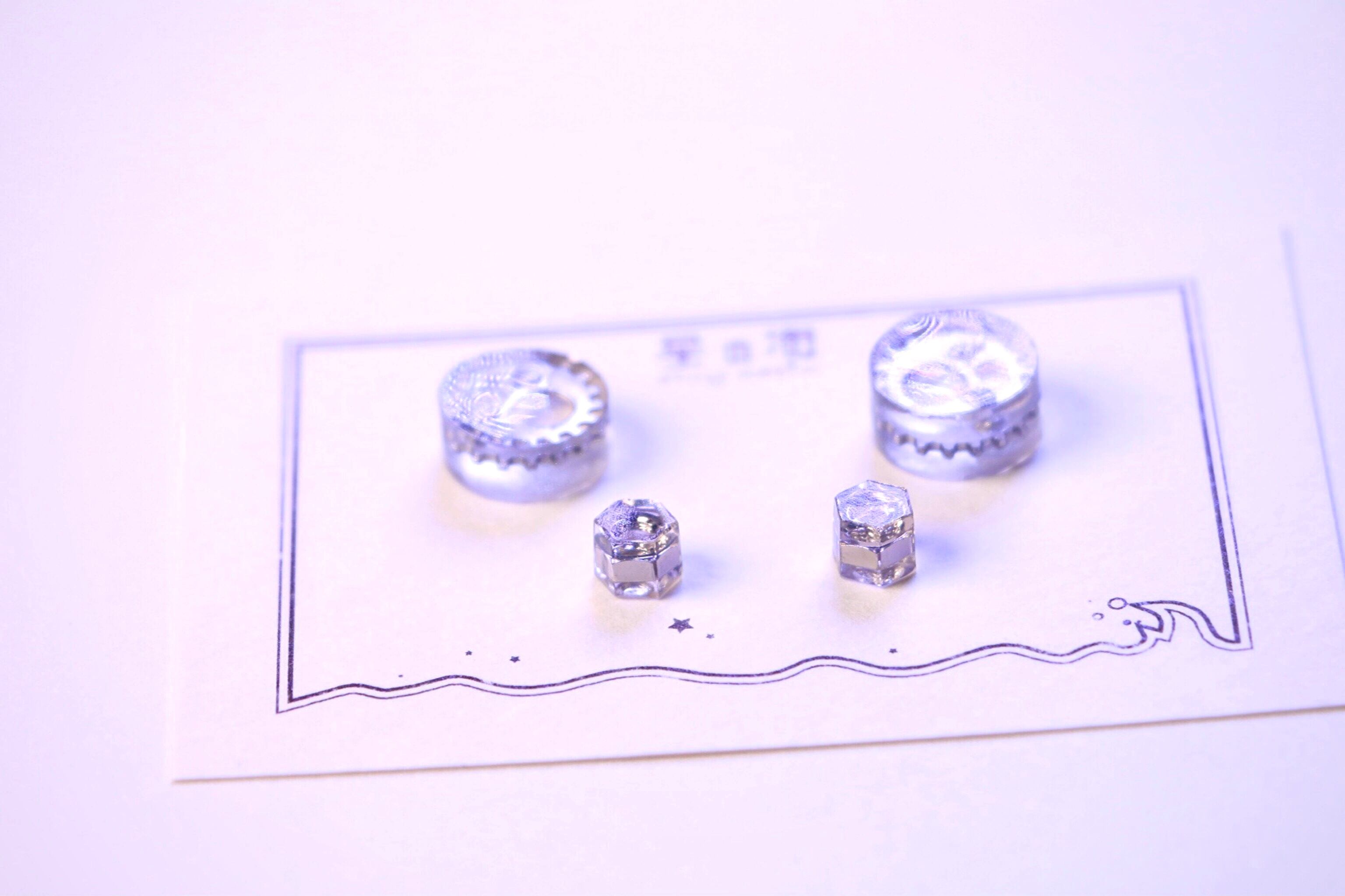 片方は円筒状の中にシルバーの歯車を浮かぶように閉じ込めています。小さめの方は六角形の筒の中にミニナットをぎゅっと入れて♪
