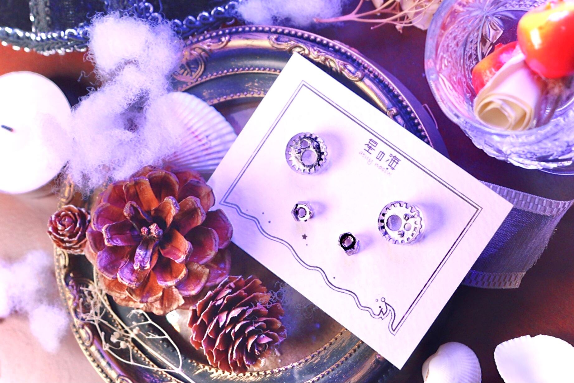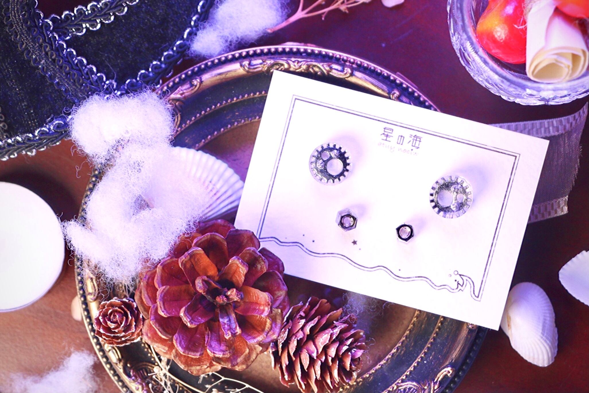 ハンドメイド アクセサリー ピアス イヤリング ノンホールピアス 樹脂 レジン かわいい 綺麗 高見え プレゼント ギフト 彼女 友人 恋人 カジュアル 秋 ファッション コーディネート 服 デザイン 秋色 歯車 ヴィンテージ ビンテージ スチームパンク アンティーク かっこいい 時計 ユニセックス シルバー ナット 立体的 実験 培養 ポット