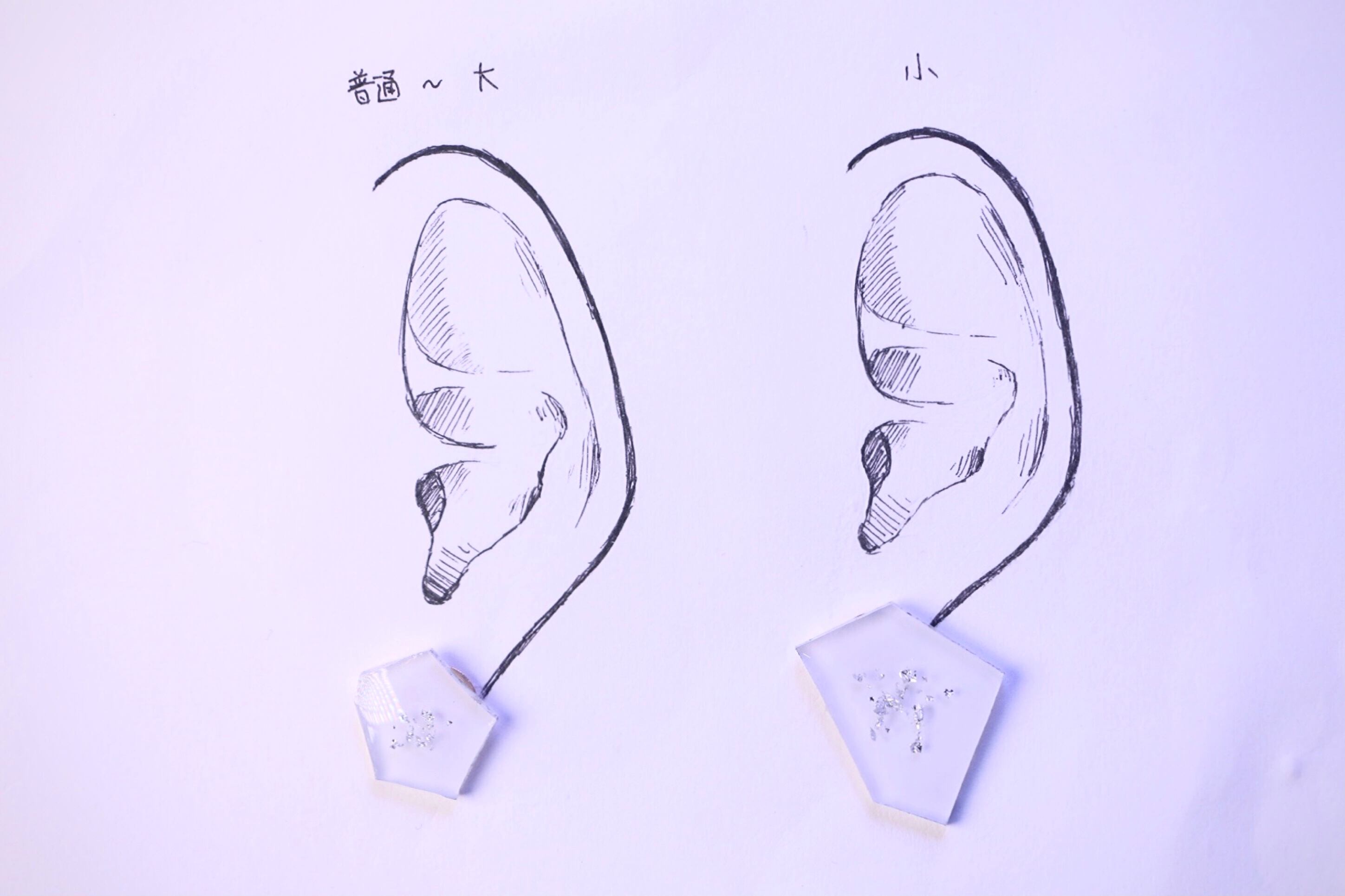 写真では耳につけるパーツをつけていないため、台紙にはマスキングテープで留めている状態です。耳シートの左は平均的な女性の普通〜大きめの耳、右は小さめの耳のモデルとなっております。ご参照ください。