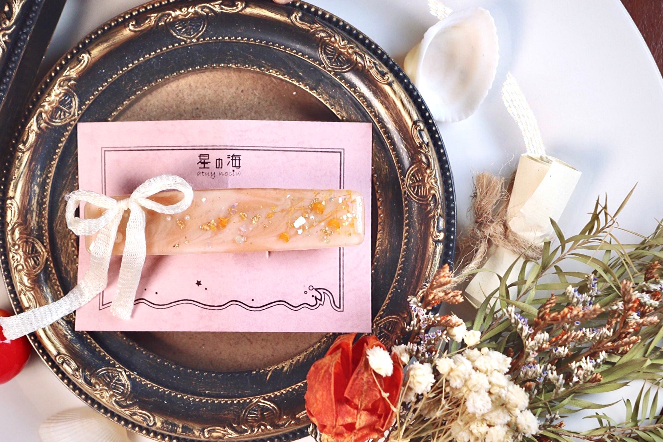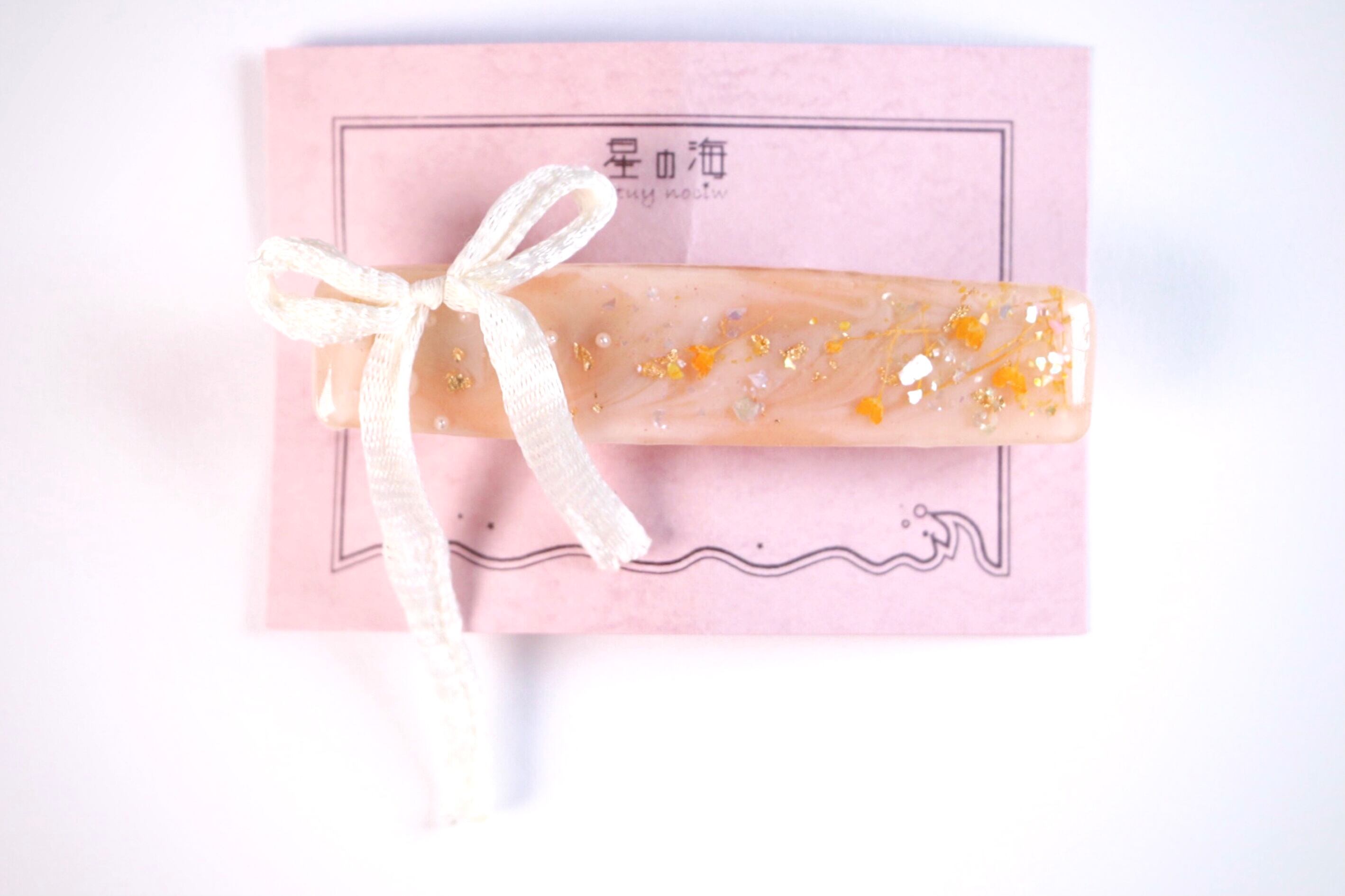ハンドメイド アクセサリー レジン ヘアアクセ バレッタ ロング オレンジ リボン シェル キラキラ かわいい きれい プレゼント ギフト パール かすみ草 成人式 着物 ドレス おすすめ 晴れの日 ドライフラワー 金箔 豪華 ガーリー ナチュラル