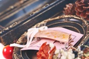 下の層にはオレンジとクリーム色をマーブル模様に敷いて、贅沢に金箔を。左にはパール、右にはオレンジのかすみ草を配置してメリハリをつけつつ、全体にシェルを振りかけることでまとまりを出しています。