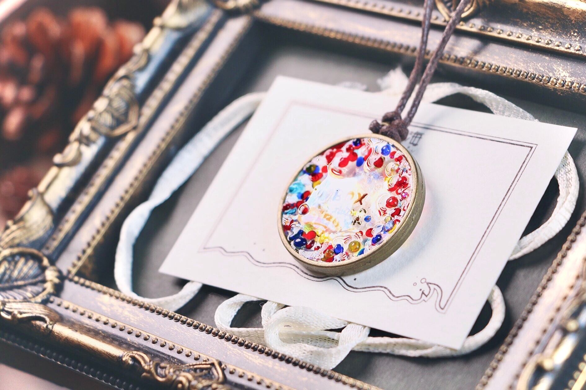 ハンドメイド アクセサリー ペンダント レジン カラフル インテリア クリスマス オーナメント 玄関 レインボー ガラス 粒 手描き おどけ箱 イベント 函館 キラキラ オーロラ 赤 青 黄色 水色 緑 ゴールド ポップ レトロ かわいい ビー玉