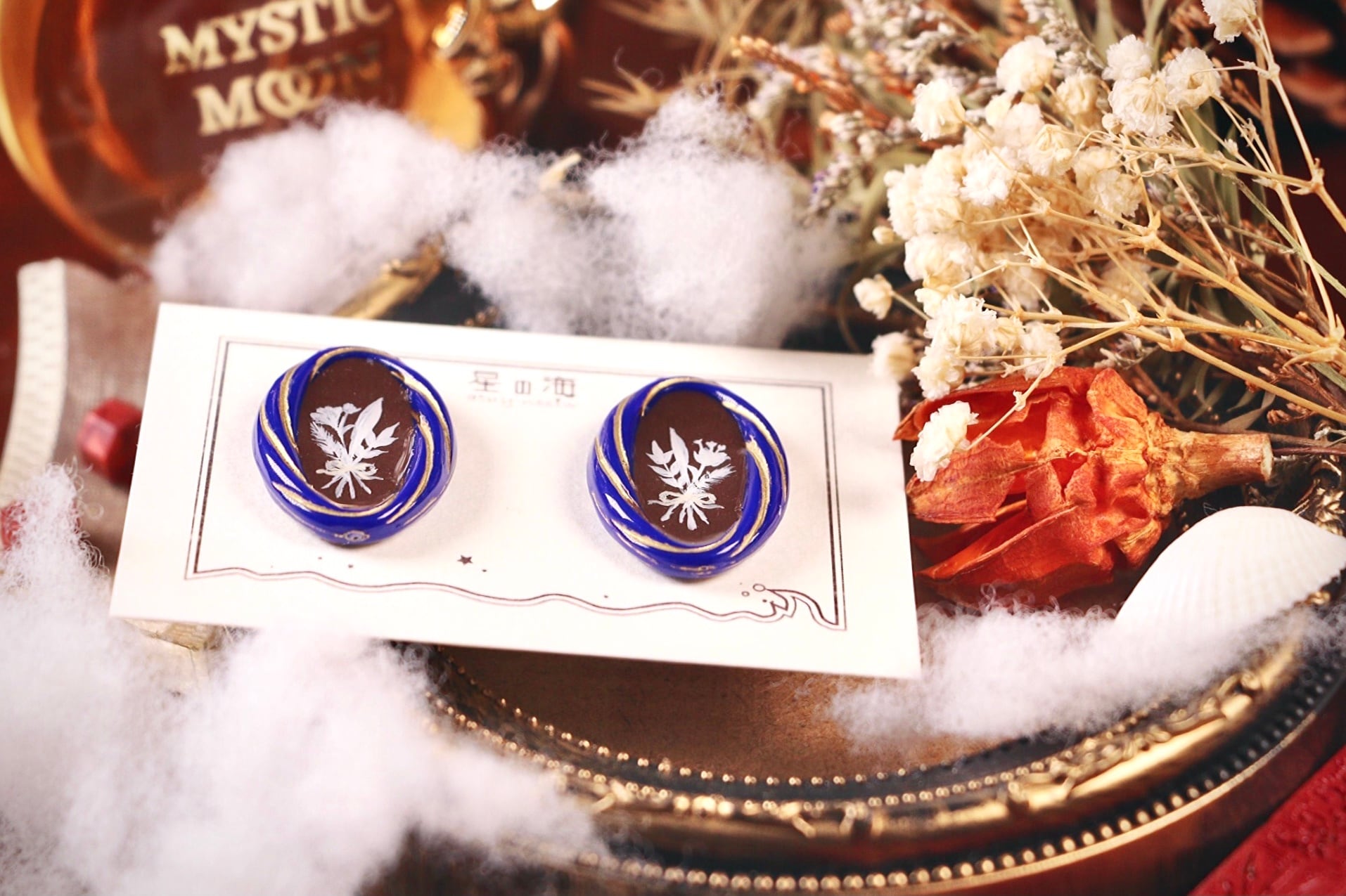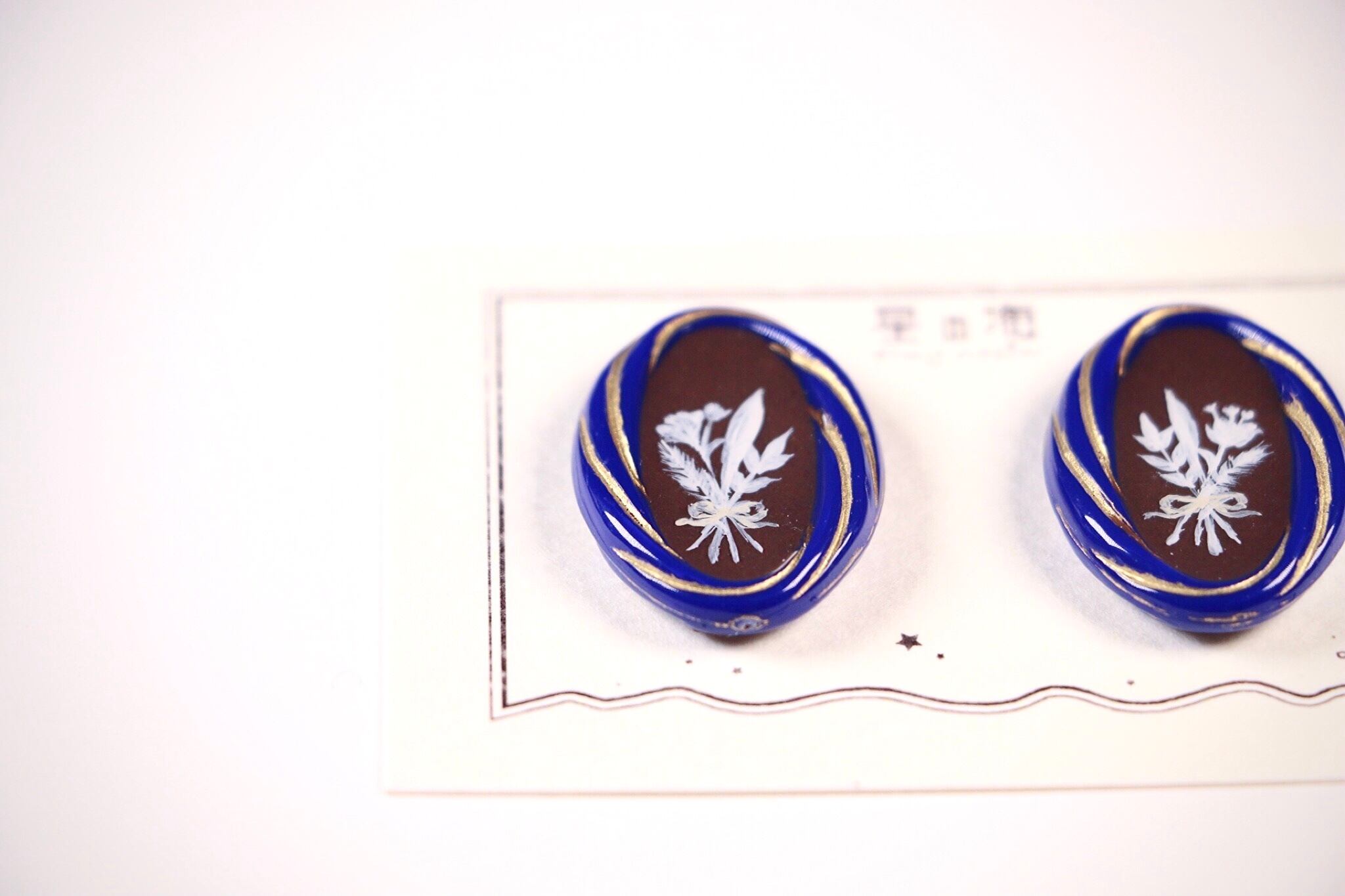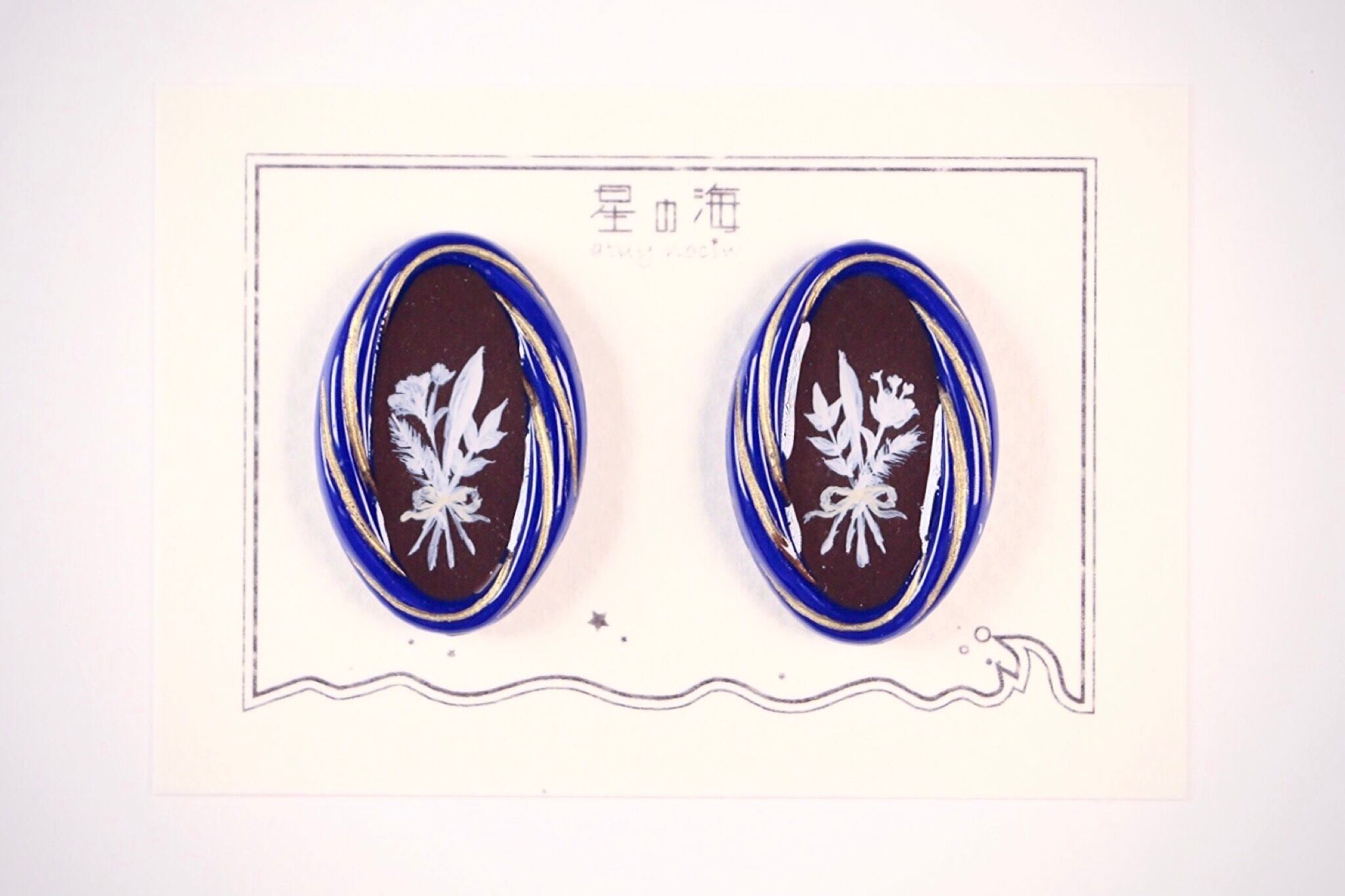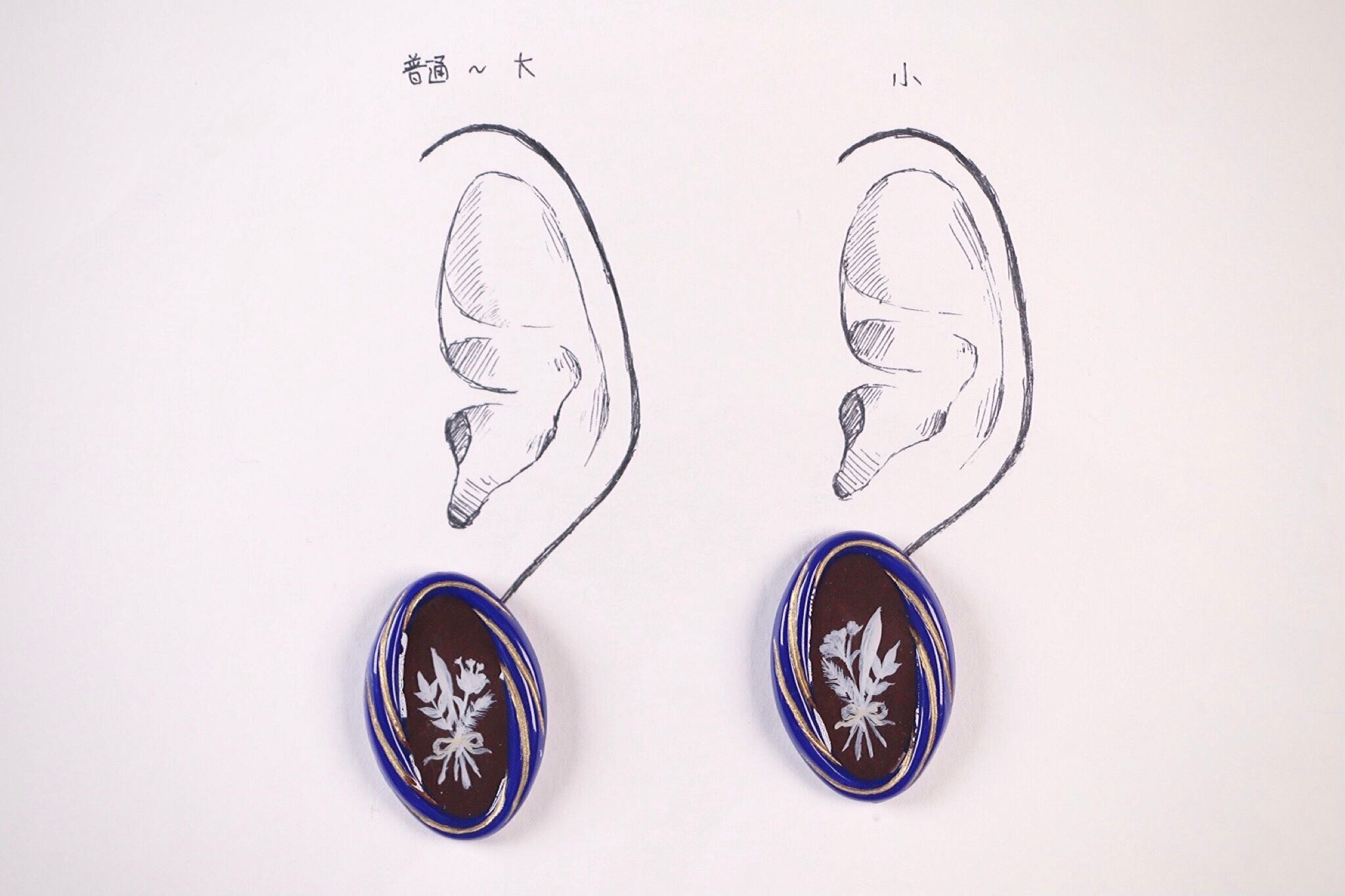 ハンドメイド アクセサリー レジン ピアス イヤリング ノンホールピアス シック アンティーク ヴィンテージ 手描き ドライフラワー 花束 青 茶色 大ぶり 大きめ かわいい きれい ファッション コーディネート フェミニン ガーリー レトロ 軽い プレゼント ギフト 彼女 恋人 クリスマス おすすめ