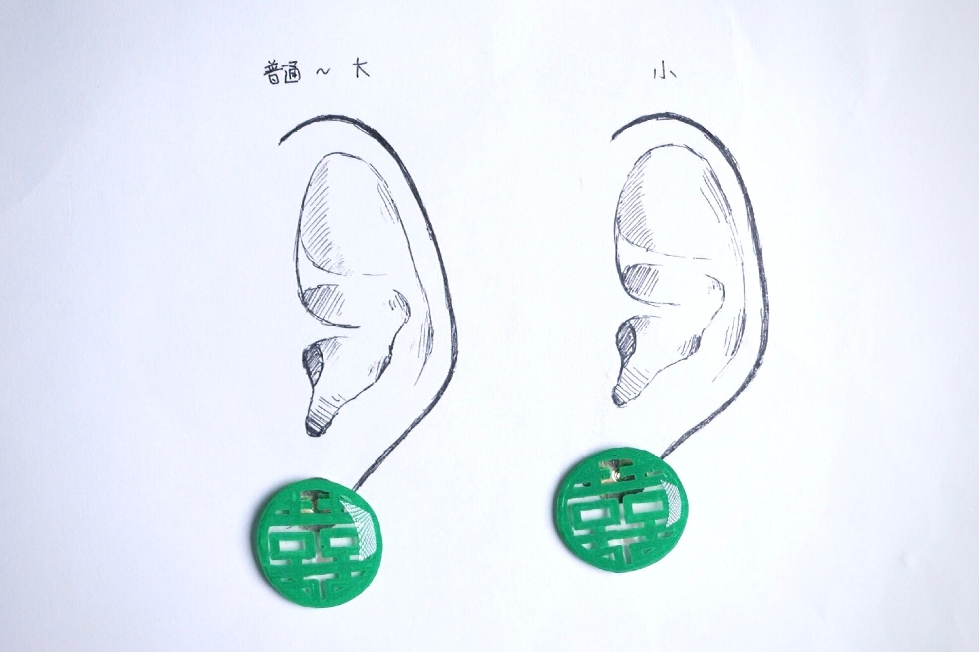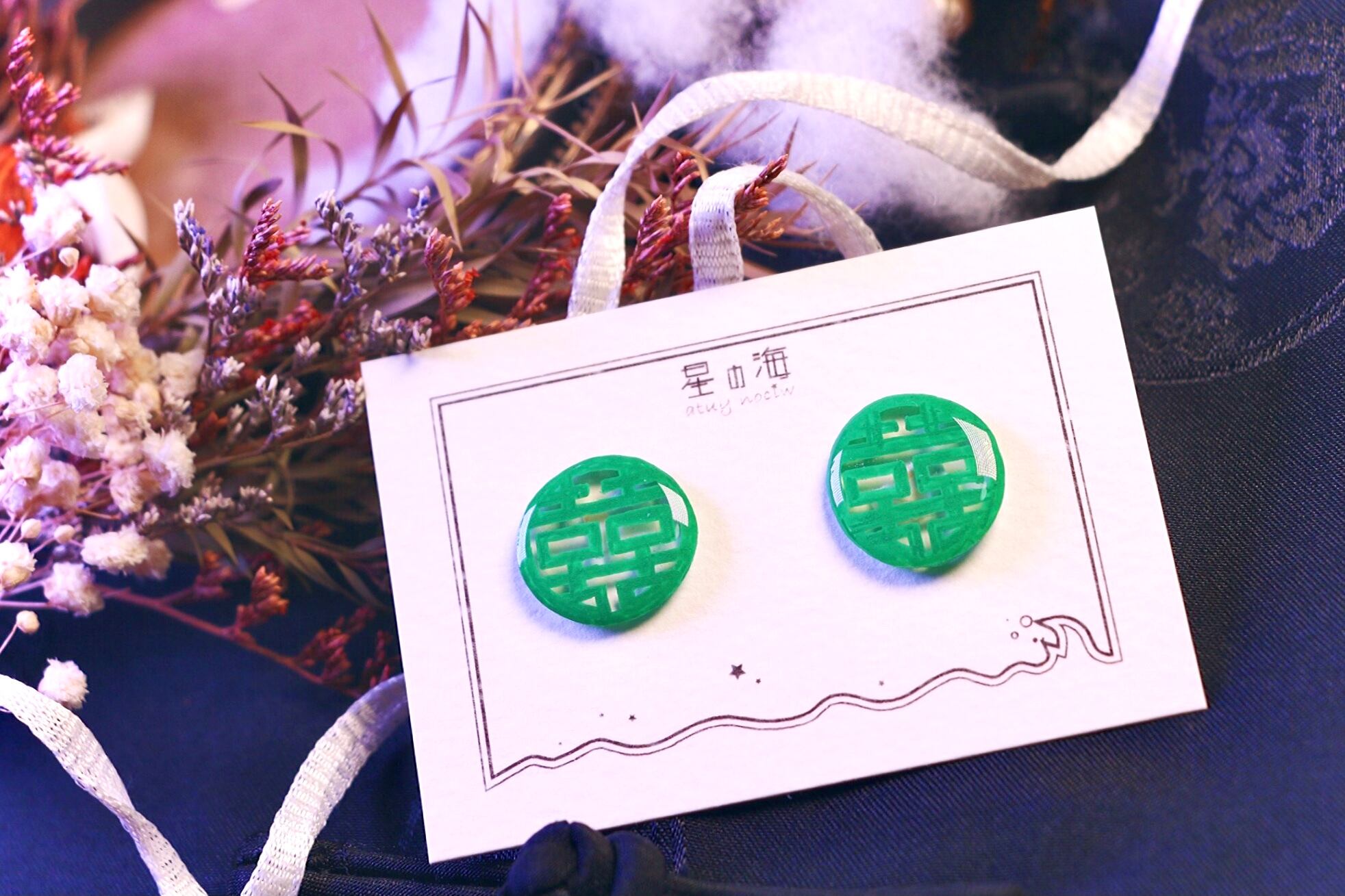 今回は緑で手描きした双喜紋をランダムに丸みのある形にして、裏側は透明なままで仕上げています。