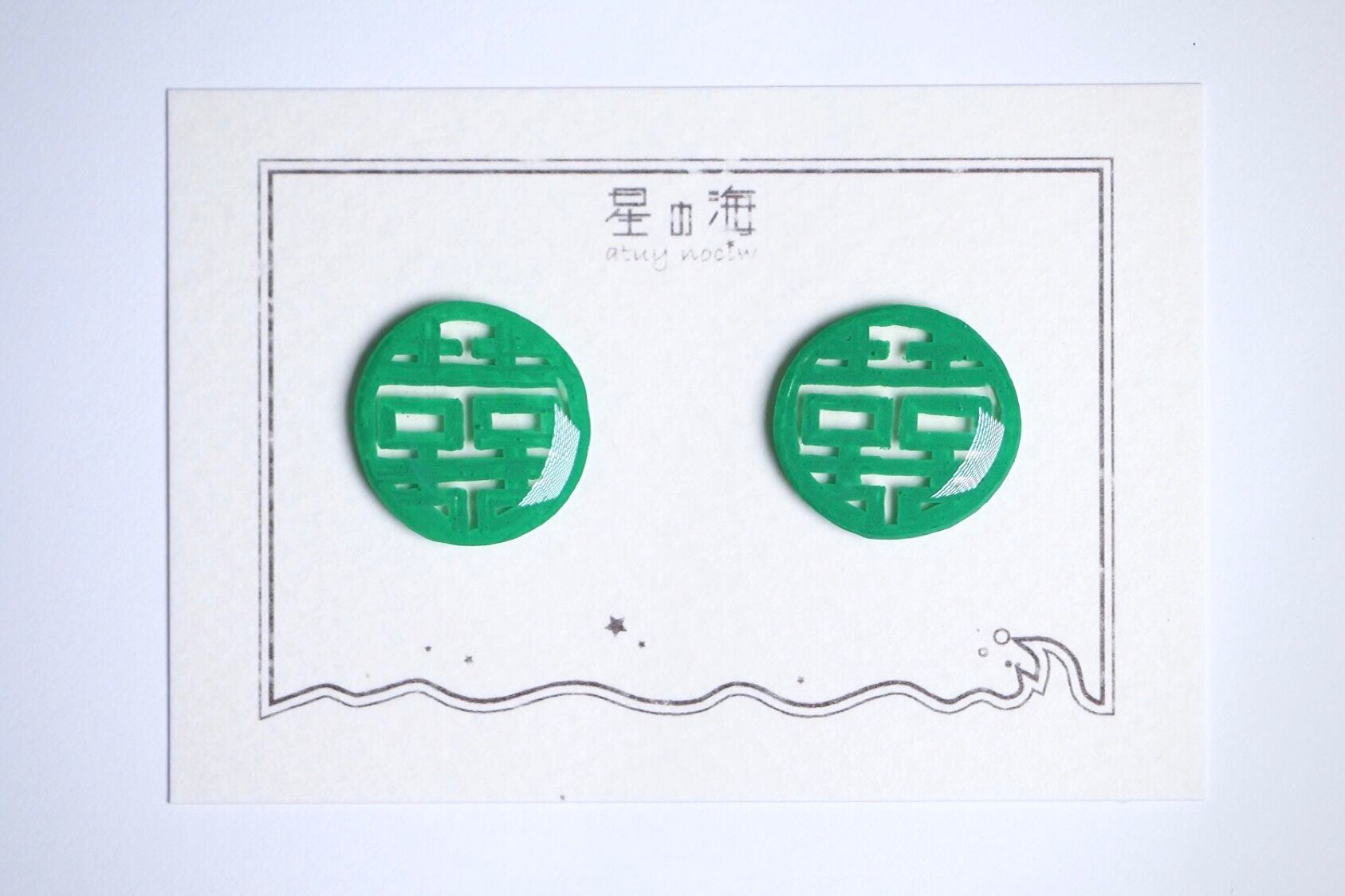 ハンドメイド アクセサリー レジン プラ板 チャイナ 服 シャツ コーディネート ファッション ネオン 看板 手描き ピアス イヤリング ユニセックス 男女 兼用 柄 中華 個性的 大ぶり 緑 グリーン シンプル お洒落