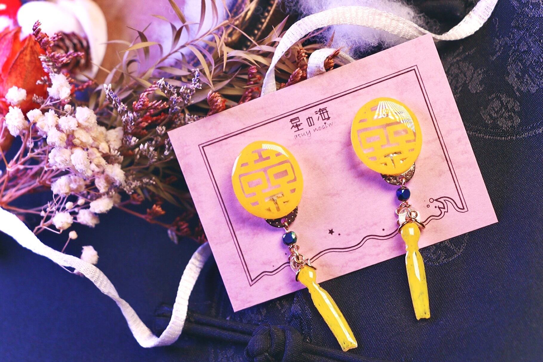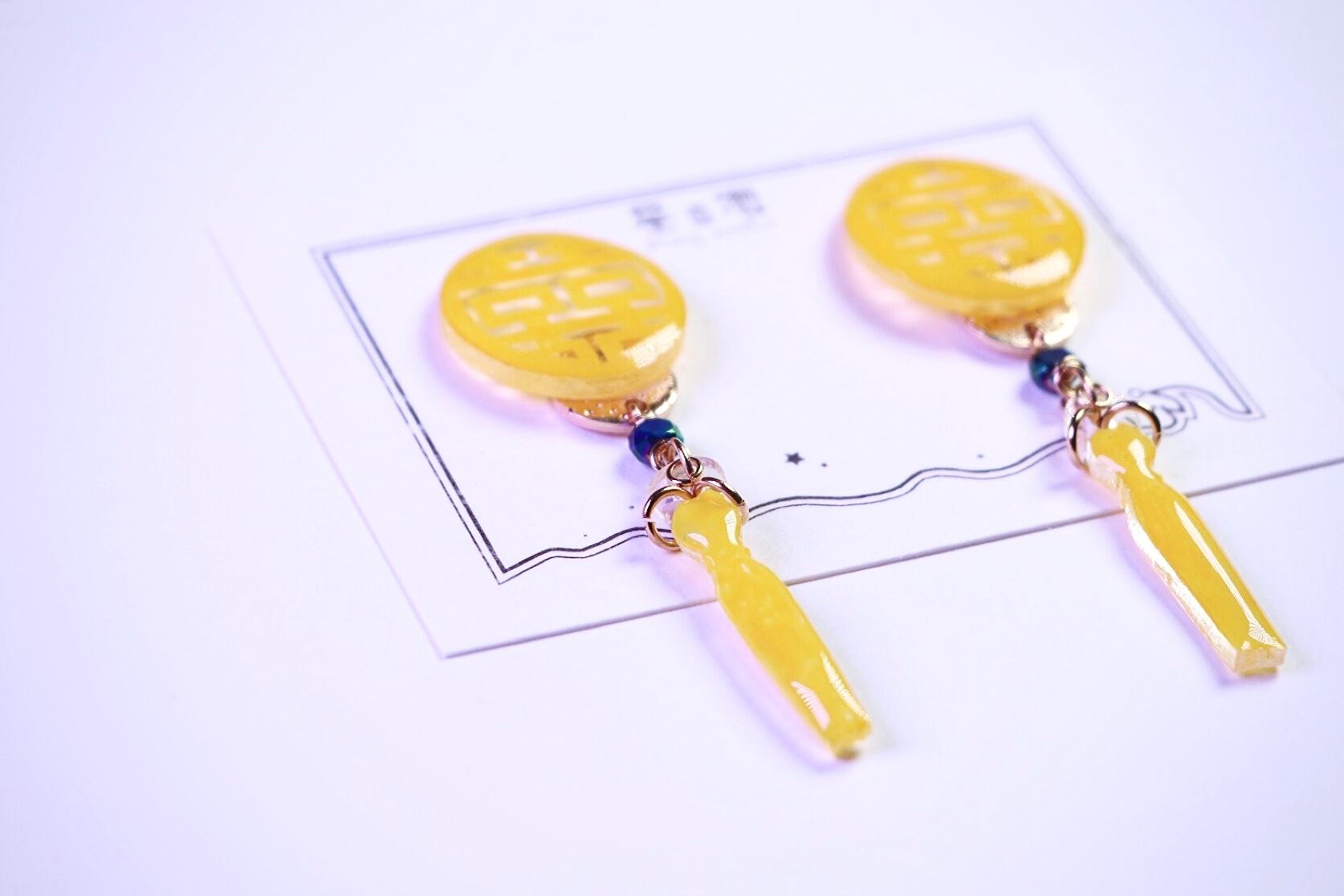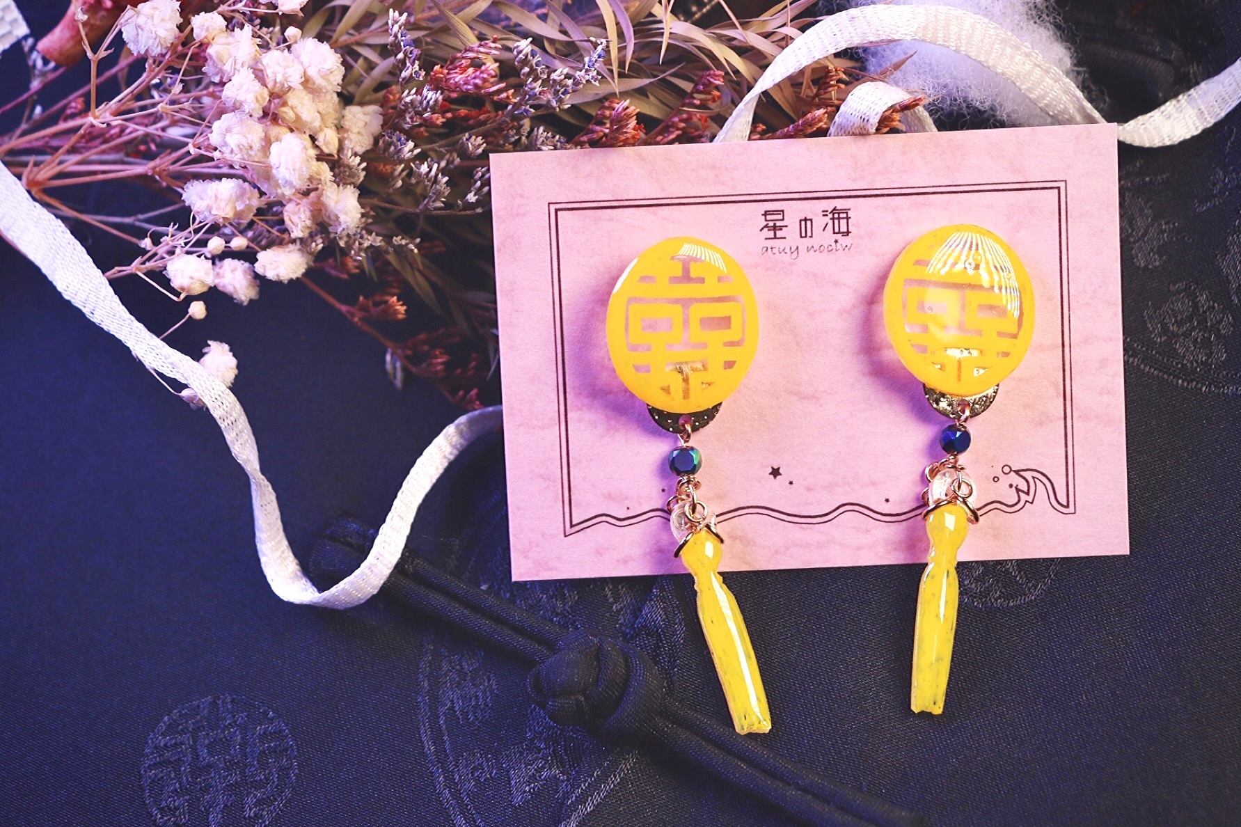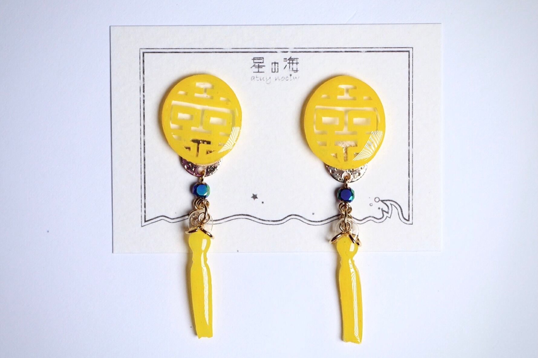 ハンドメイド アクセサリー レジン プラ板 チャイナ 服 シャツ コーディネート ファッション 黄色 イエロー ネオン 看板 手描き ゆらゆら 揺れる ピアス イヤリング ゴールド 青 キラキラ ユニセックス 男女 兼用 柄 中華 個性的 大ぶり タッセル じゃらしゃら