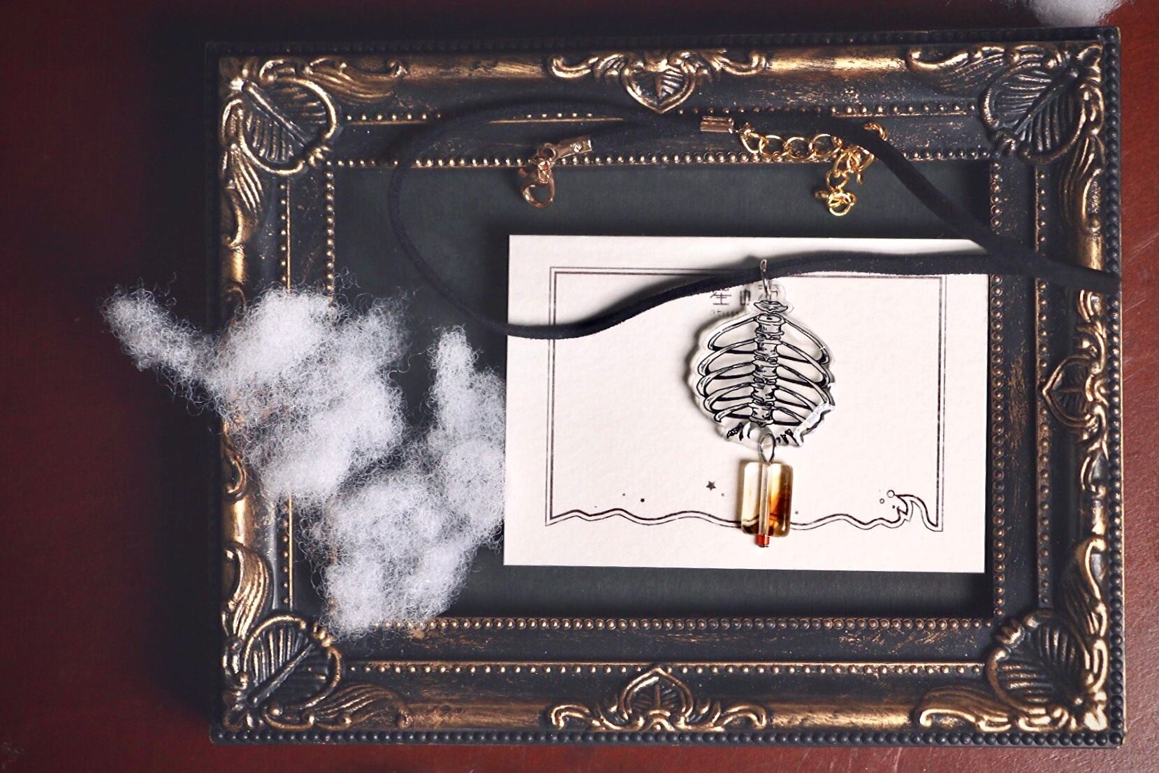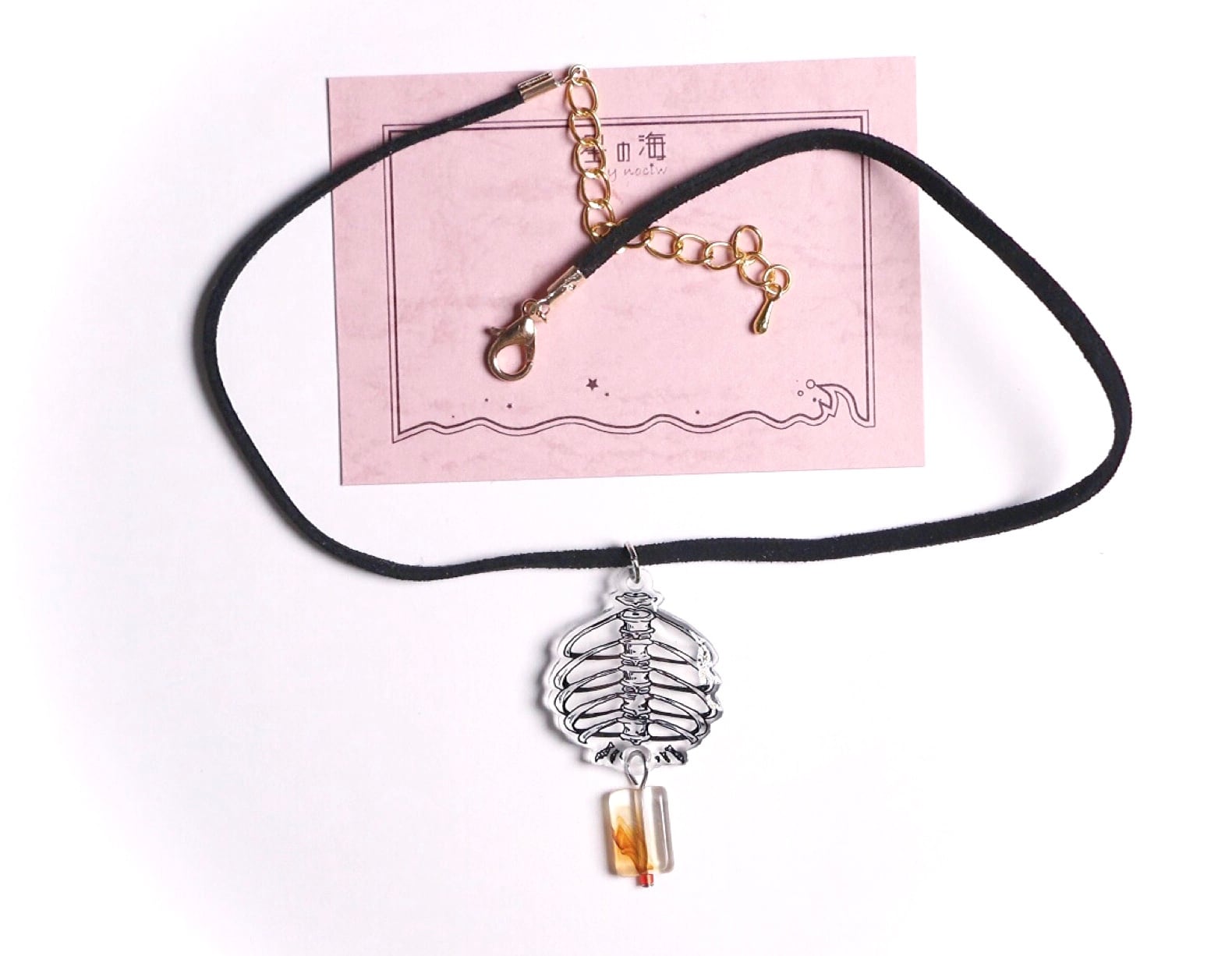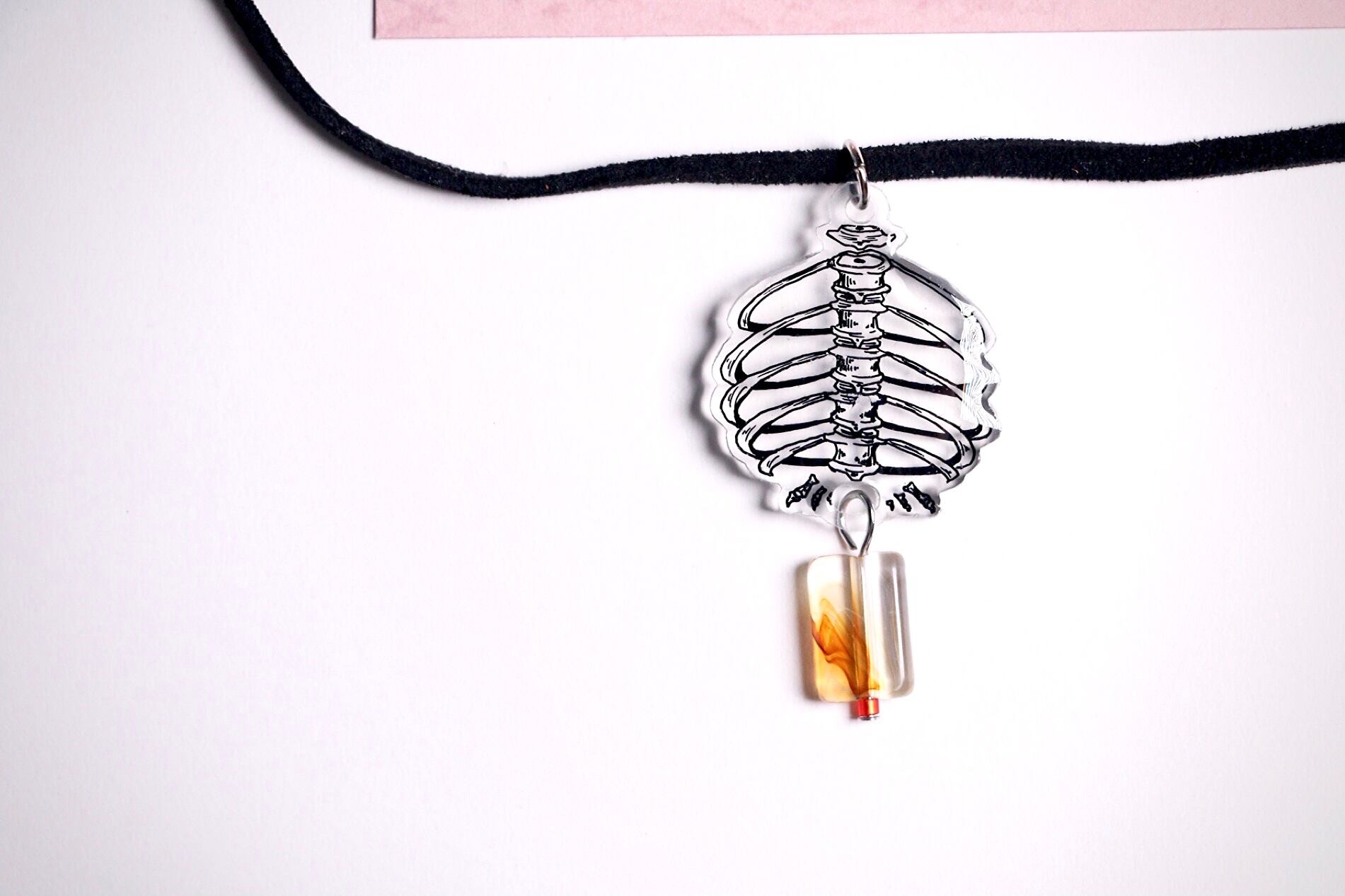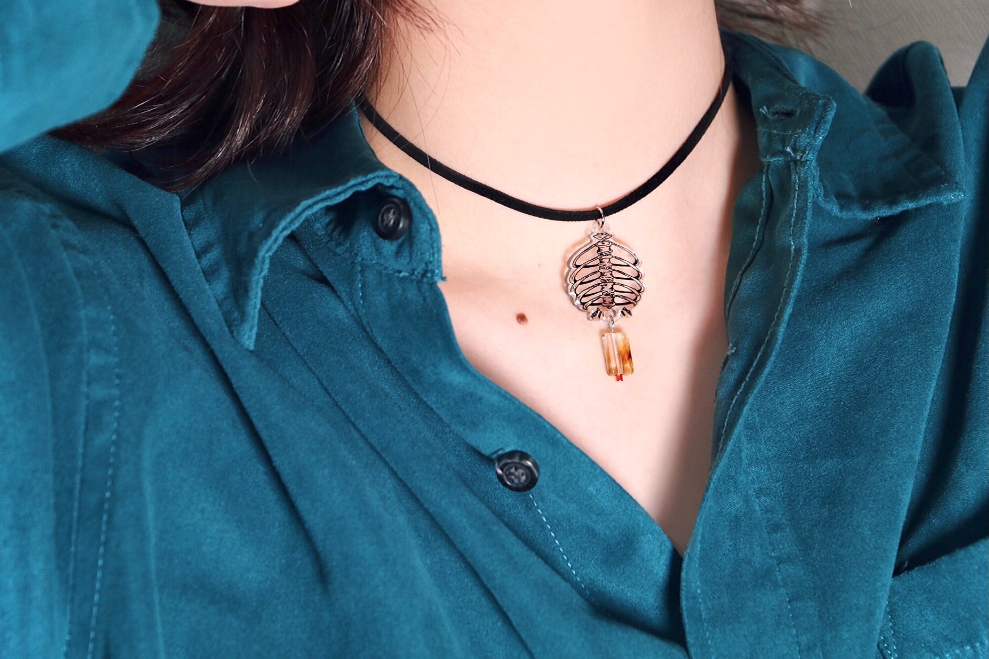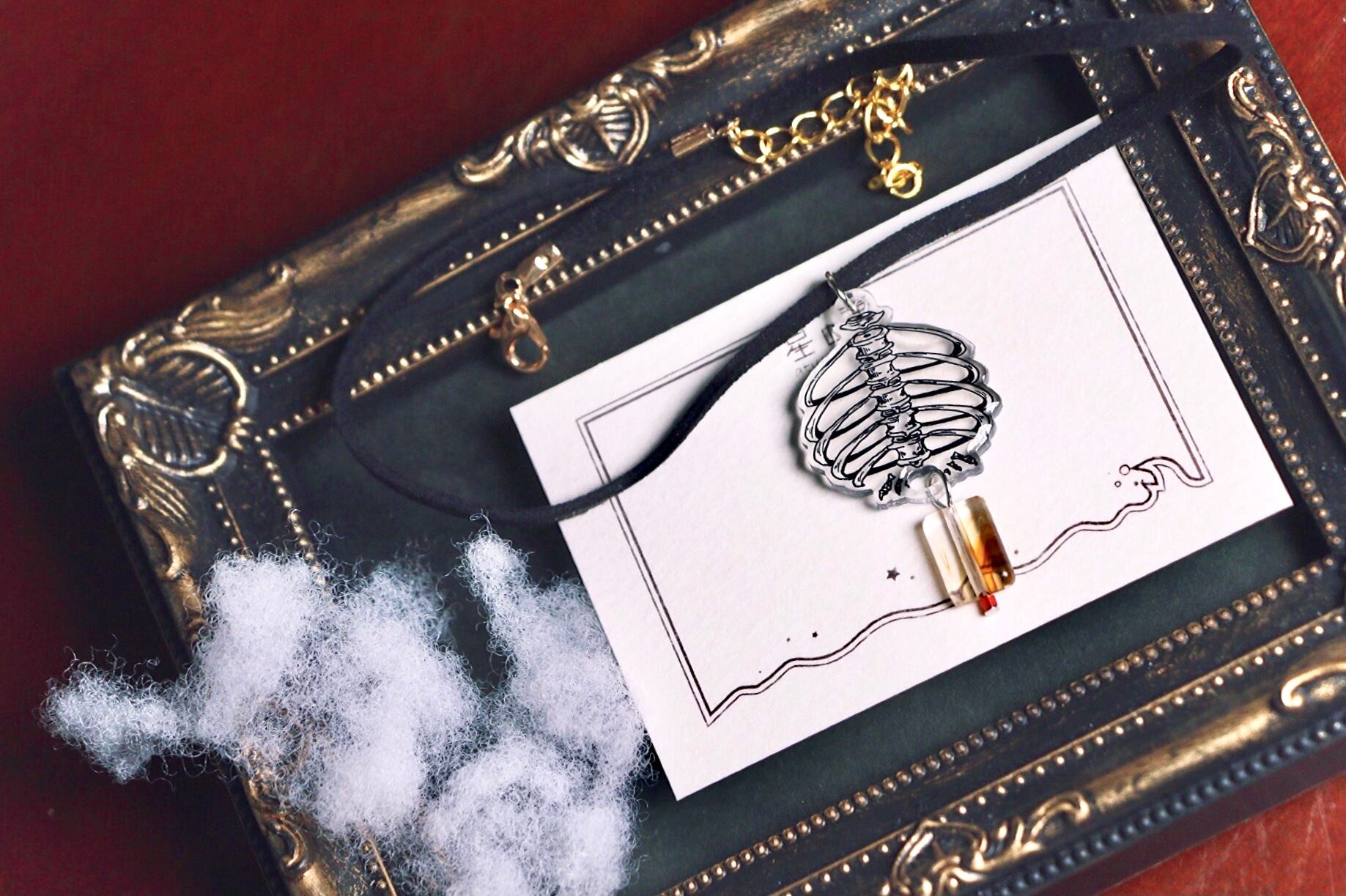 ハンドメイド アクセサリー チョーカー ネックレス 骨 肋骨 指 背骨 血 薬品 ファッション コーディネート 個性的 地雷系 黒 ブラック クリア 透明 シルバー 赤 パンク かっこいい プレゼント 彼氏 彼女 おすすめ 大きめ 大ぶり レジン プラ板 手描き