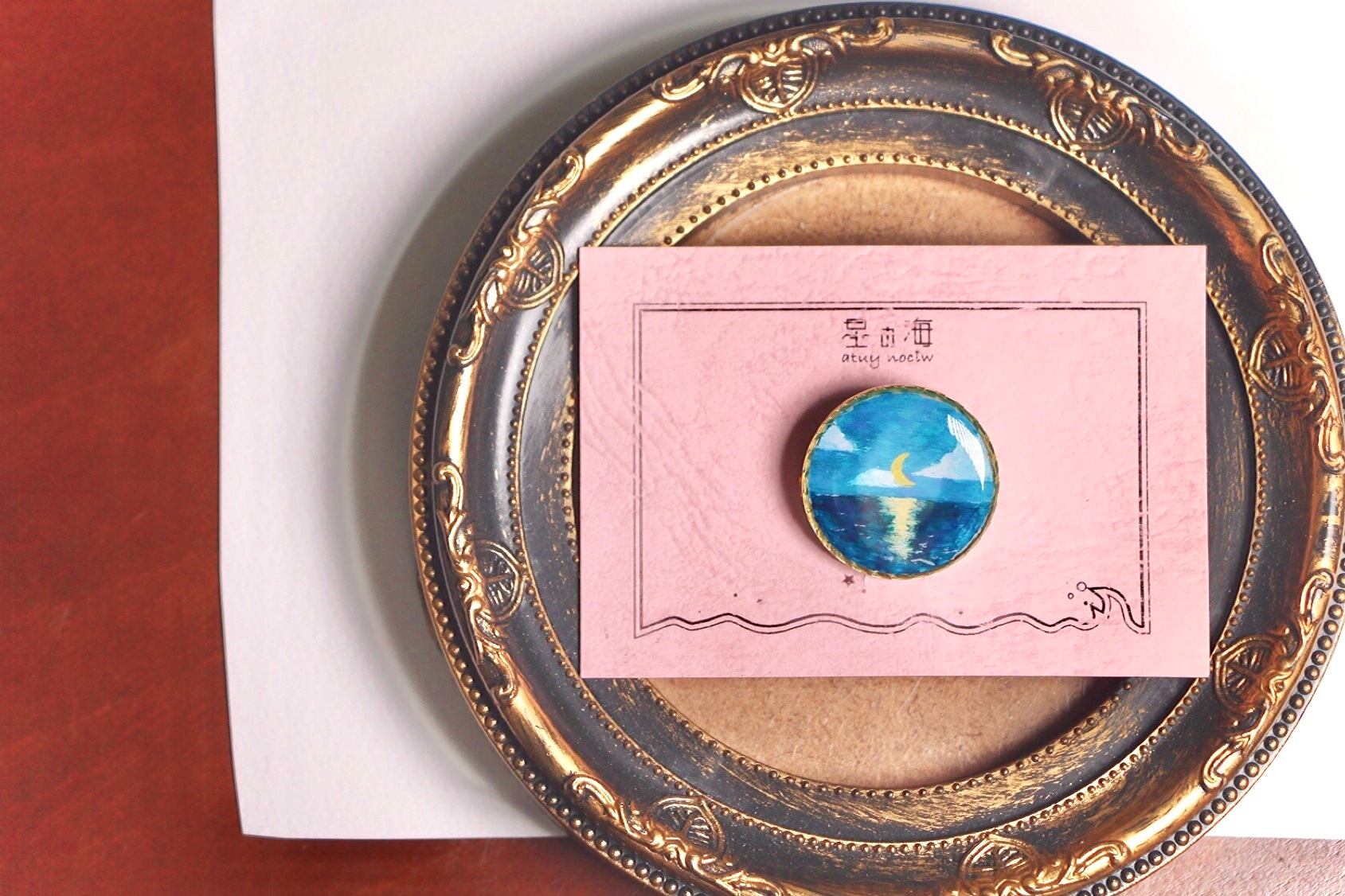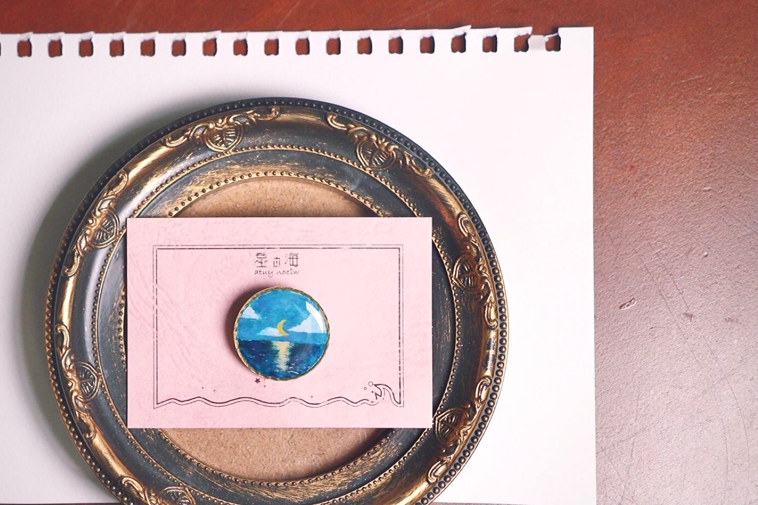 ゴールドのデザイン丸枠の中に白を敷き詰めて、その上にちょっぴり癖のあるゴッホのようなタッチで海と浮かぶ月を描きました。