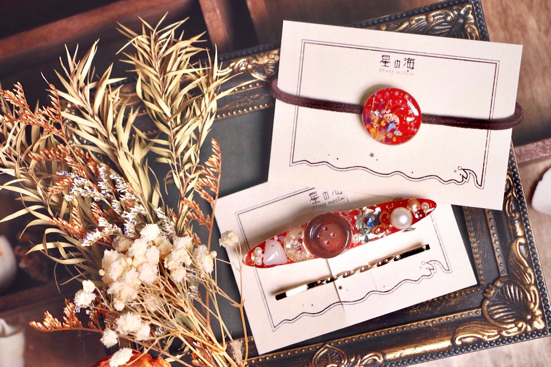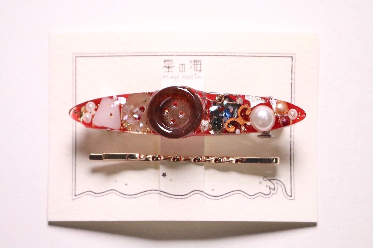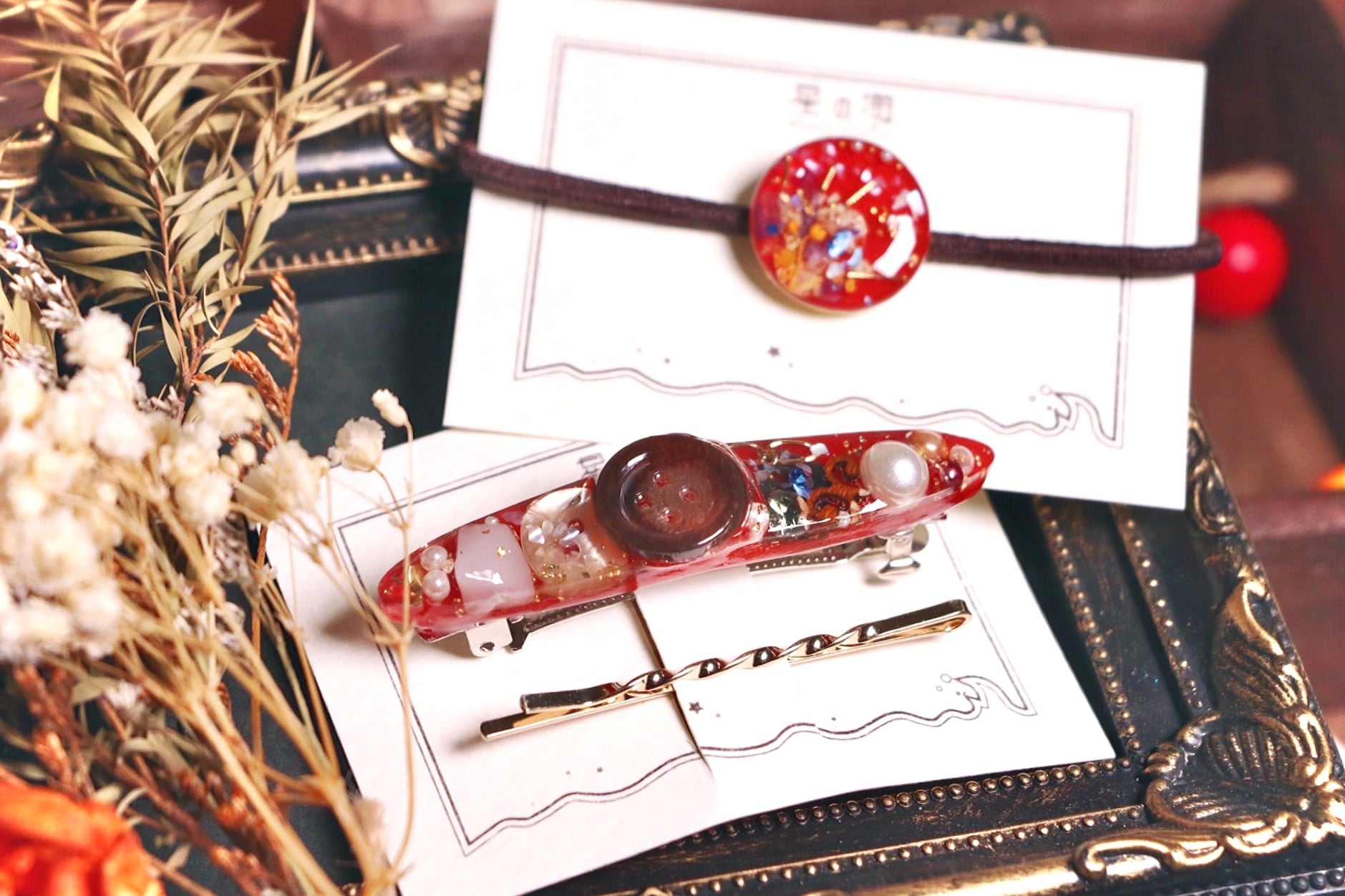 ハンドメイド アクセサリー レジン ヘアアクセサリー ヘアゴム バレッタ ヘアピン レトロ 大正レトロ 昭和レトロ 和洋折衷 ボタン キラキラ 赤 鬼滅 福袋 ネタバレ 2022 新春 初売り お得 かっこいい かわいい パール