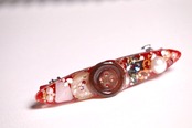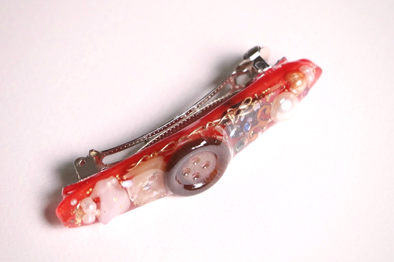 ・大ぶりボタンがポイントのゴツめバレッタ作品。こちらも底には赤を敷いて、金のチェーンを沈めています。中にはぎっしりさざれビーズや大きも色も様々なパール、木のデザインパーツ、金の端パーツ、緑やアイスブルーのキラキラストーンもパラパラ。ボタンは3種類、それぞれ層になるように配置することで立体感を出しています。