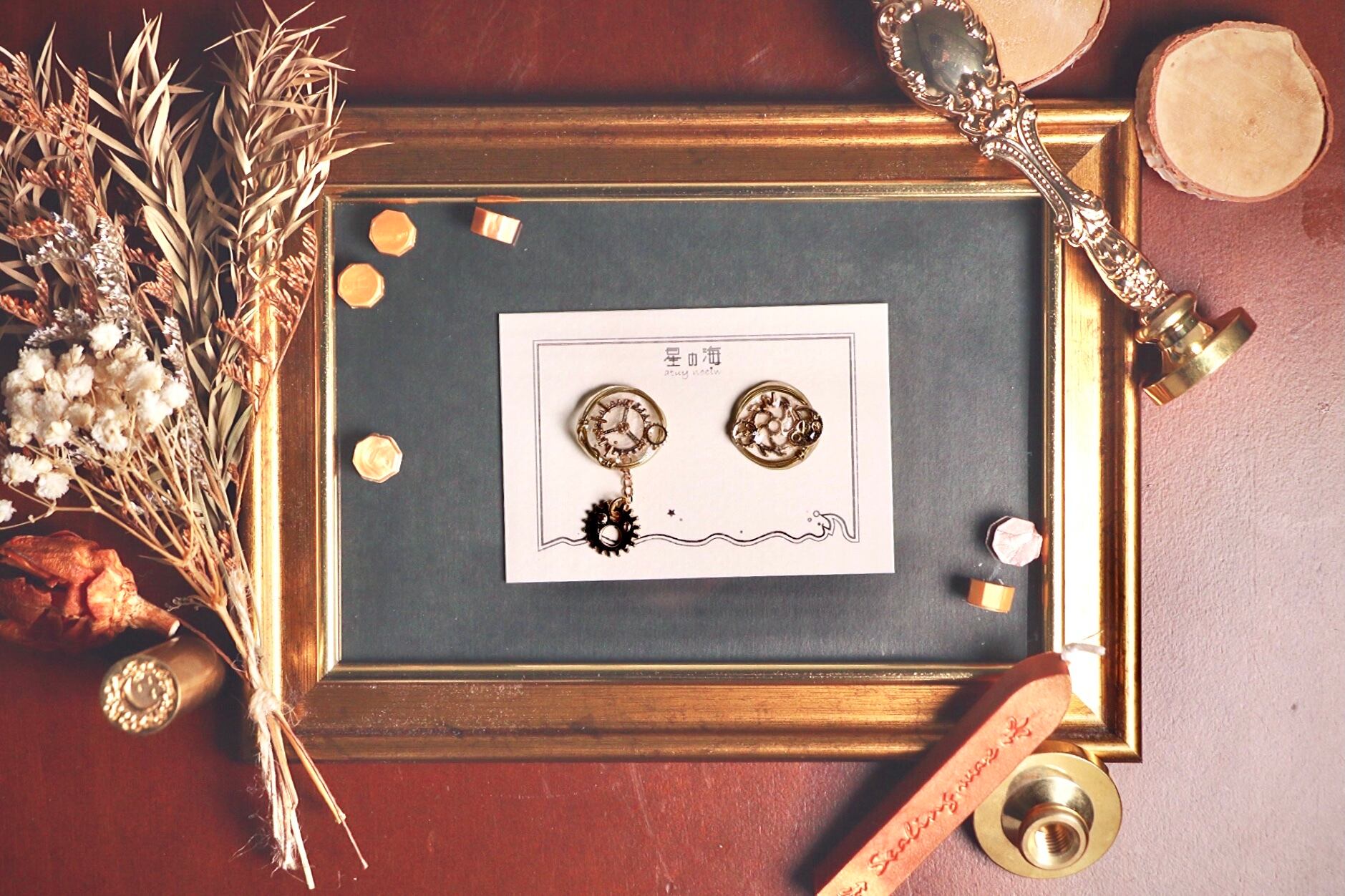 トップはどちらもワイヤーを捻って程よい大きさの丸に。中には大きめの歯車を閉じ込めて、周りに指針のような端パーツとブリオンを。外側にはみ出した小さな歯車たちがちょっぴり不思議な雰囲気を与えてくれるユニセックスデザイン♪