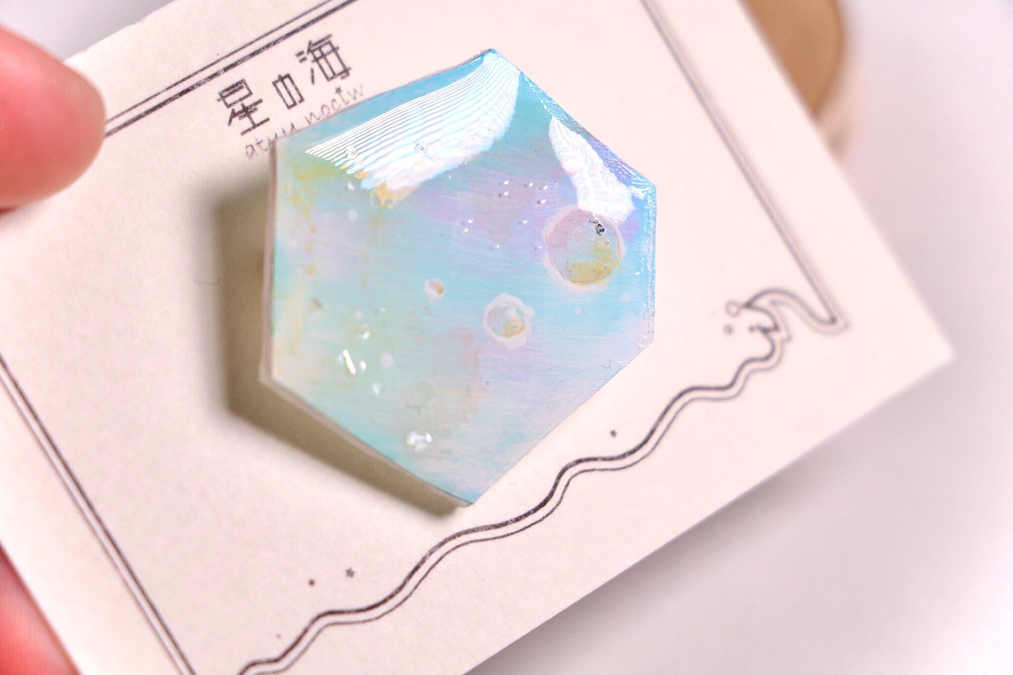 ハンドメイド アクセサリー レジン ブローチ プラ板 手描き 空 シャボン玉 大きめ 絵画 キラキラ きれい かわいい 不思議 イラスト ネオン カラー パステル シャーベット 色使い バッグ コート ファッション コーディネート