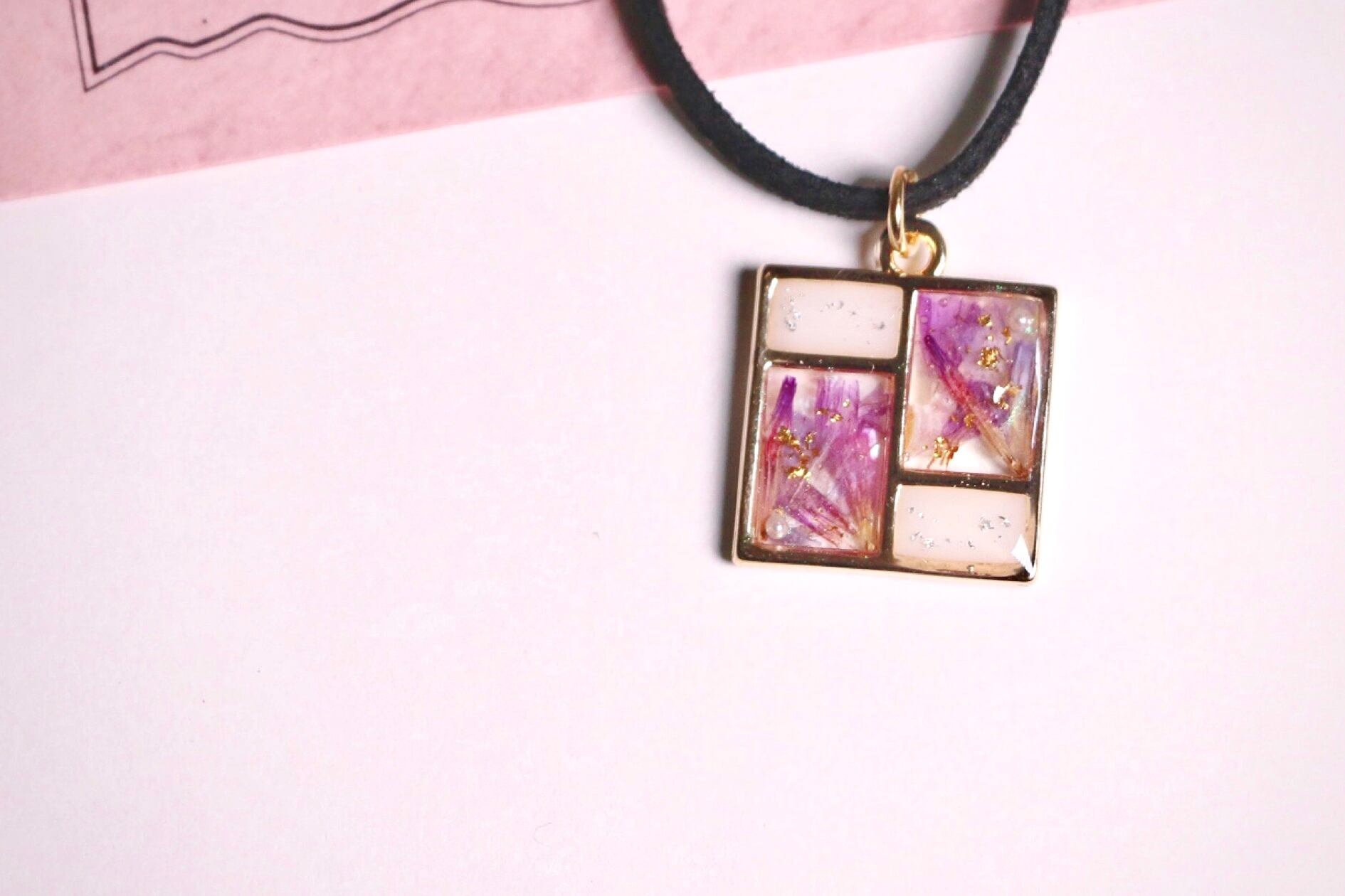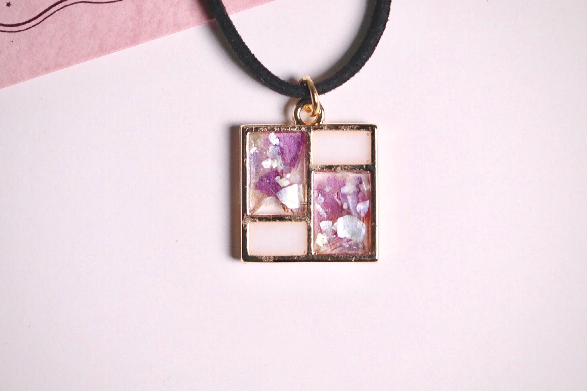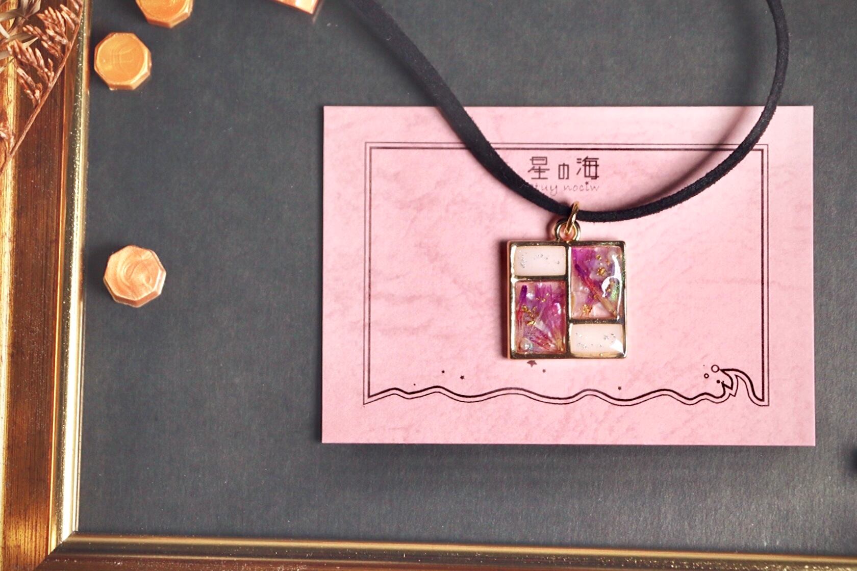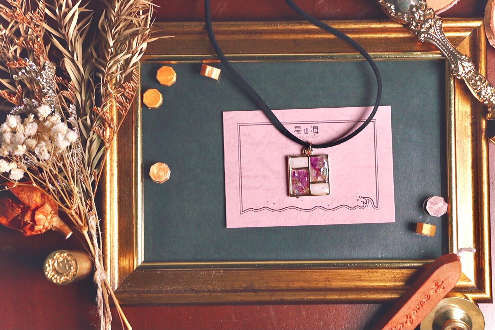 ハンドメイド レジン アクセサリー チョーカー ネックレス ゴールド ステンドグラス ドライフラワー 紫 キラキラ パール 黒 オーロラ 宝石 アメジスト 大人っぽい ミステリアス 不思議 ファッション コーディネート かわいい きれい