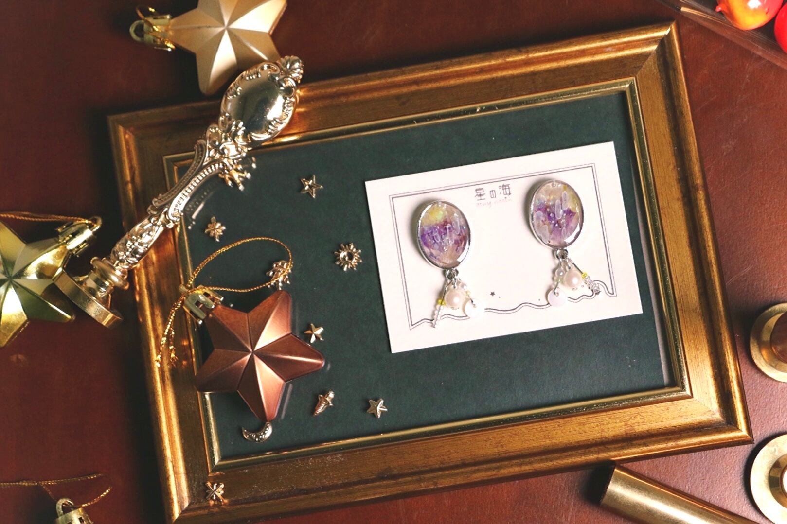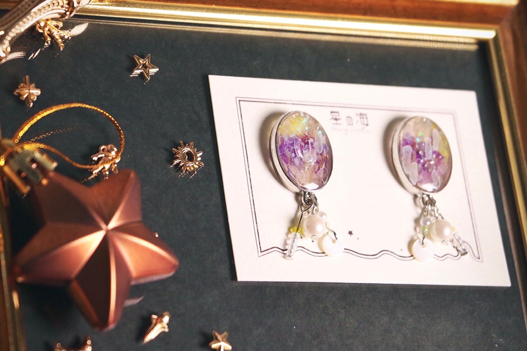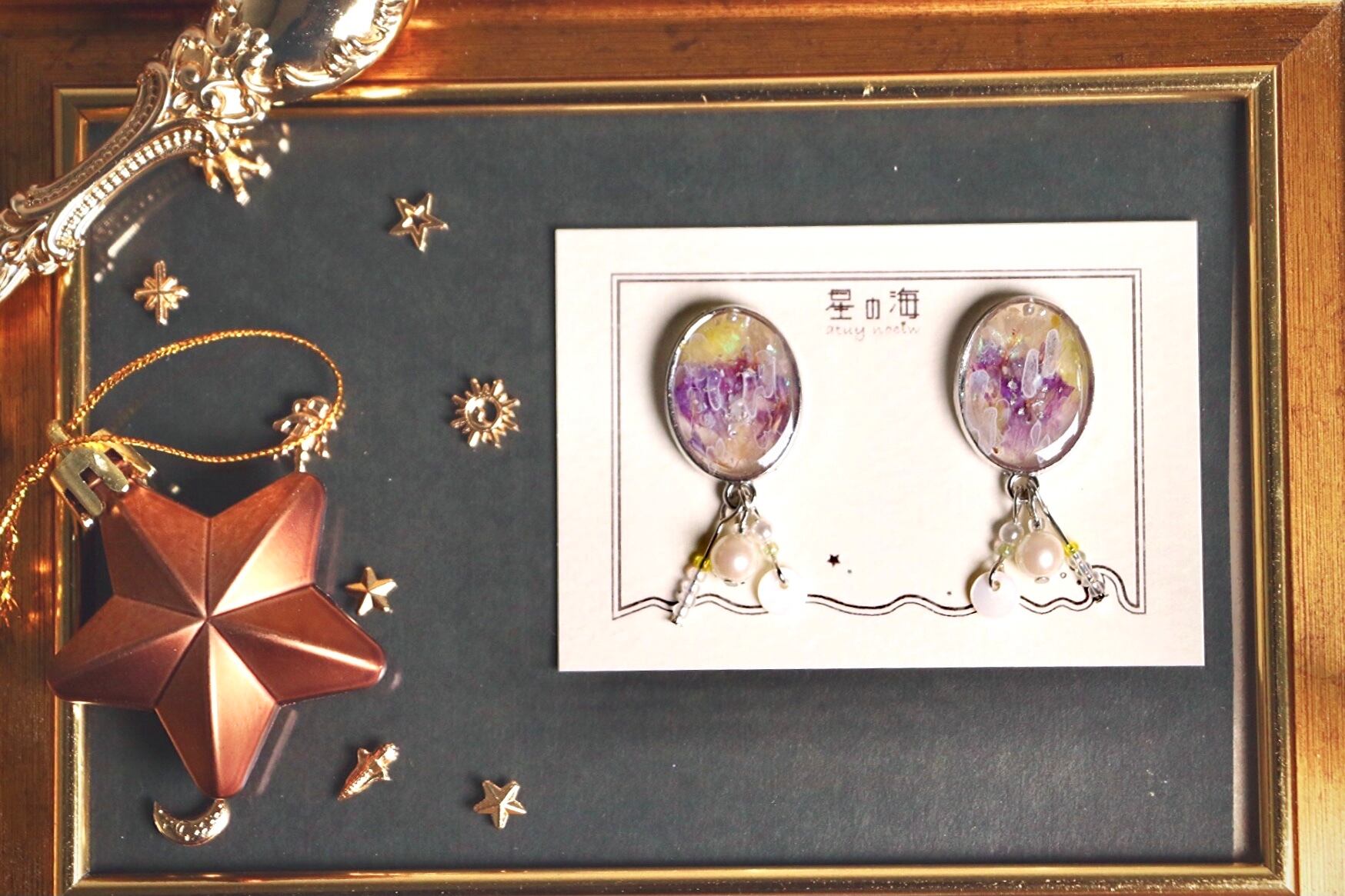 ハンドメイド レジン アクセサリー ピアス イヤリング シルバー 大ぶり オーバル ドライフラワー 紫 ピンク 黄色 青 白 キラキラ パール オーロラ 宝石 アメジスト 大人っぽい ミステリアス 不思議 ファッション コーディネート かわいい きれい パール 手描き 水彩 アクリル にじみ