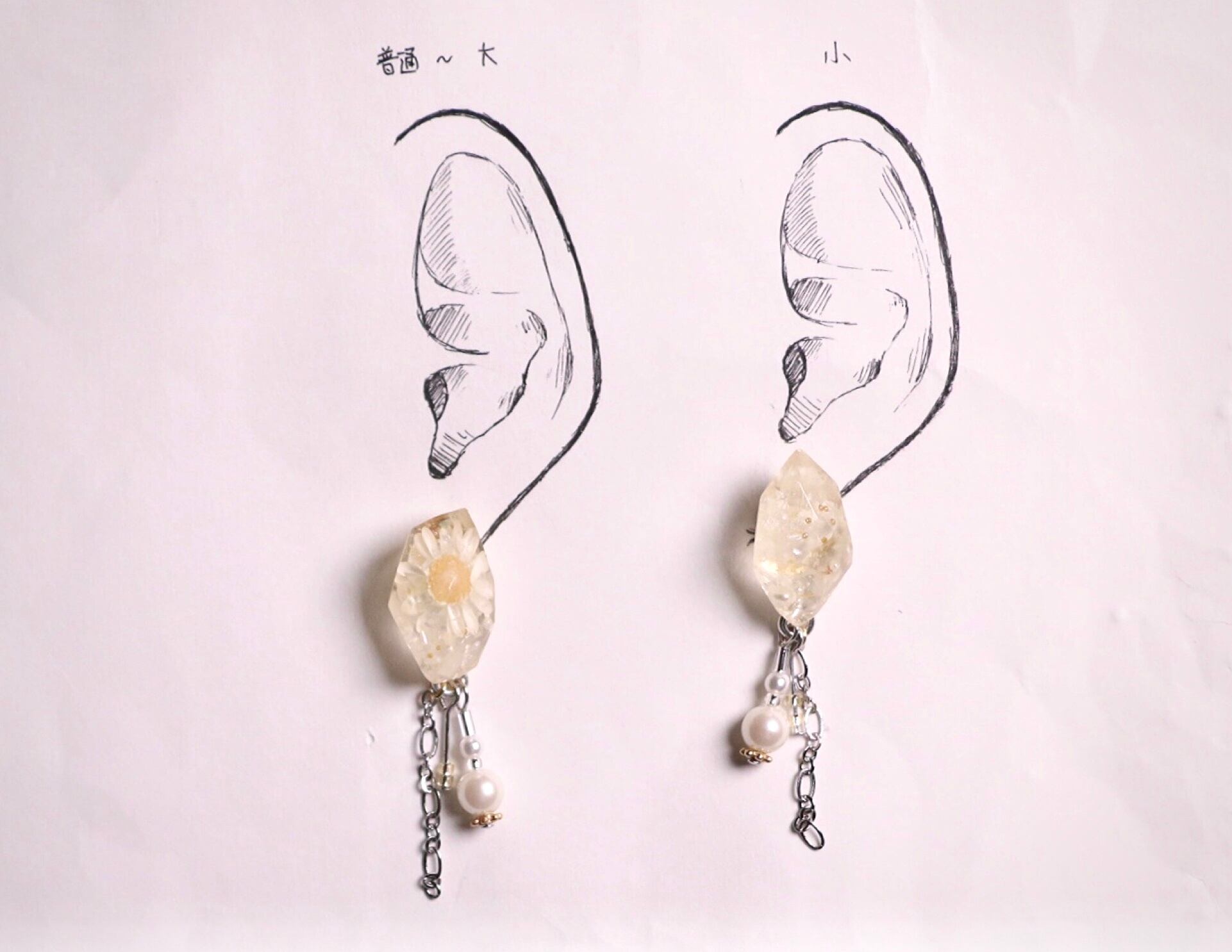 右側は綿毛のような白い花びらを上側にぎゅっと詰め込み、紫陽花やパール、シェルもパラパラ。表面に浮かんだブリオンがミステリアスで可愛らしいです♪