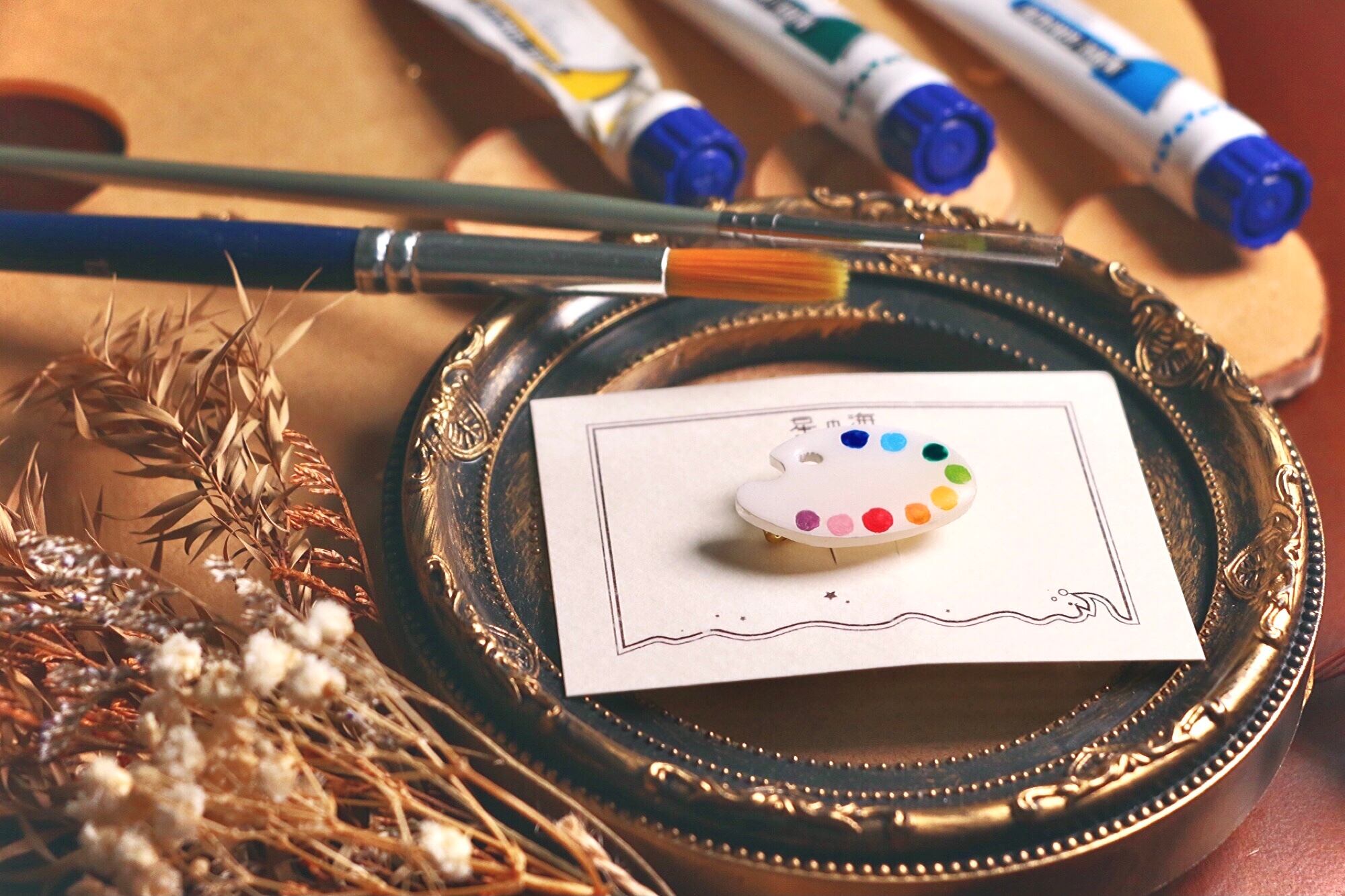 ハンドメイド アクセサリー レジン ブローチ プラ板 手描き 大きめ 絵画 キラキラ きれい かわいい 不思議 イラスト カラー 色使い バッグ コート ファッション コーディネート キャンバス パレット カラフル 小さめ アート マット ビビッド レインボー