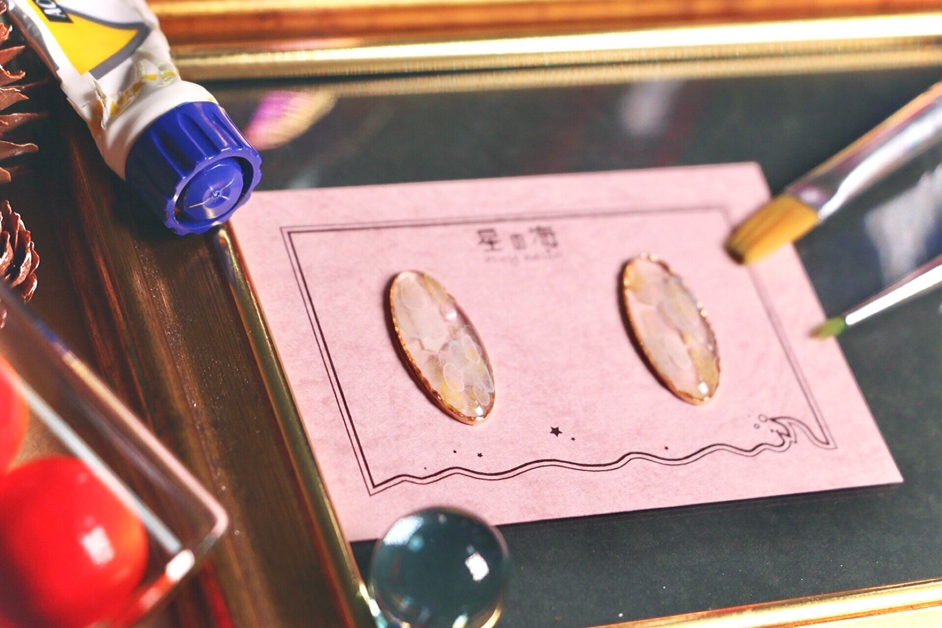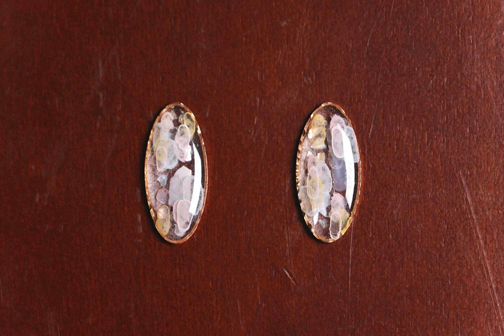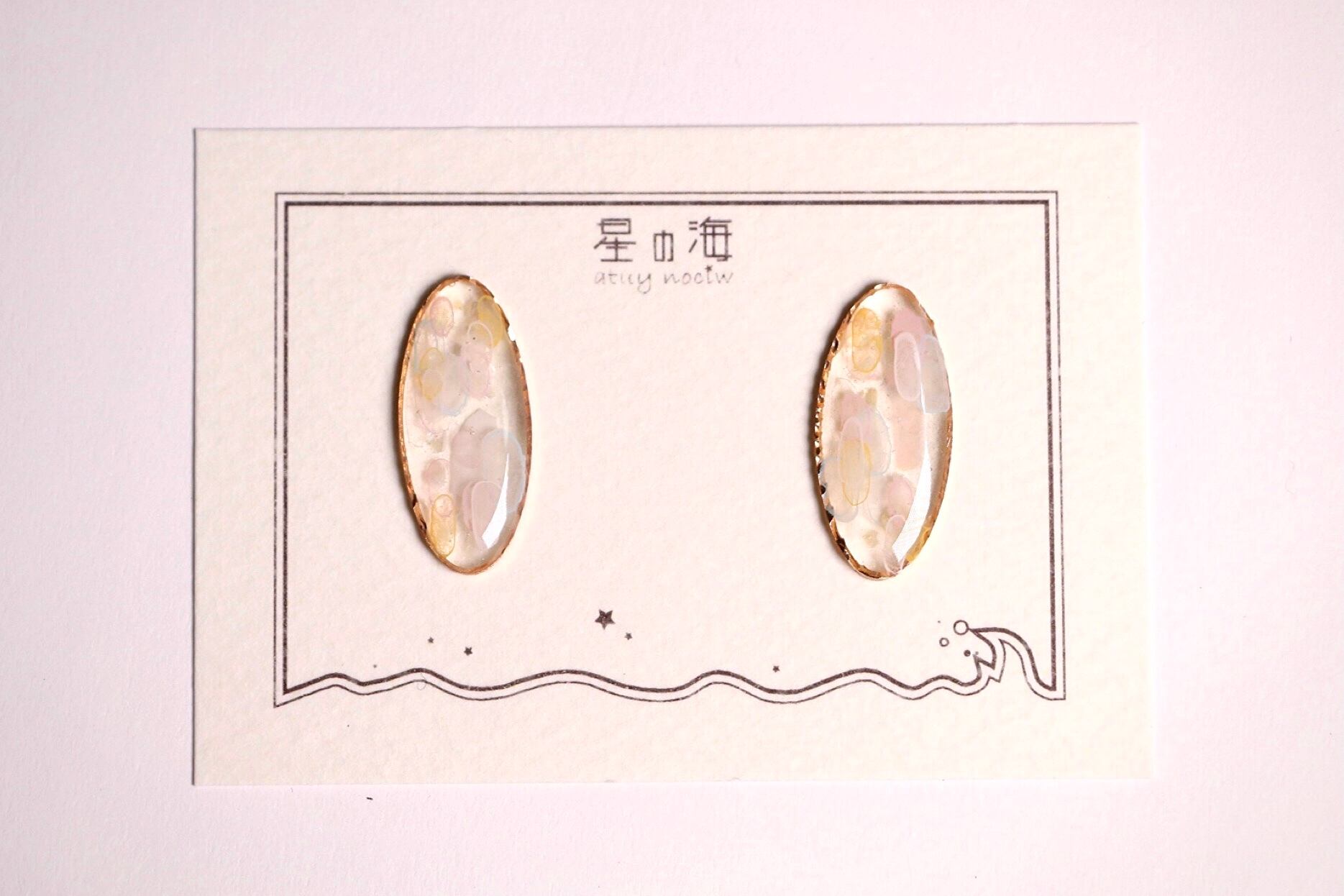 ハンドメイド レジン アクセサリー ピアス イヤリング オーバル 水色 ピンク 黄色 白 キラキラ オーロラ 宝石 アメジスト 大人っぽい ミステリアス 不思議 ファッション コーディネート かわいい きれい 手描き 水彩 アクリル にじみ 水滴 うるうる 透明 クリア シェル ピンクゴールド パステル シャーベット カラー お洒落
