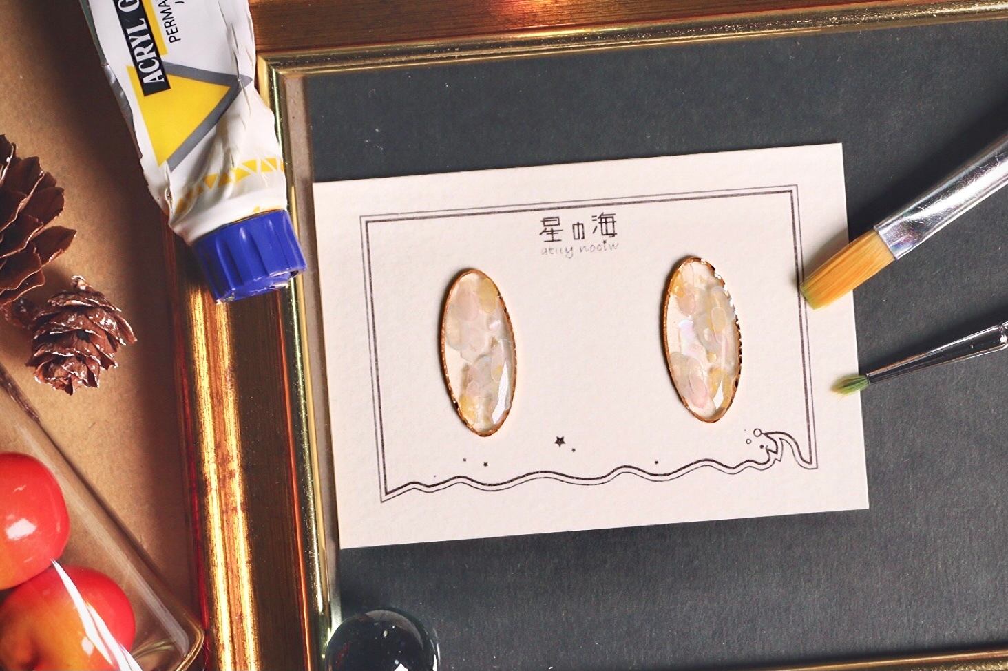 細長いピンクゴールドのオーバル枠には白く大きなシェルを敷き、周りに小さなクラッシュシェルを敷き詰めることでミステリアスな雰囲気に。