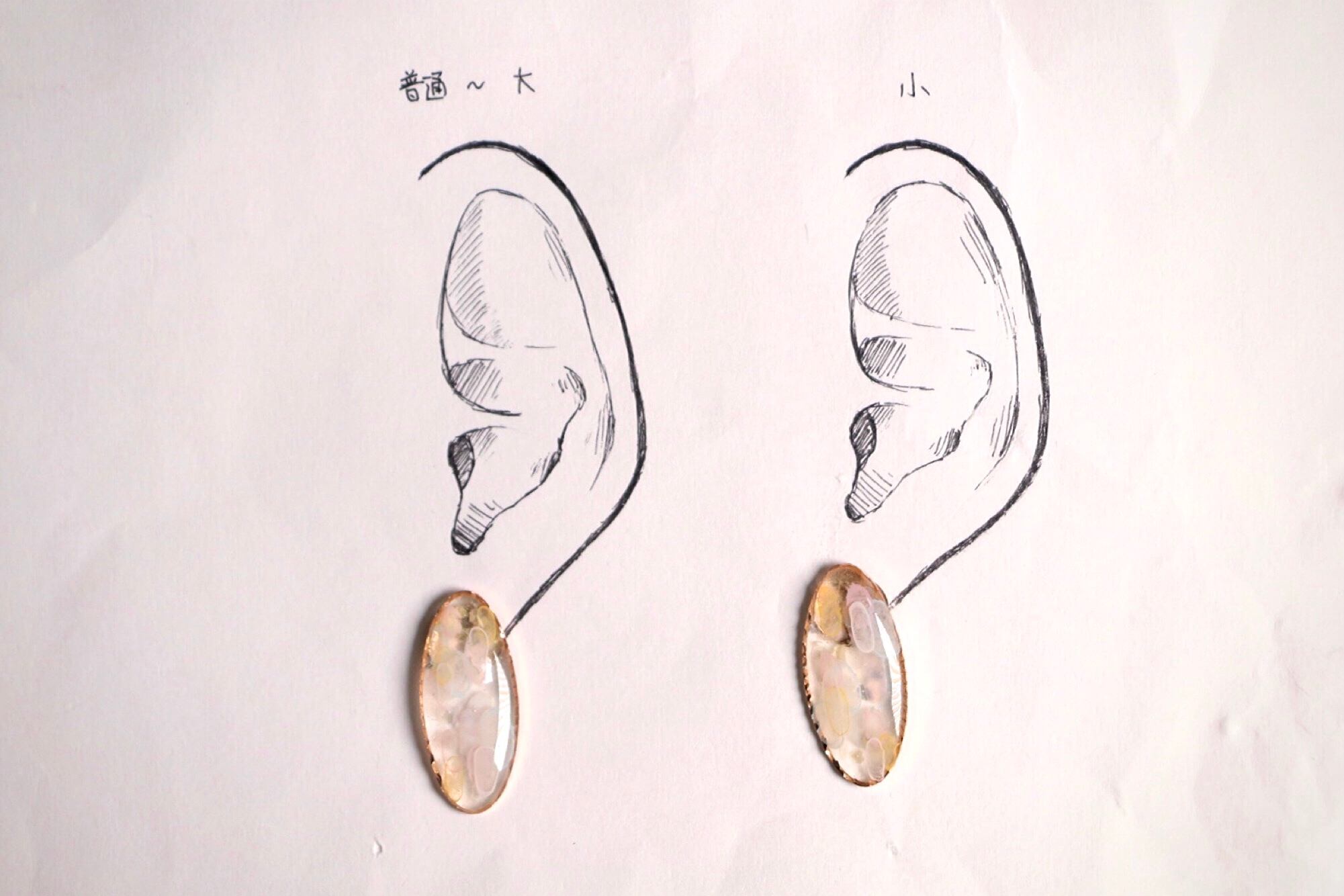 耳につけるパーツをつけていないため、台紙にはマスキングテープで留めている状態です。耳シートの左は平均的な女性の普通〜大きめの耳、右は小さめの耳のモデルとなっております。ご参照ください。