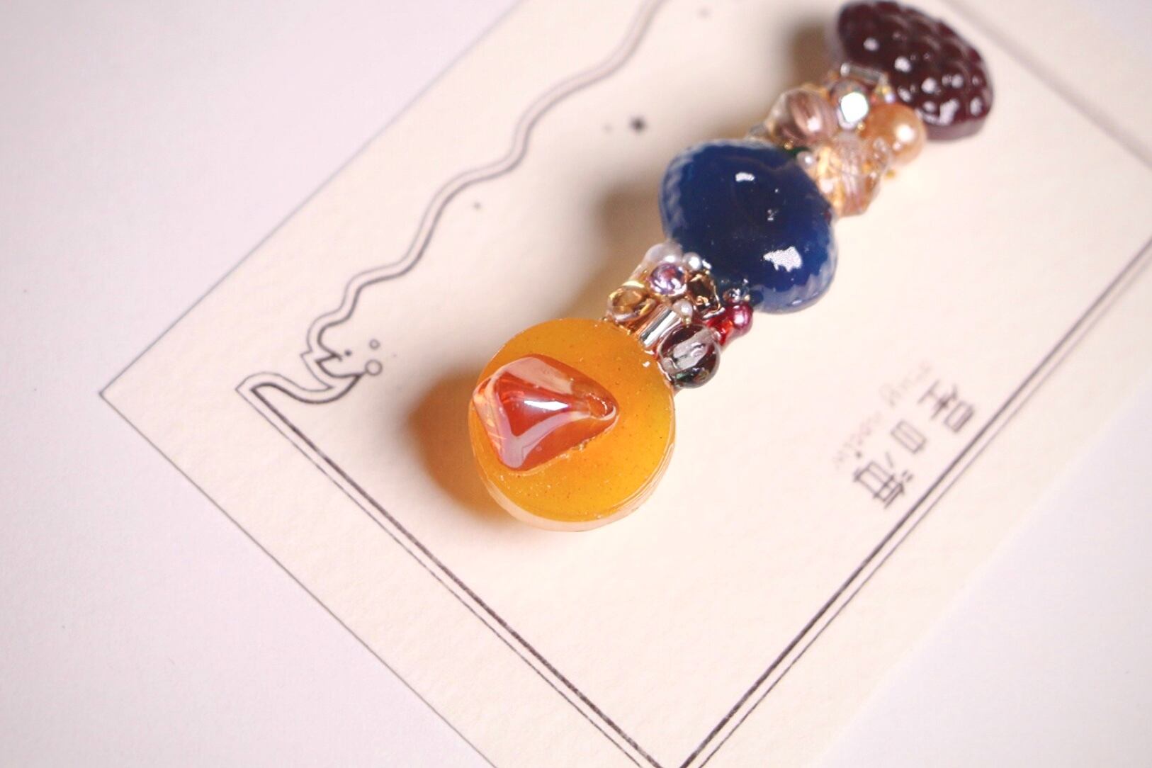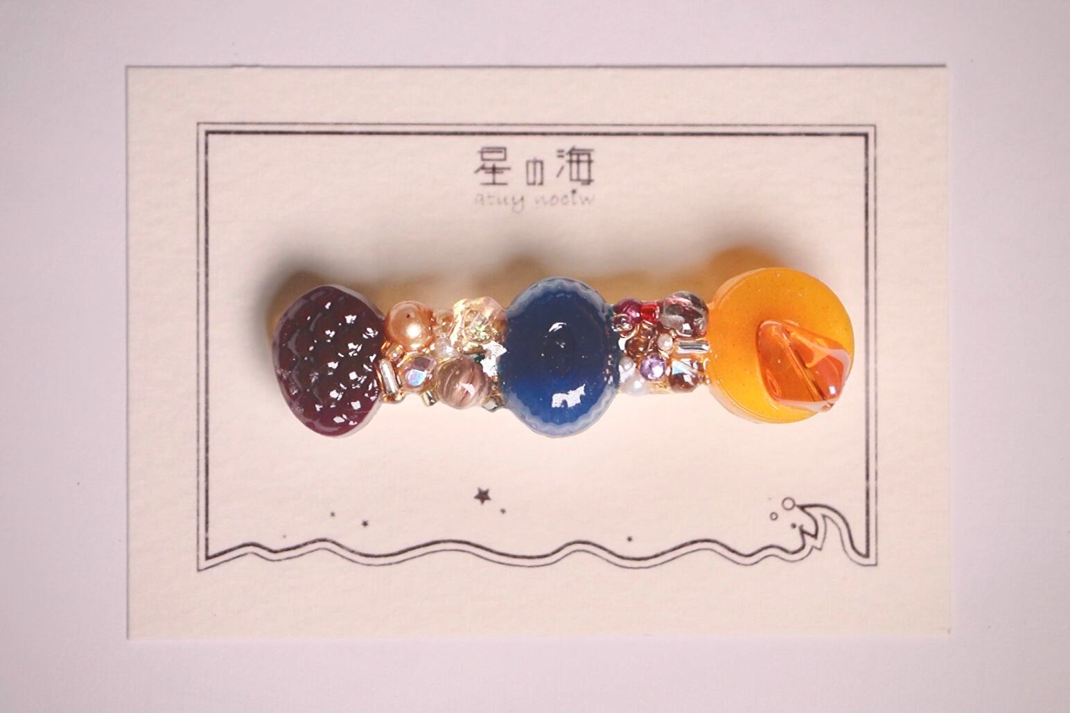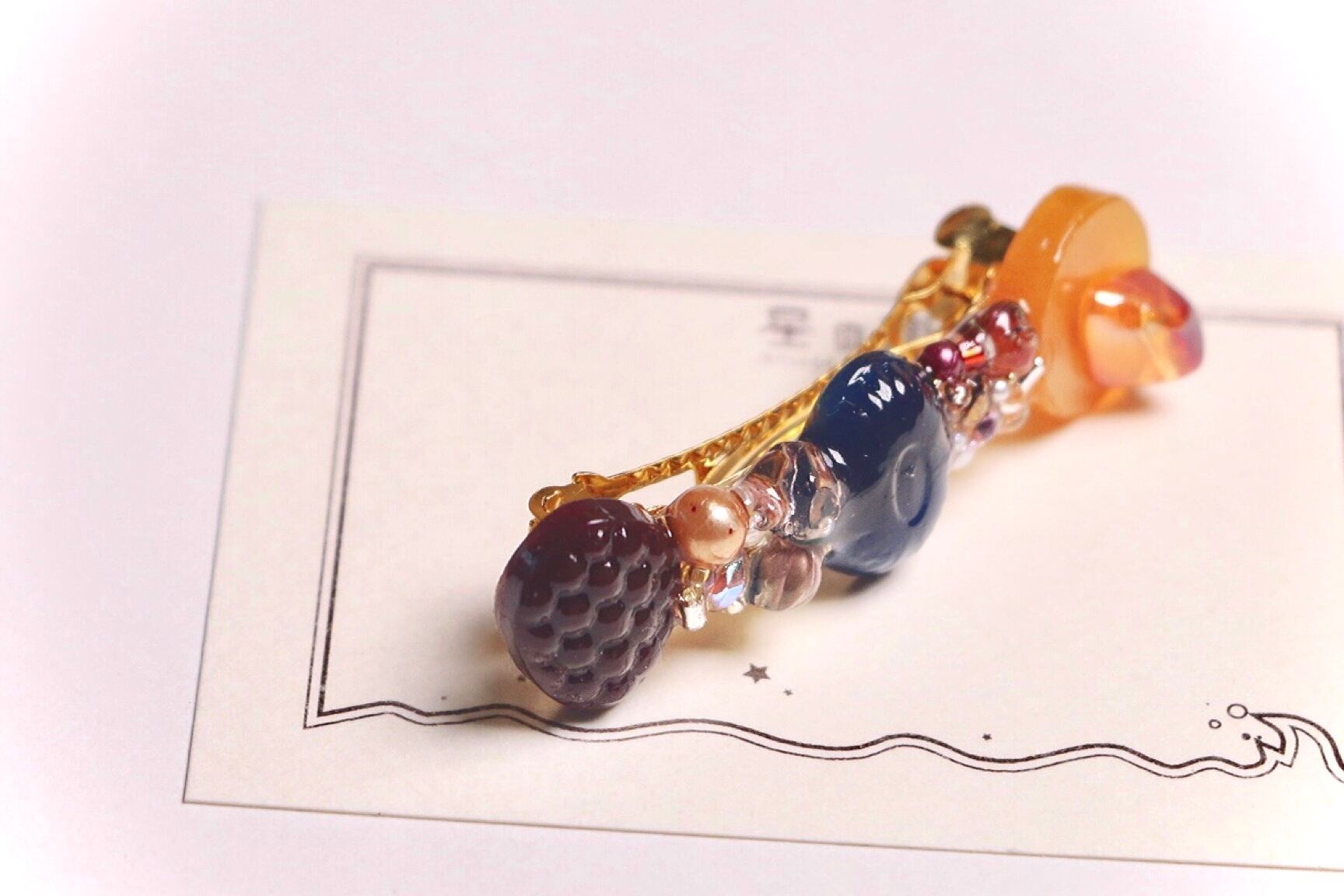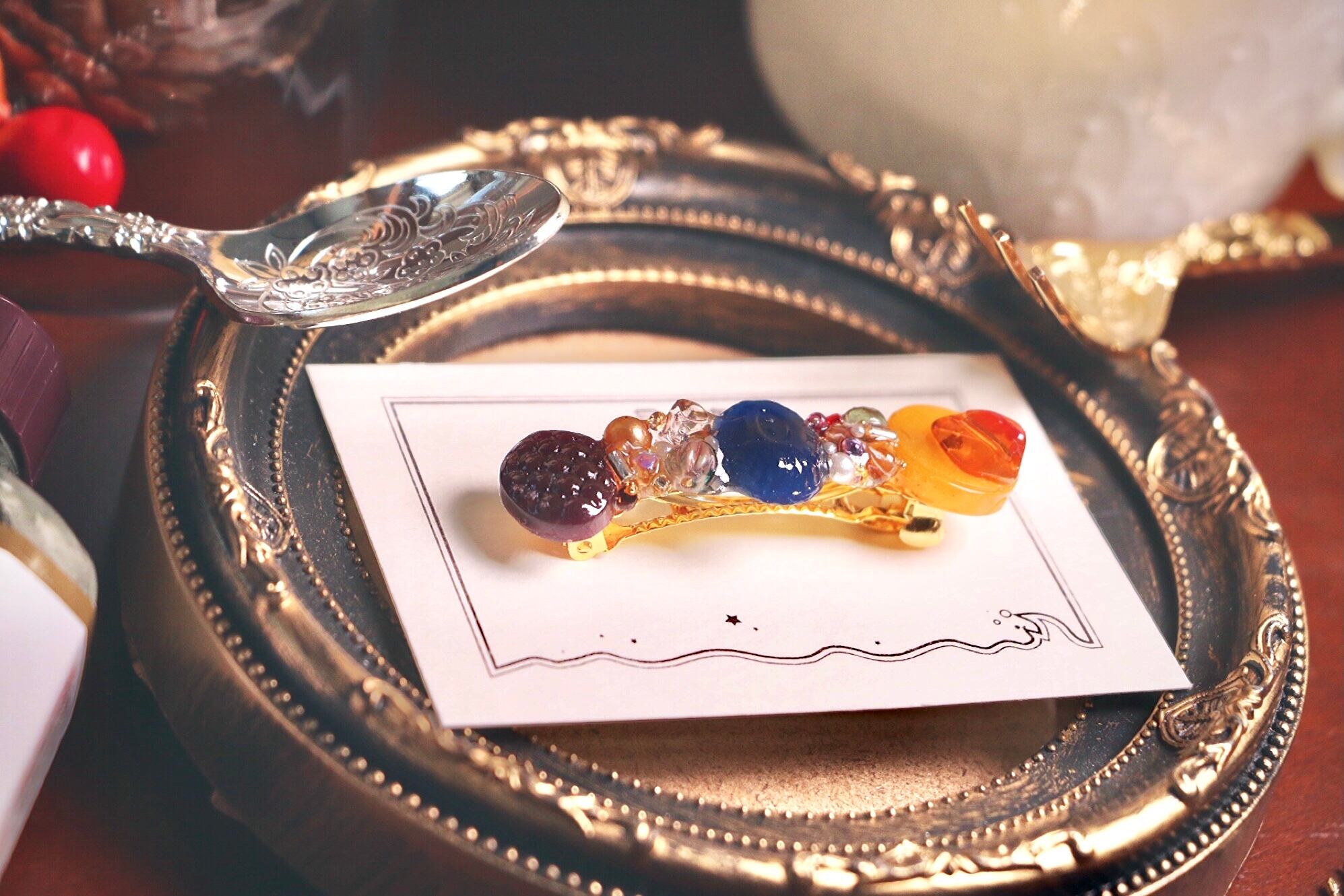 紫(グレープ型)藍色(オーバル型)黄色(パイン型、上には溢れる果汁のような紅茶色のさざれビーズを)のドロップをゴールドのバレッタに配置し、間にはチェコビーズやパールをぎっしり♡
