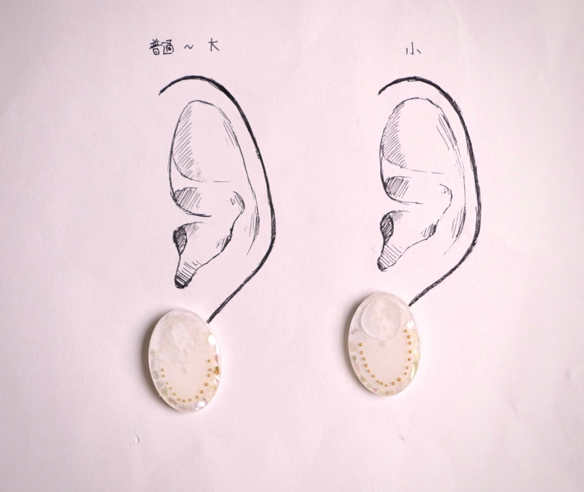 耳シートの左は平均的な女性の普通〜大きめの耳、右は小さめの耳のモデルとなっております。ご参照ください。