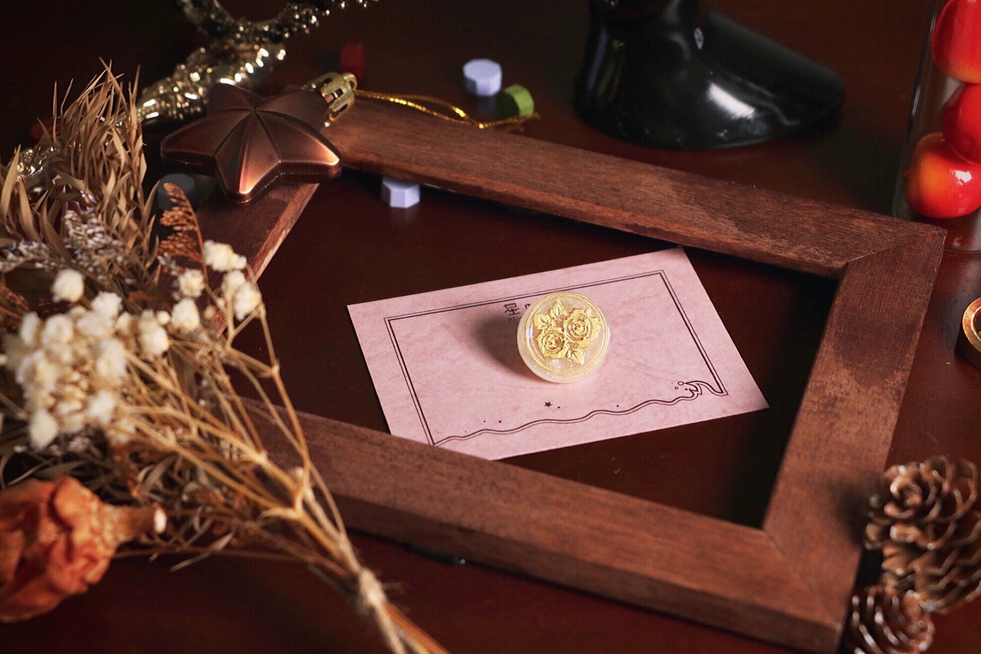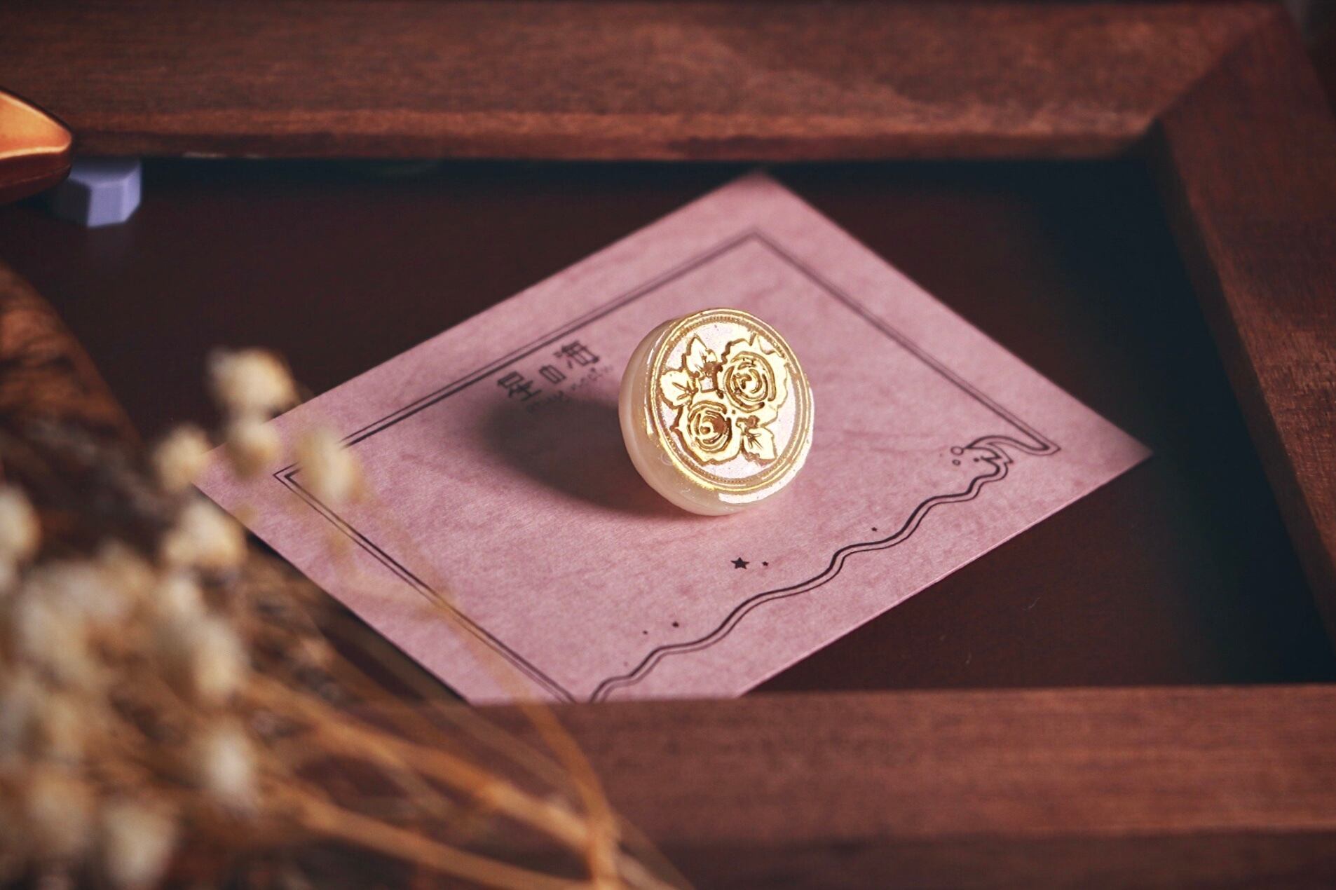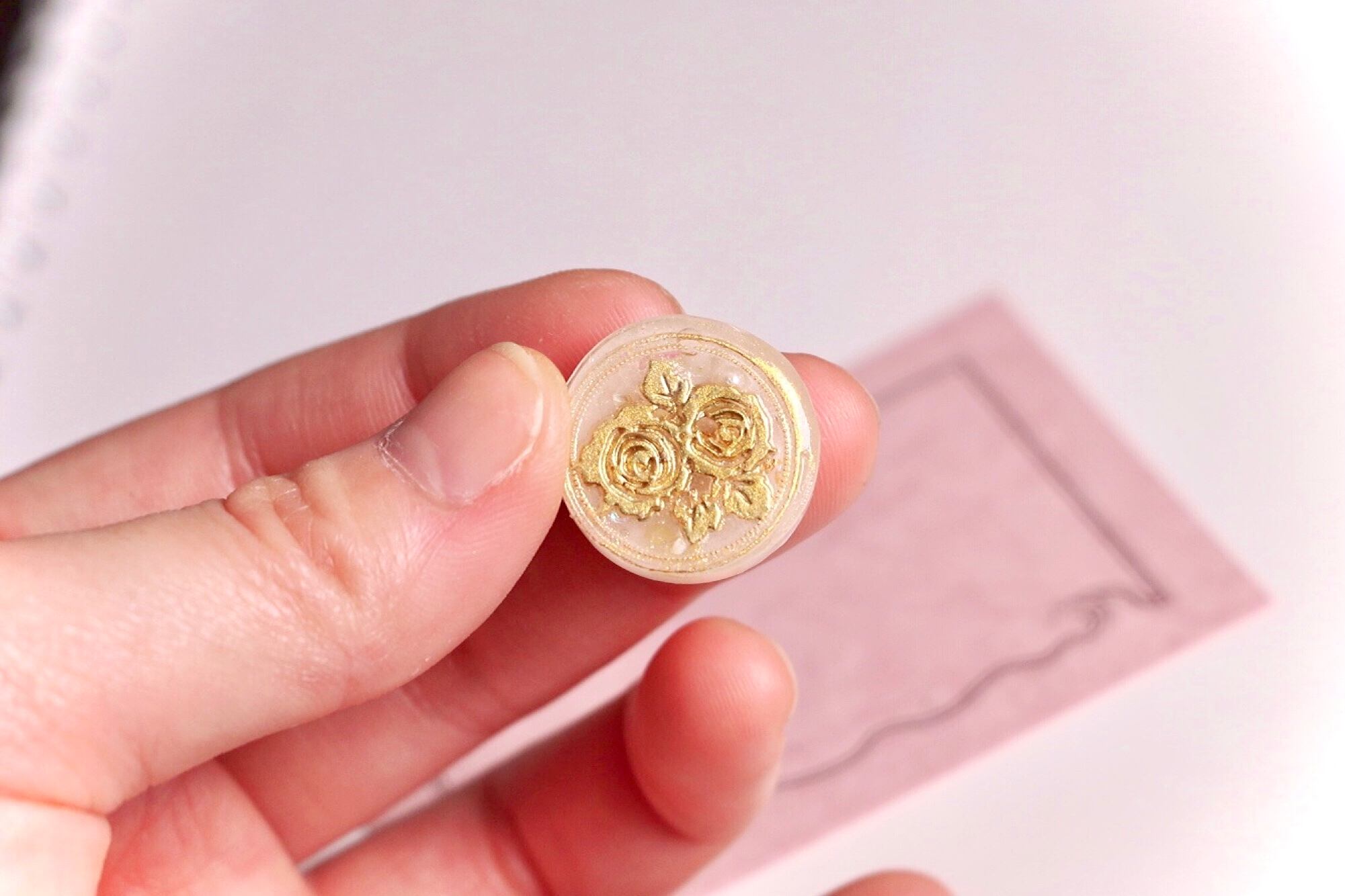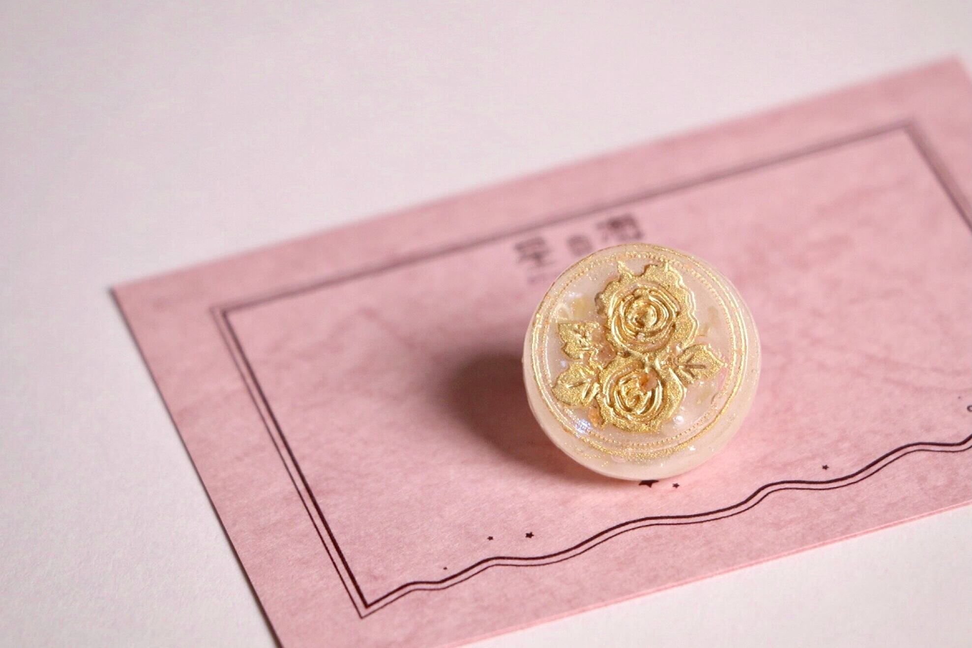 上側はシーリングスタンプを透明レジンに押して、薔薇の模様に2色の金色をつけています。下側はホワイトチョコレートのような色を埋め込み、間にはオーロラフィルム、シェル、金箔、パール、金の端パーツをぎっしり♡