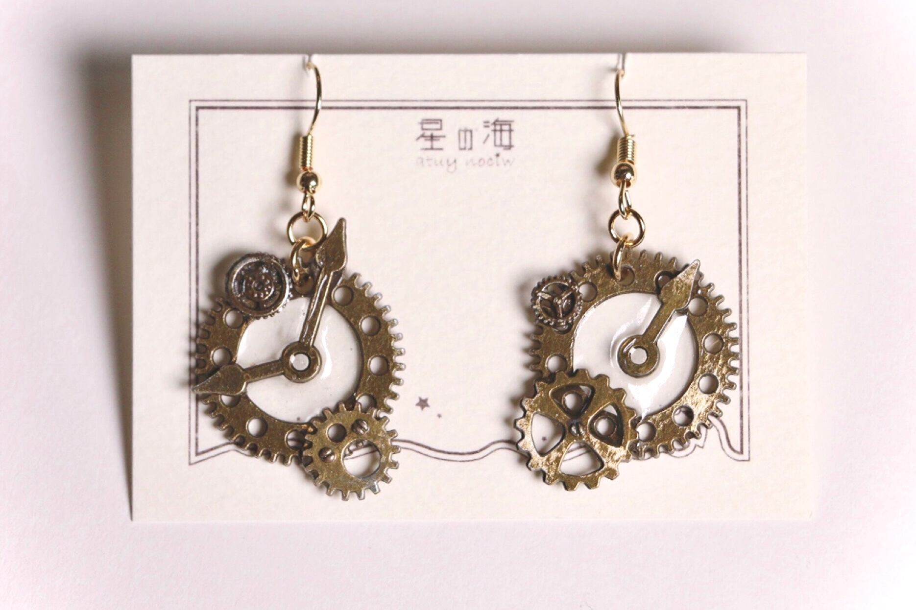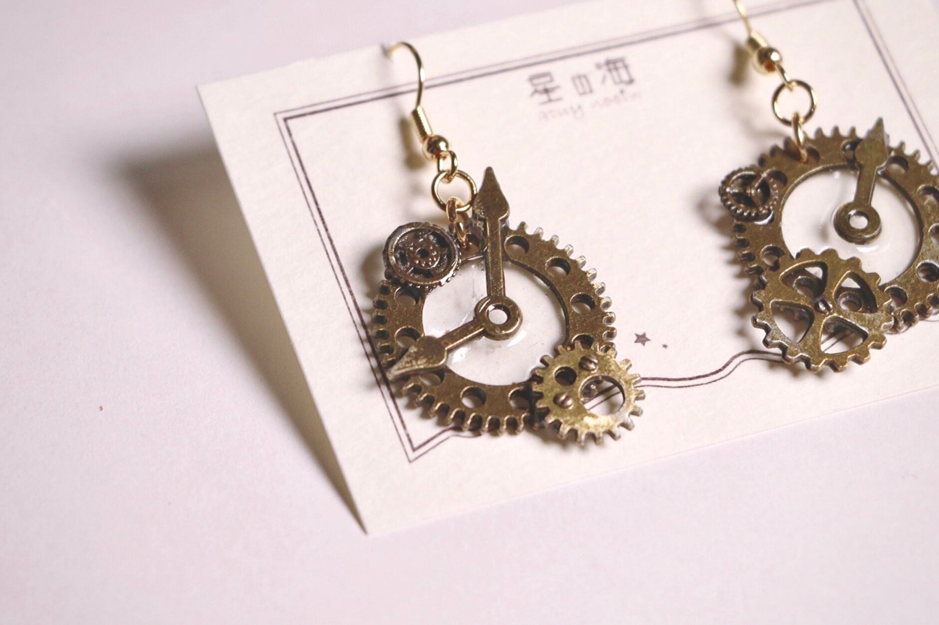 アシンメトリーデザインで、メインの歯車以外は全て違うパーツを使用。時計の指針を真ん中に置いてレジンを満たすことで、うるうるとした見た目が可愛らしいです♪ヴィンテージゴールドが絶妙な色味で、深みのある雰囲気を演出します…
