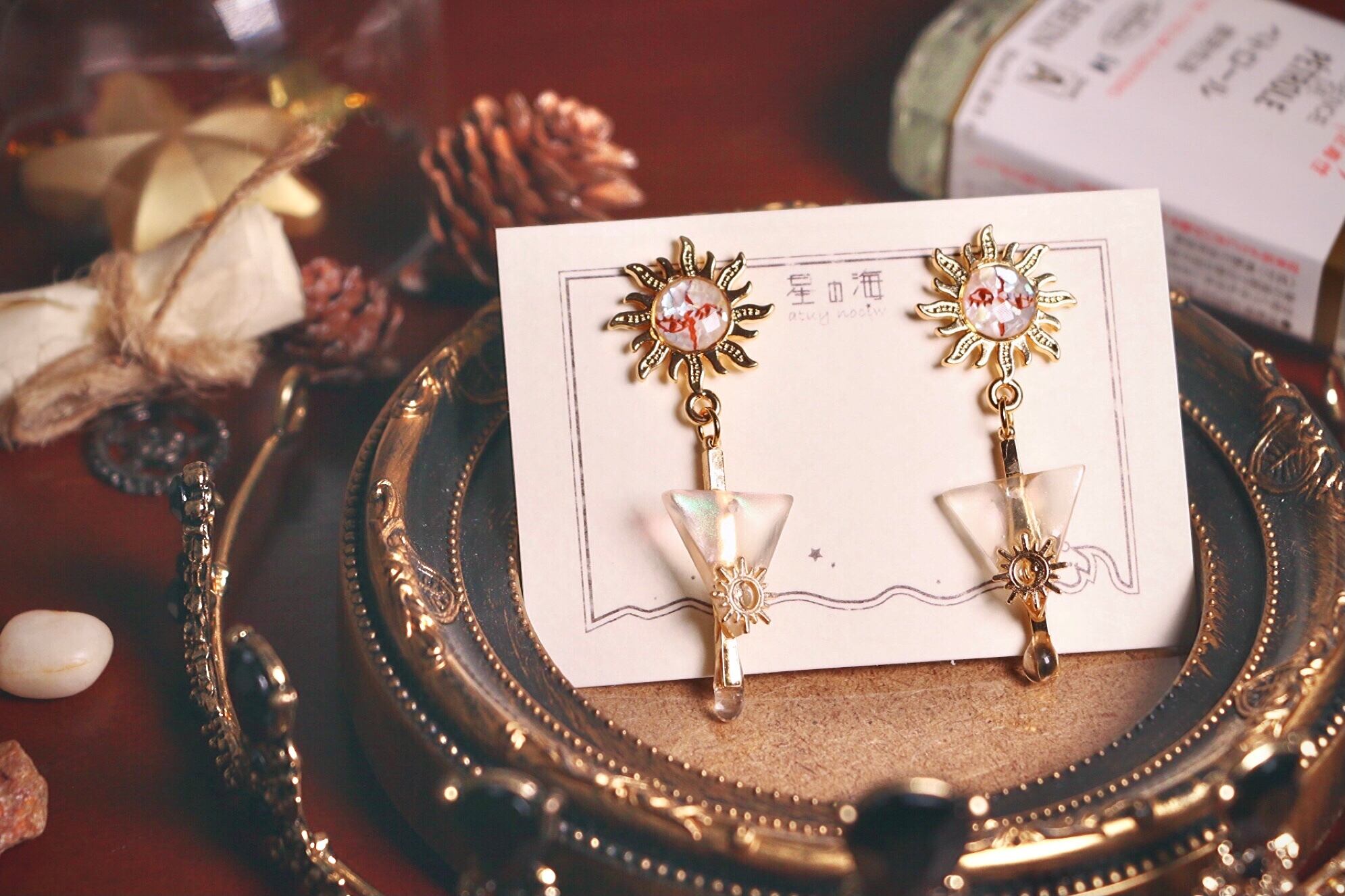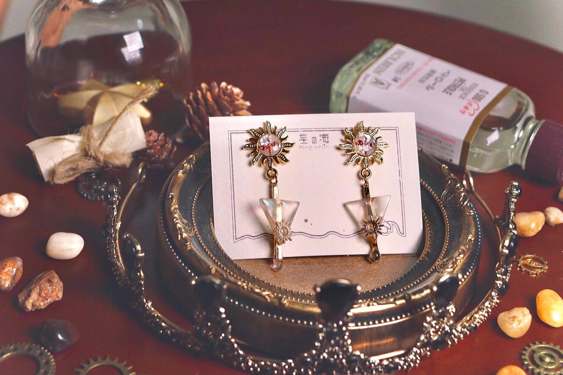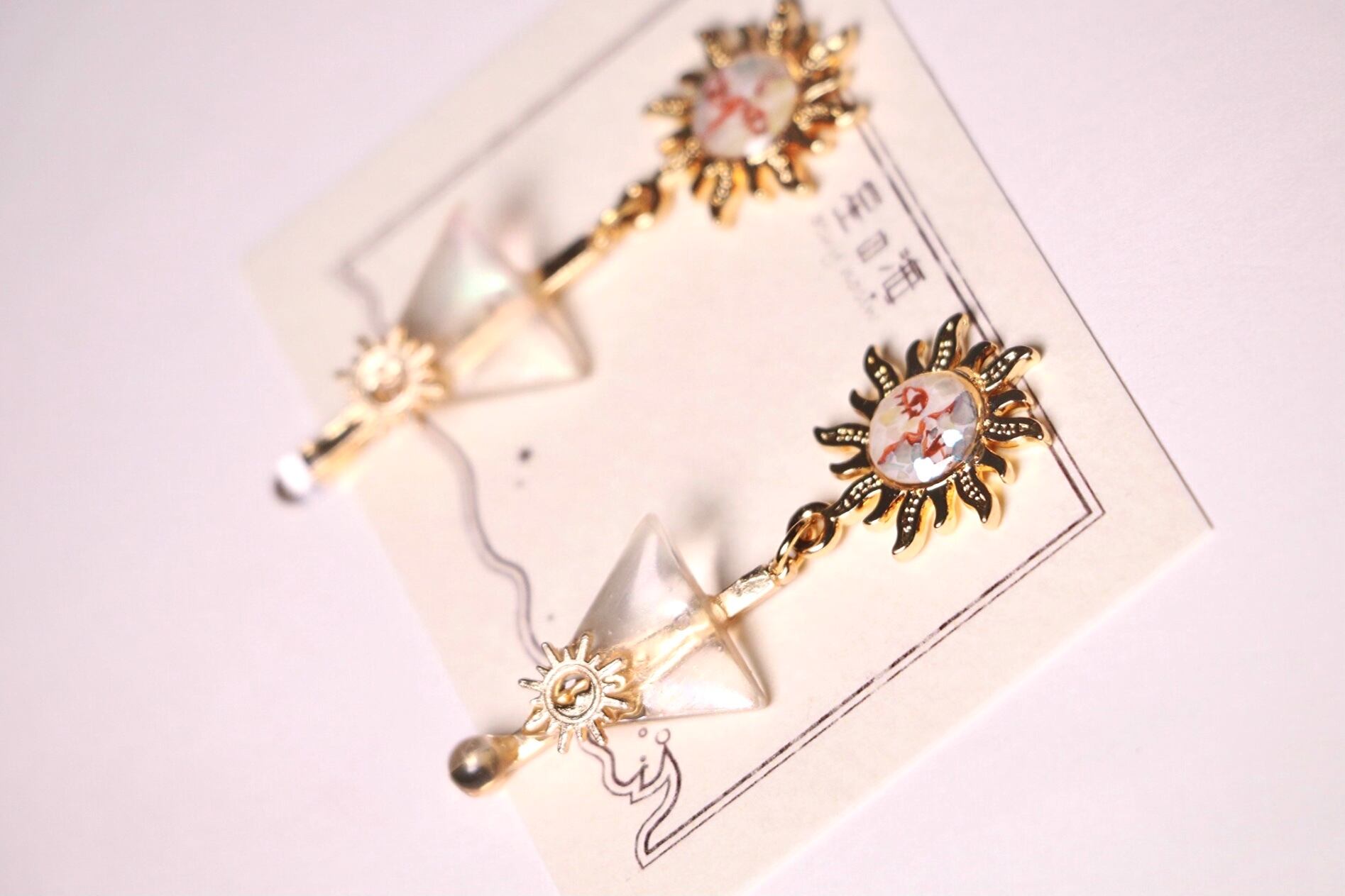 三角パーツはオーロラとマット加工を施し、角度による変化も楽しめて、程よいアクセントに。月を中に含んだ太陽のパーツがキラリと光ります♡