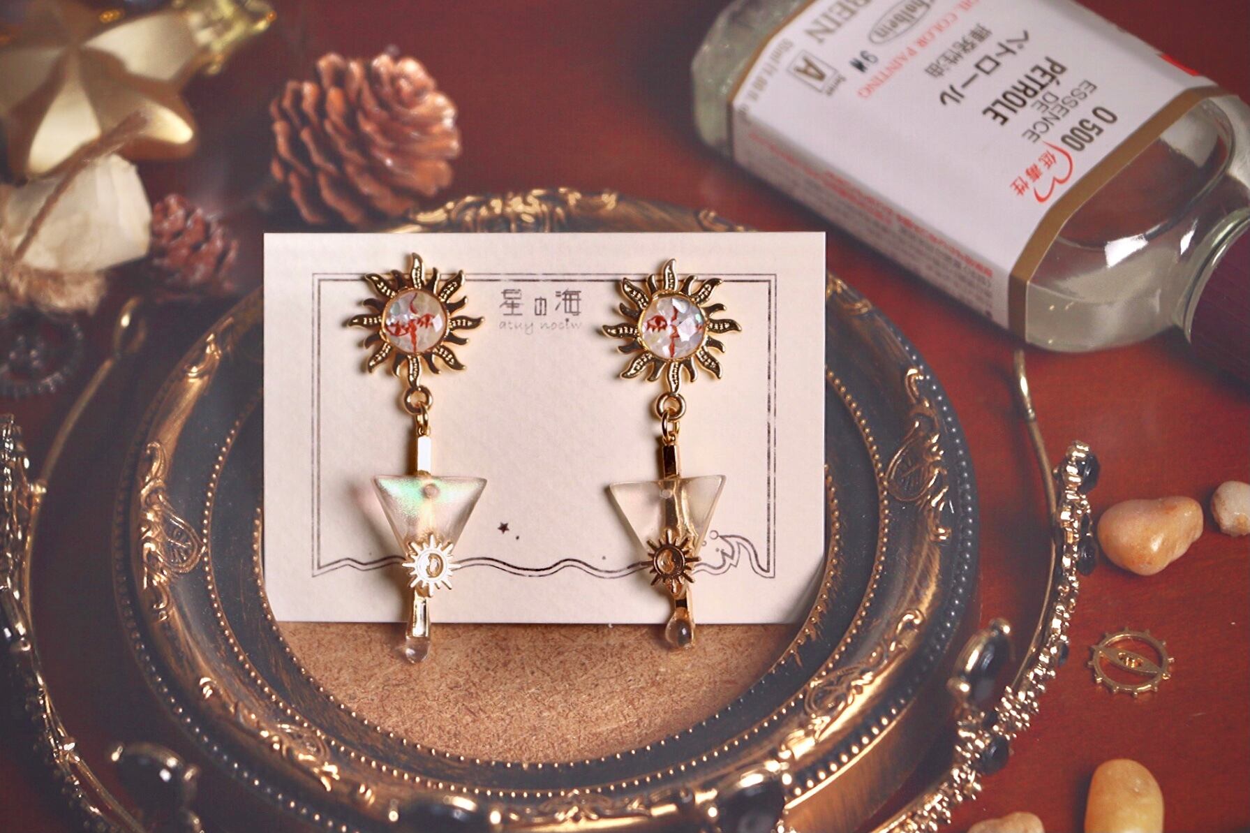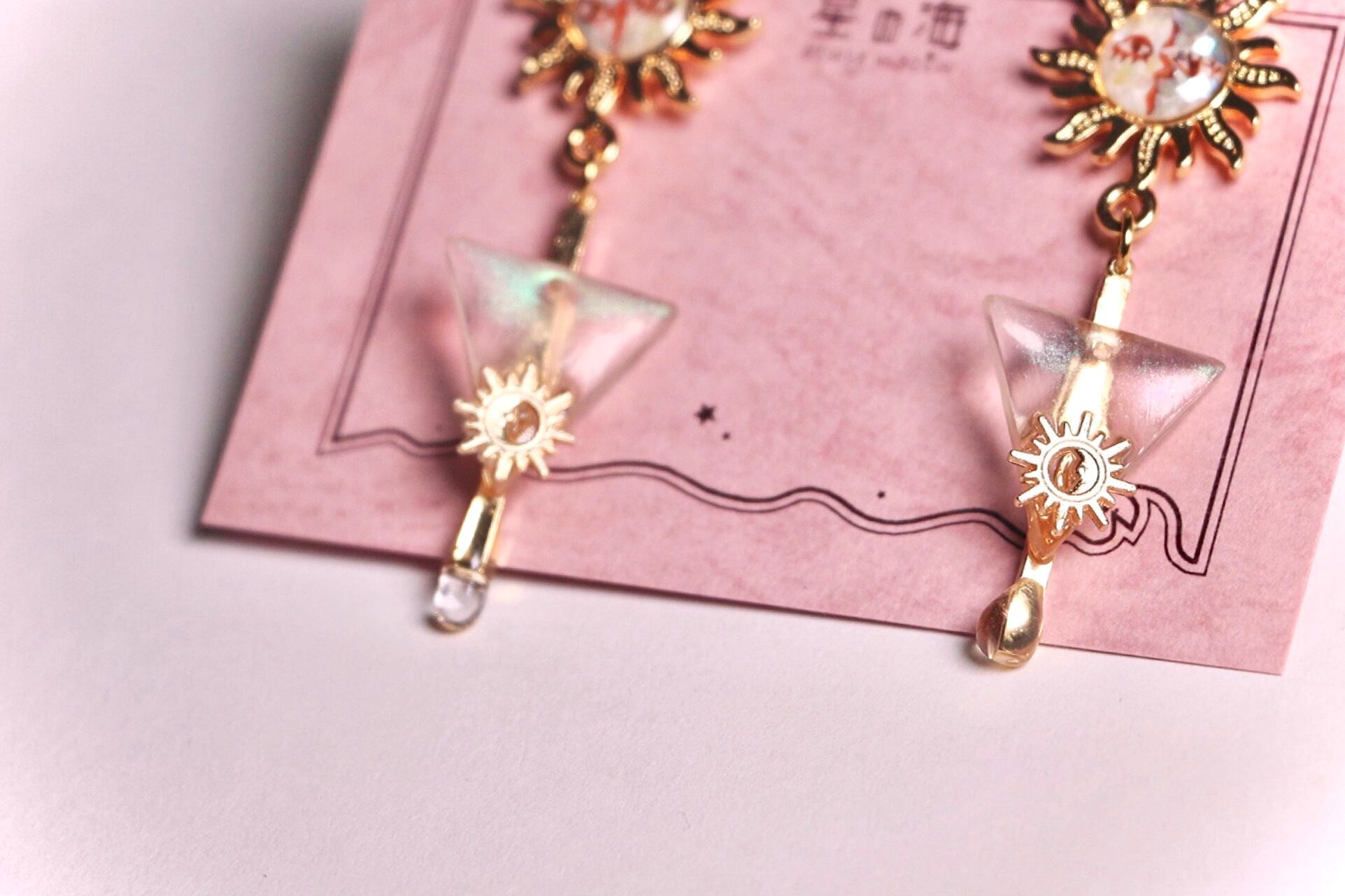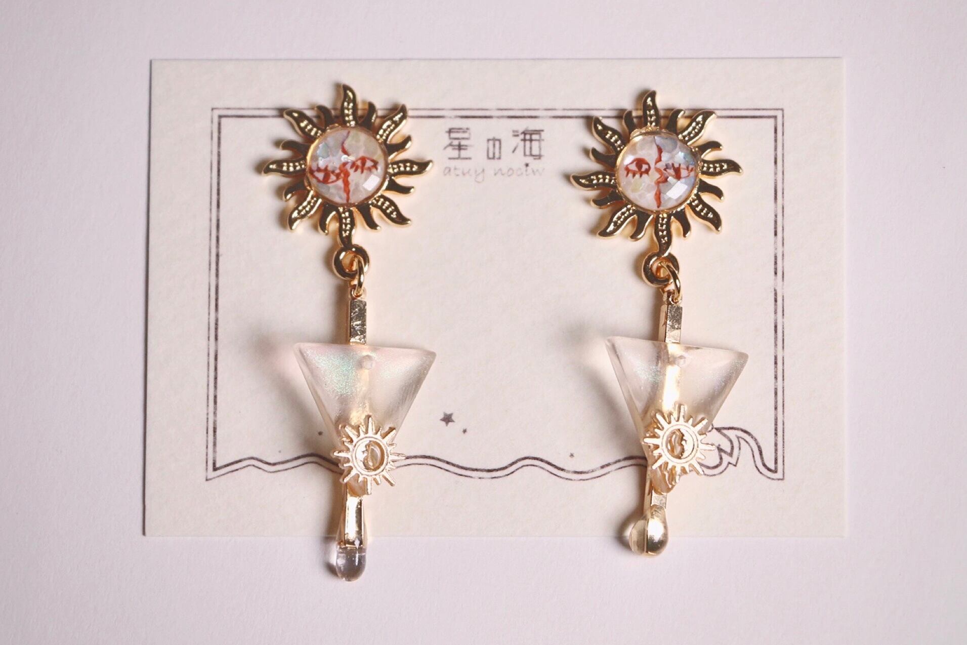 三角パーツはオーロラとマット加工を施し、角度による変化も楽しめて、程よいアクセントに。月を中に含んだ太陽のパーツがキラリと光ります♡