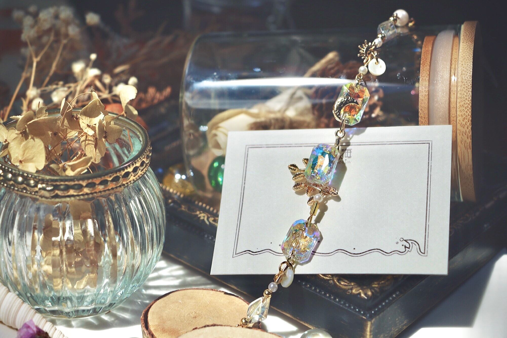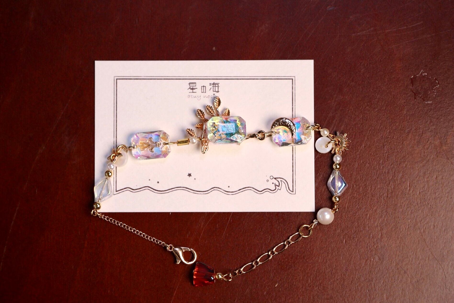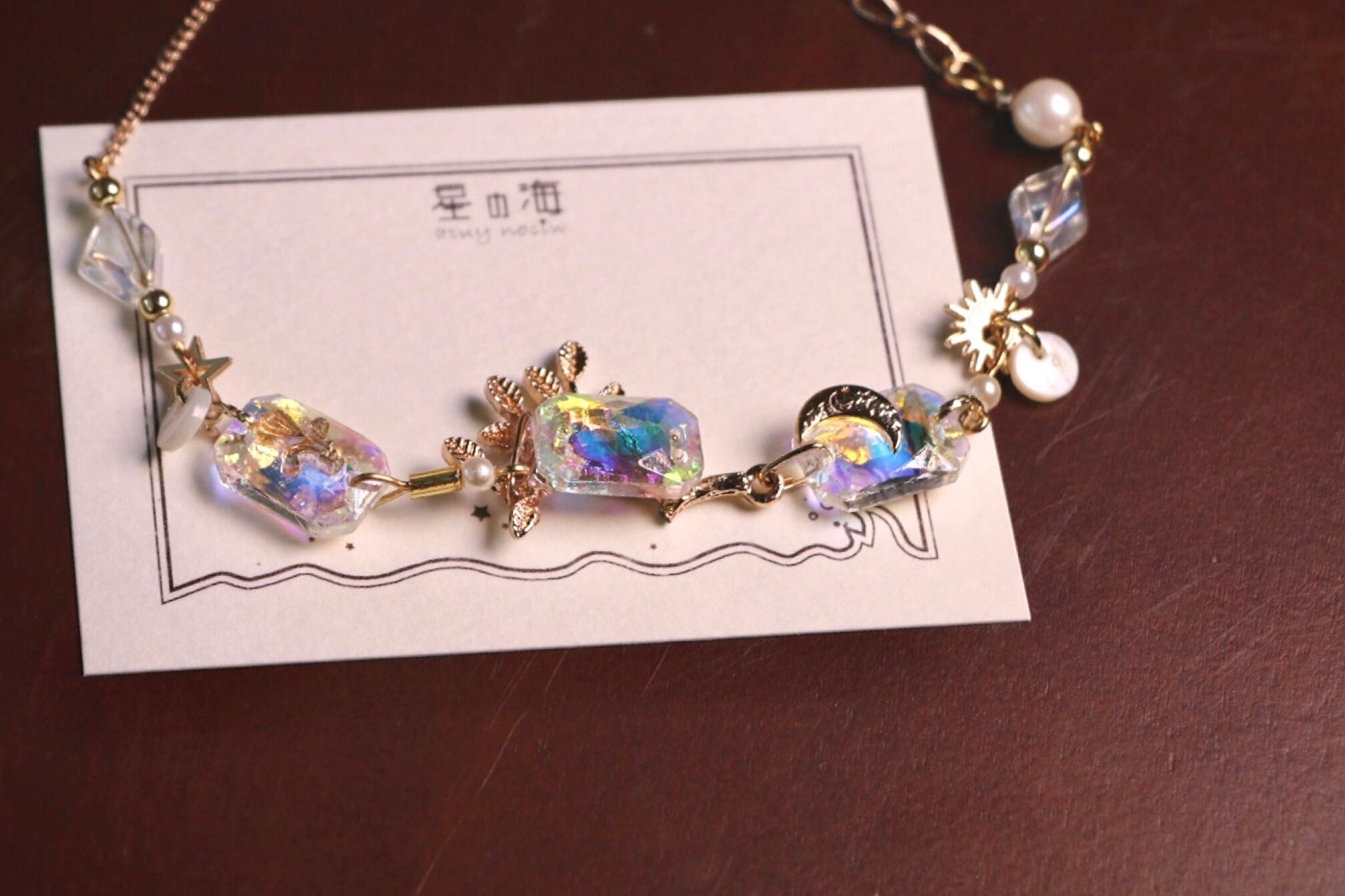 ハンドメイド ブレスレット ビーズ ビジュー パール ゴールド オーロラ 偏光 色が変わる キラキラ 夏 らしい っぽい 涼しげ 森 自然 かわいい きれい 綺麗 ゴテゴテ ゴツめ ピンクゴールド 太陽 月 植物 星 シェル