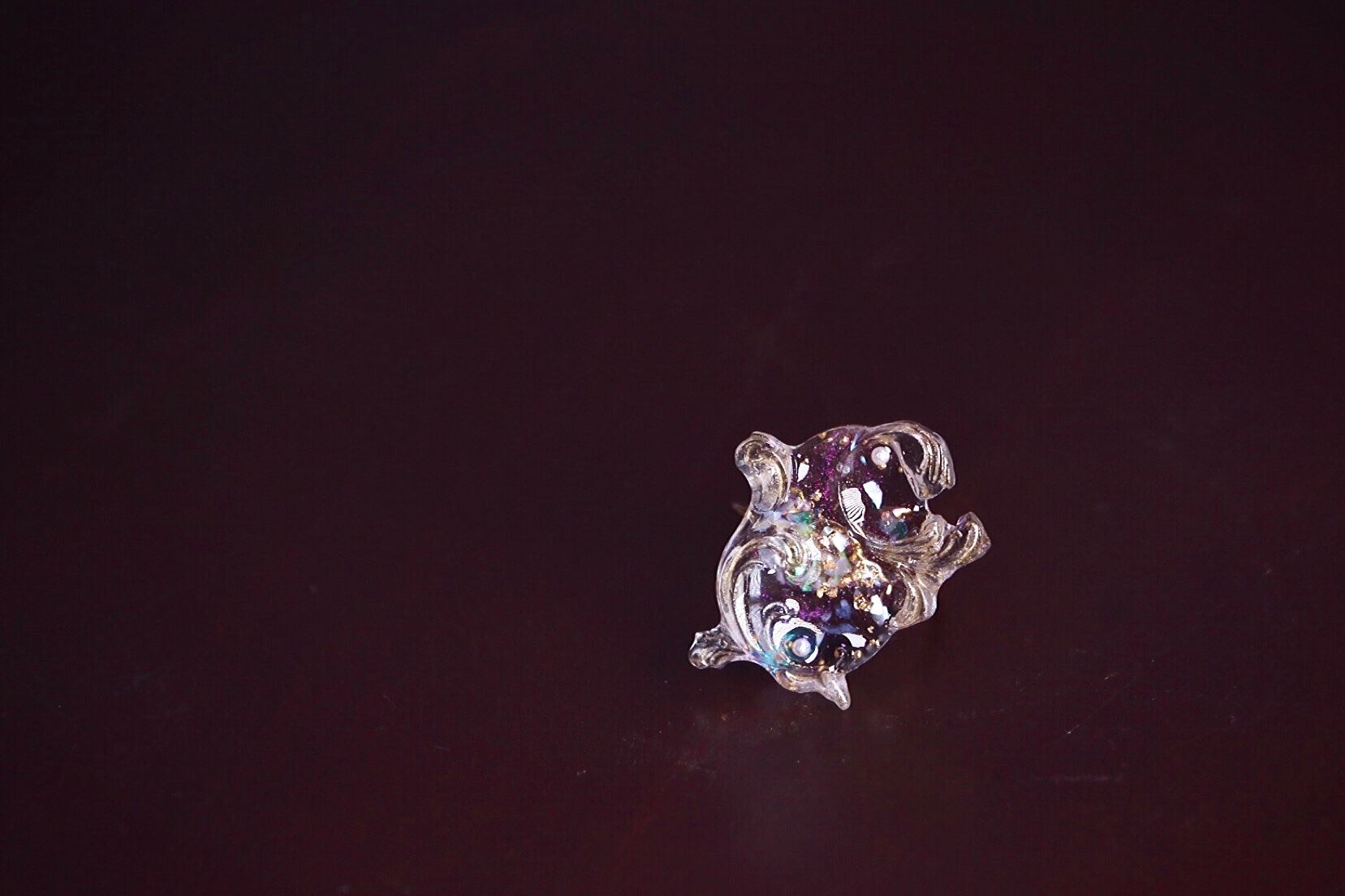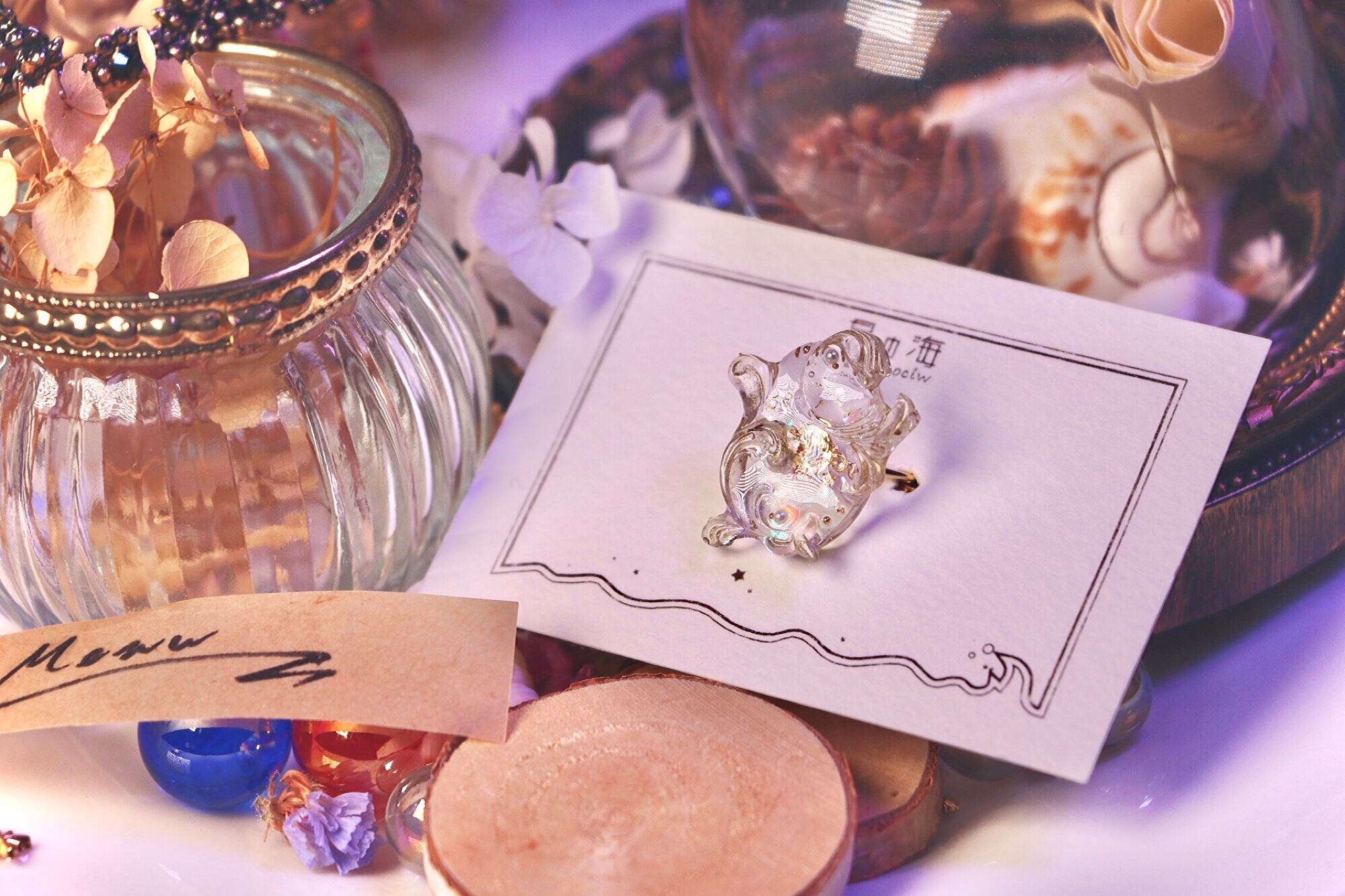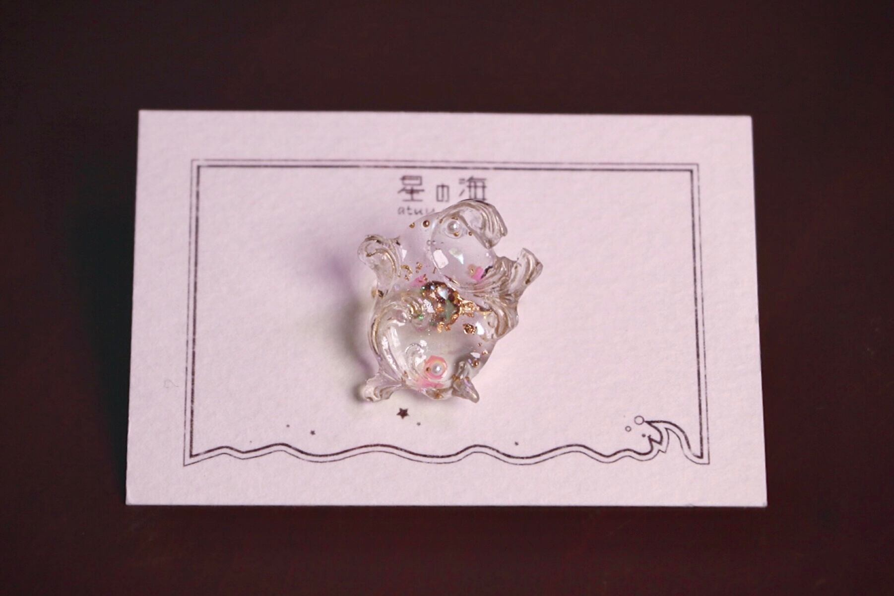 オーロラフィルムに金箔、シェルにブリオンなどうっすらとキラキラ輝く素材をギュッと閉じ込めました。