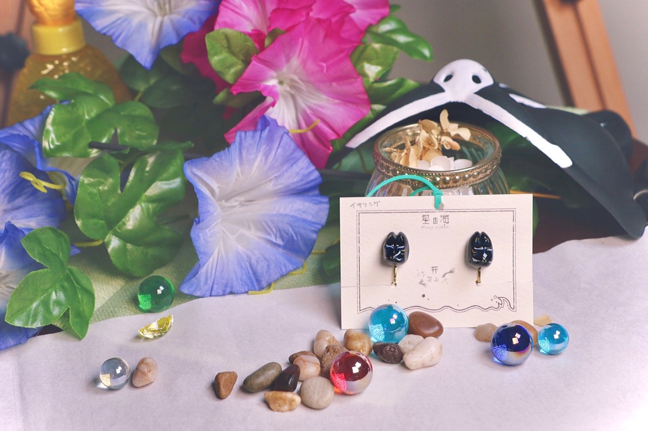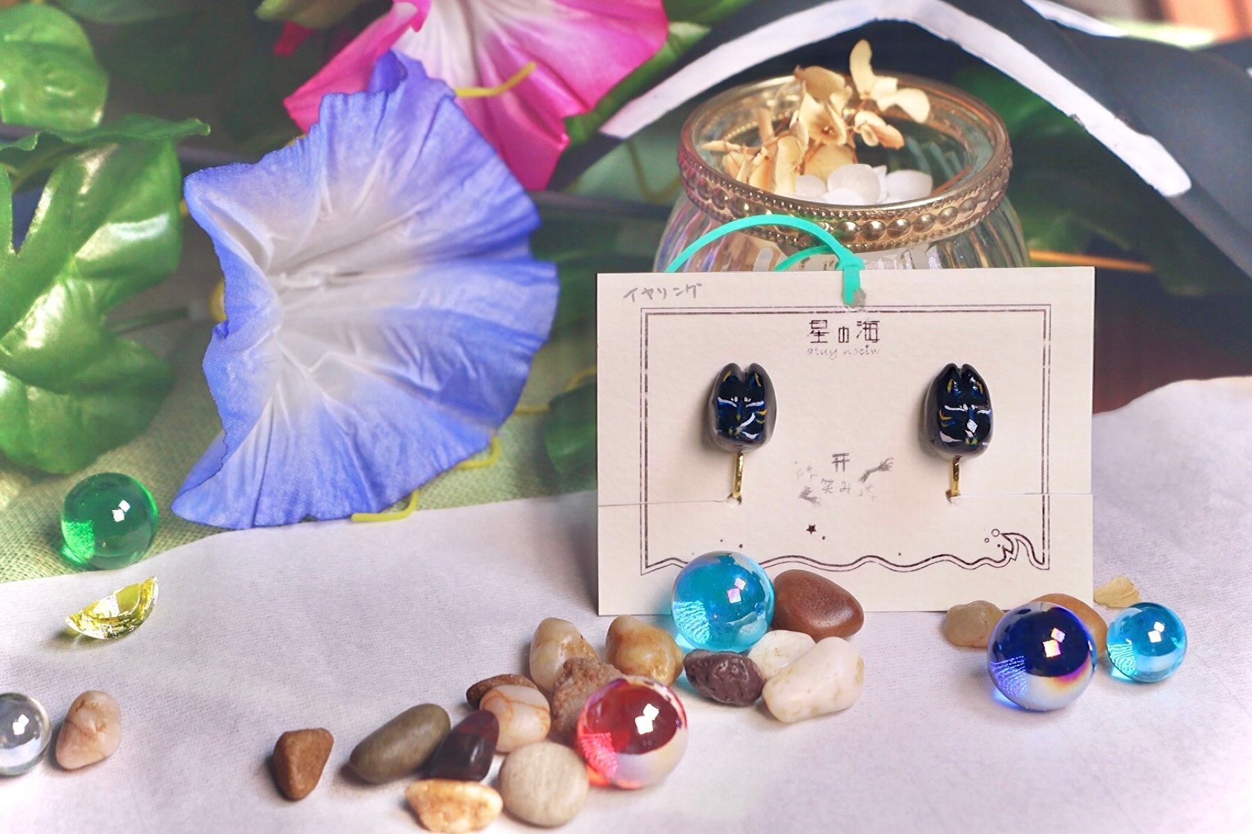 ハンドメイド アクセサリー イヤリング お祭り 浴衣 コーデ ファッション コーディネート 和風 チャイナ 中華 かわいい 綺麗 プレゼント ギフト 不思議 狐面 お面 きつね 神社 青 黄色 白 樹脂粘土 オリジナル デザイン あやかし 妖狐 夏