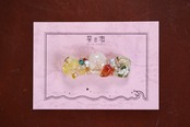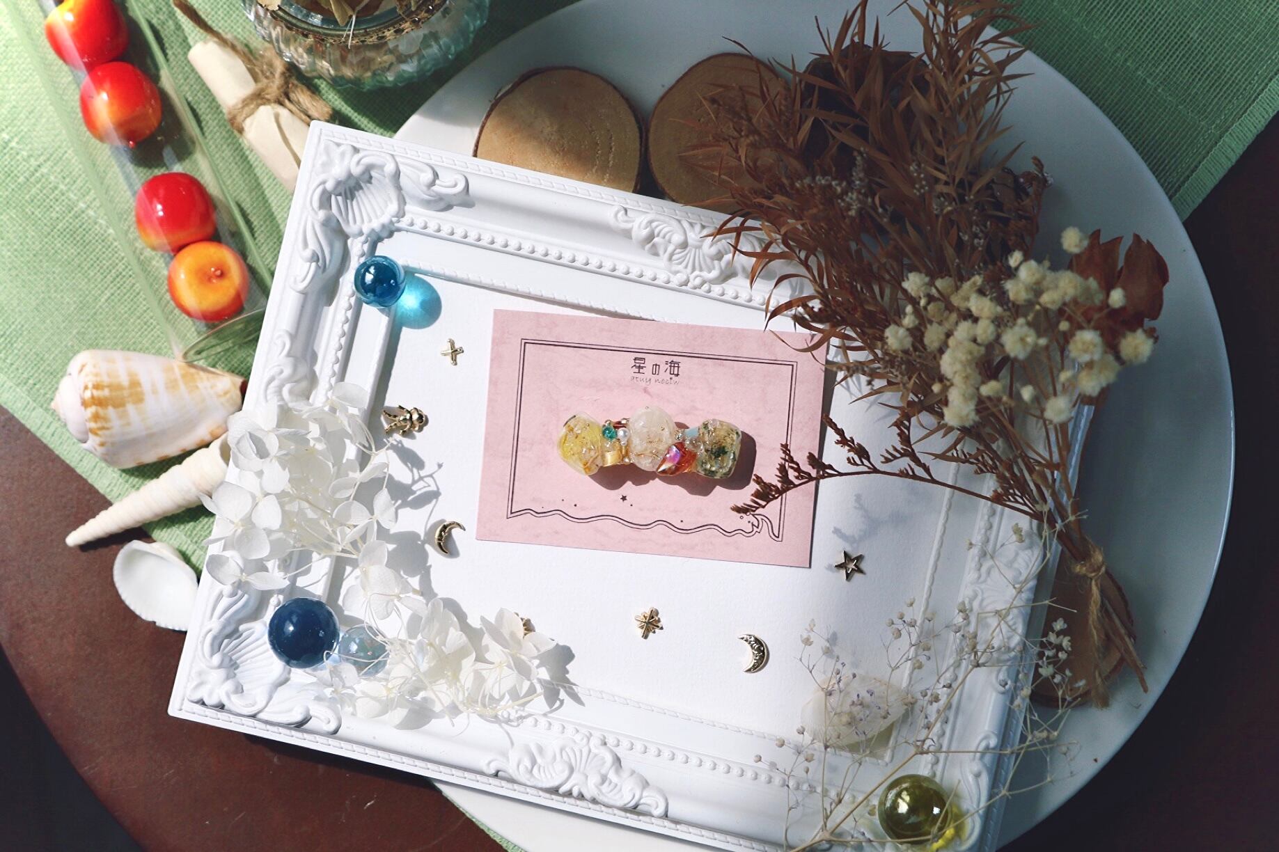 黄色、白、緑に分けてドロップ型にドライフラワーや金箔、シェル、ブリオンなどをぎゅっと詰め込み、底を白で閉じ込めました。