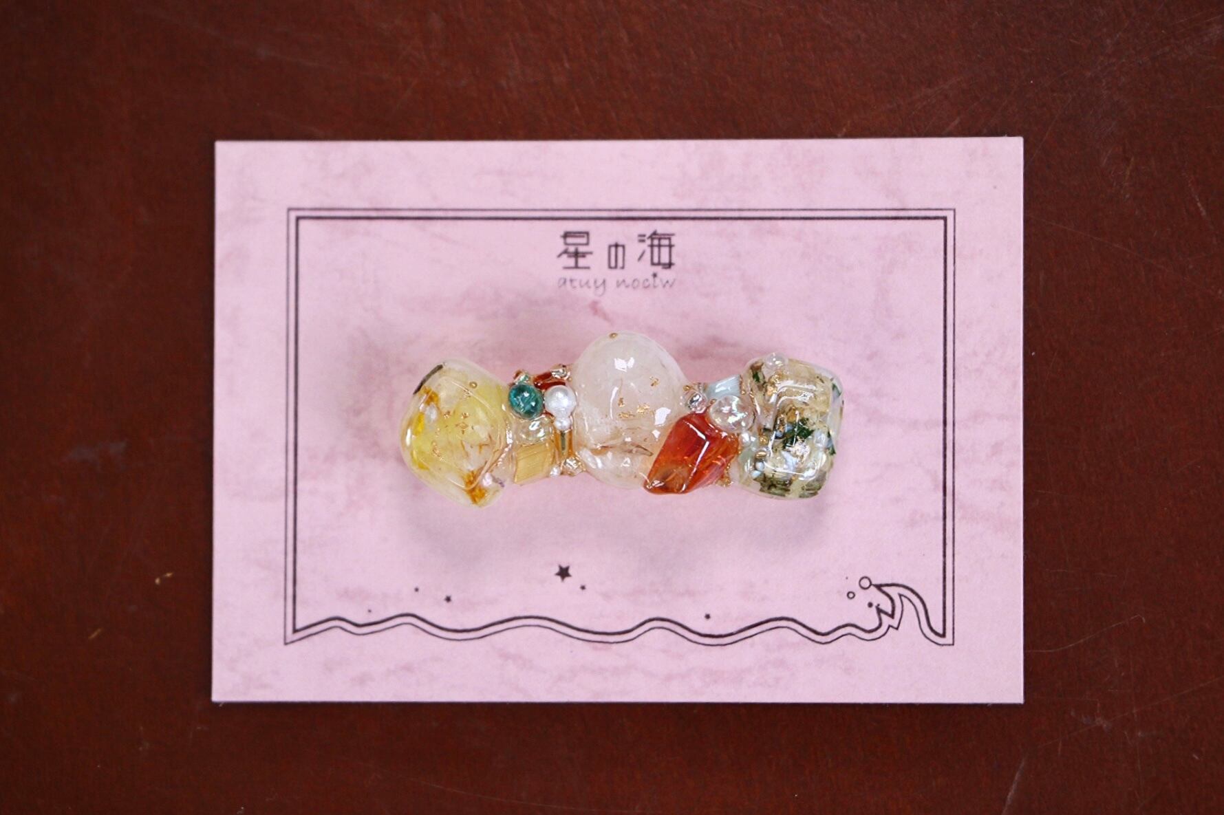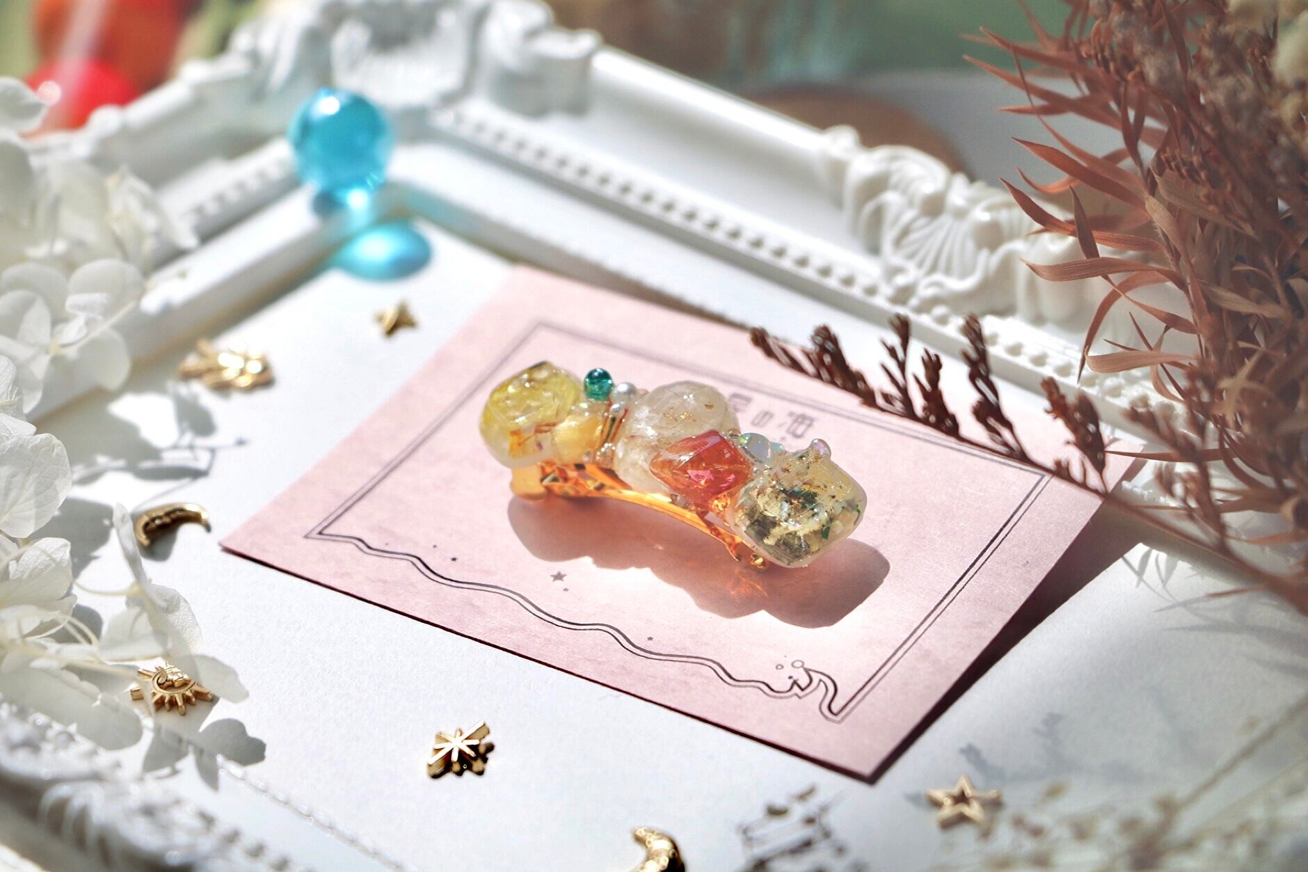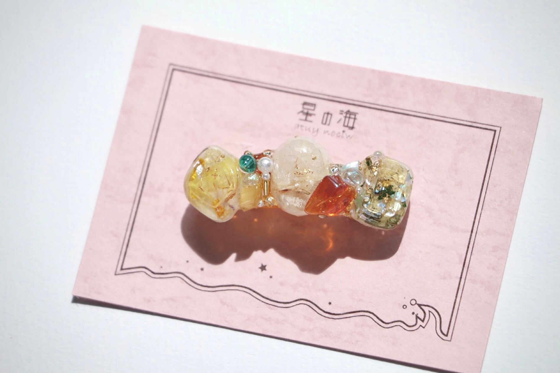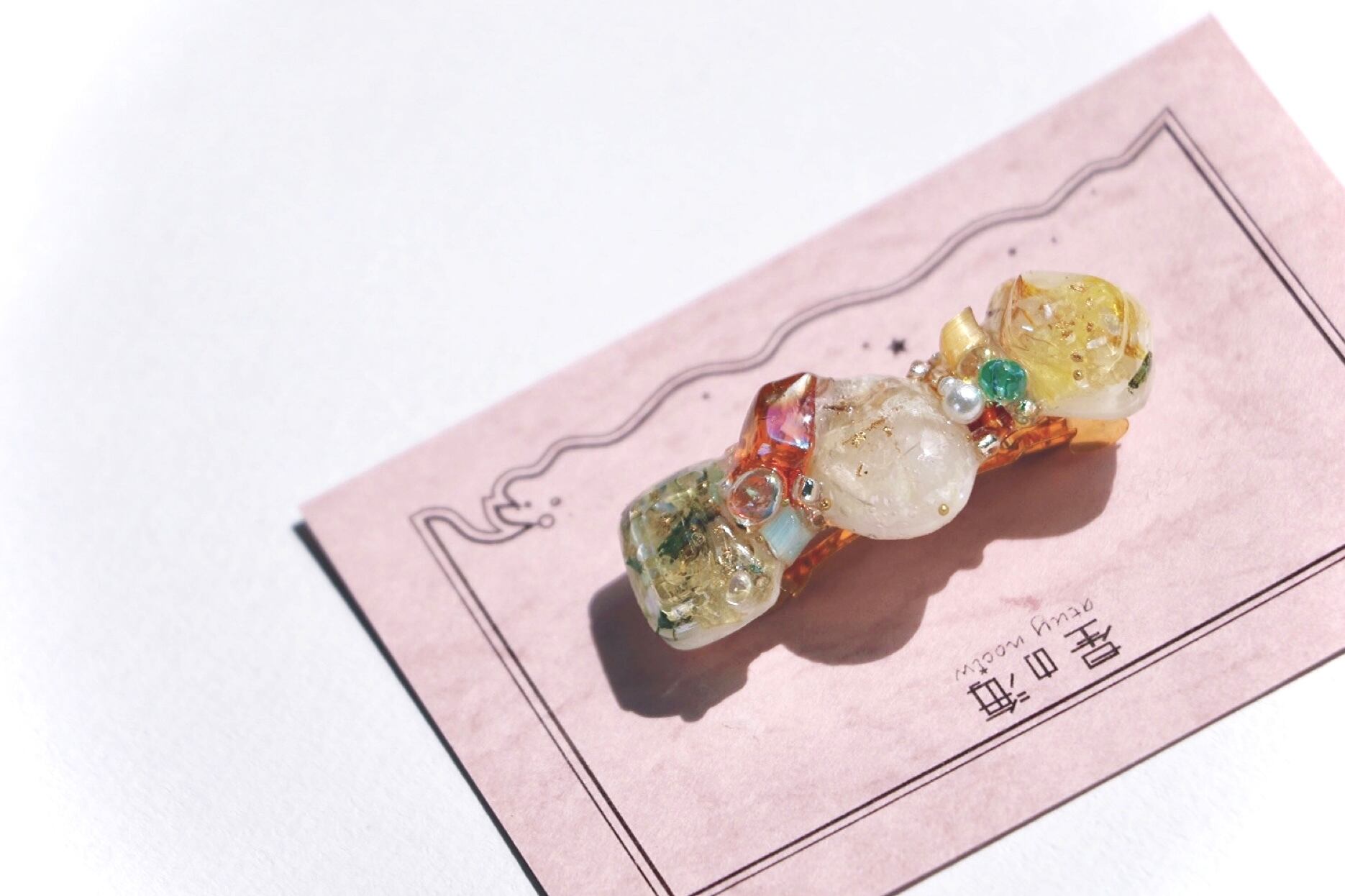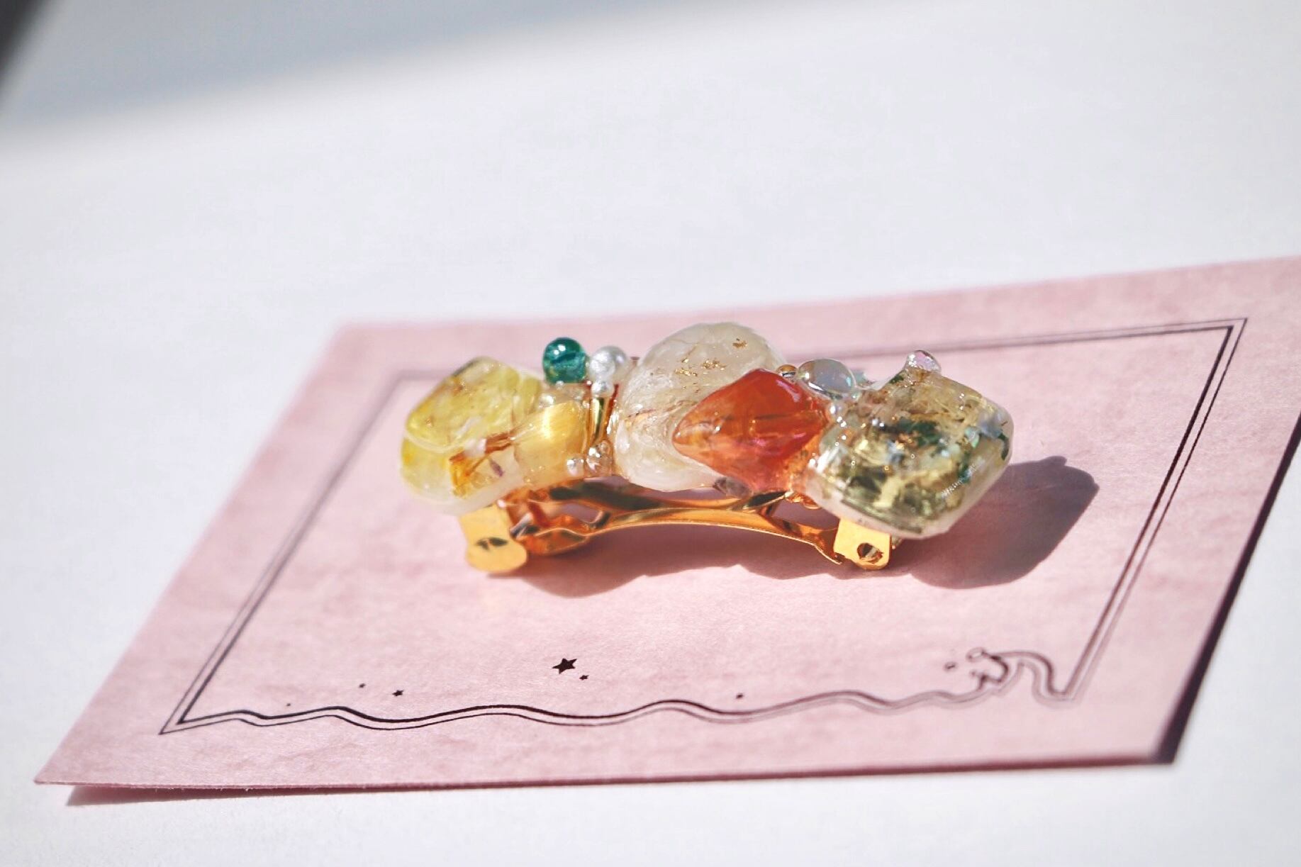 ハンドメイド アクセサリー ヘア バレッタ アレンジ レジン チェコ ガラス ビーズ キラキラ ゴールド 金 喫茶店 レトロ キャンディ ドロップ メニュー 美味しそう かわいい プレゼント 好き プレゼント ギフト 彼女 恋人 友人 ご褒美ぎっしり レモンスカッシュ ミニ ドライフラワー パール 黄色 イエロー 白 緑 爽やか