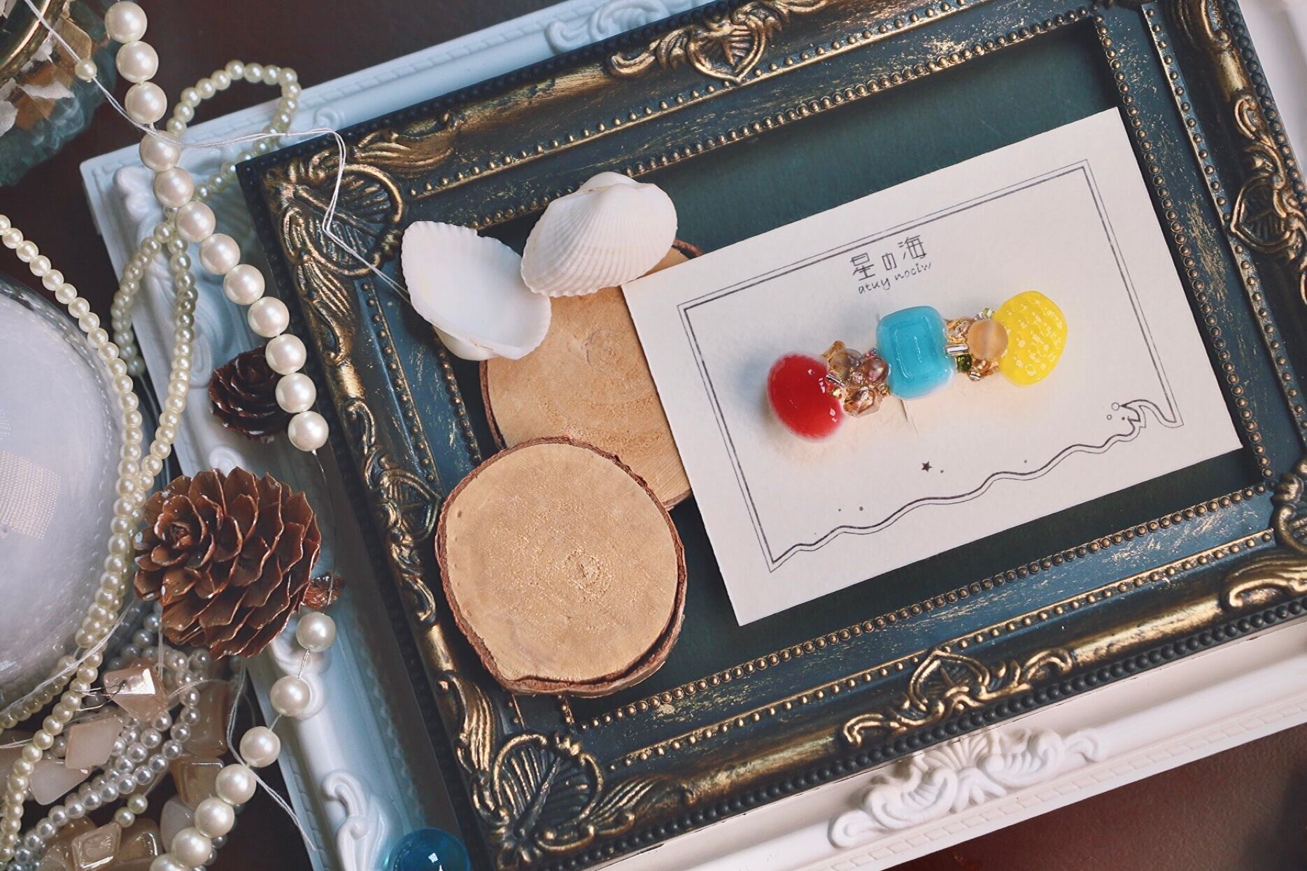 マットなものやオーロラのものなど、さまざまなビーズを使いつつ、キラキラは一部だけにすることでほんの少し和菓子や駄菓子のような雰囲気が♡