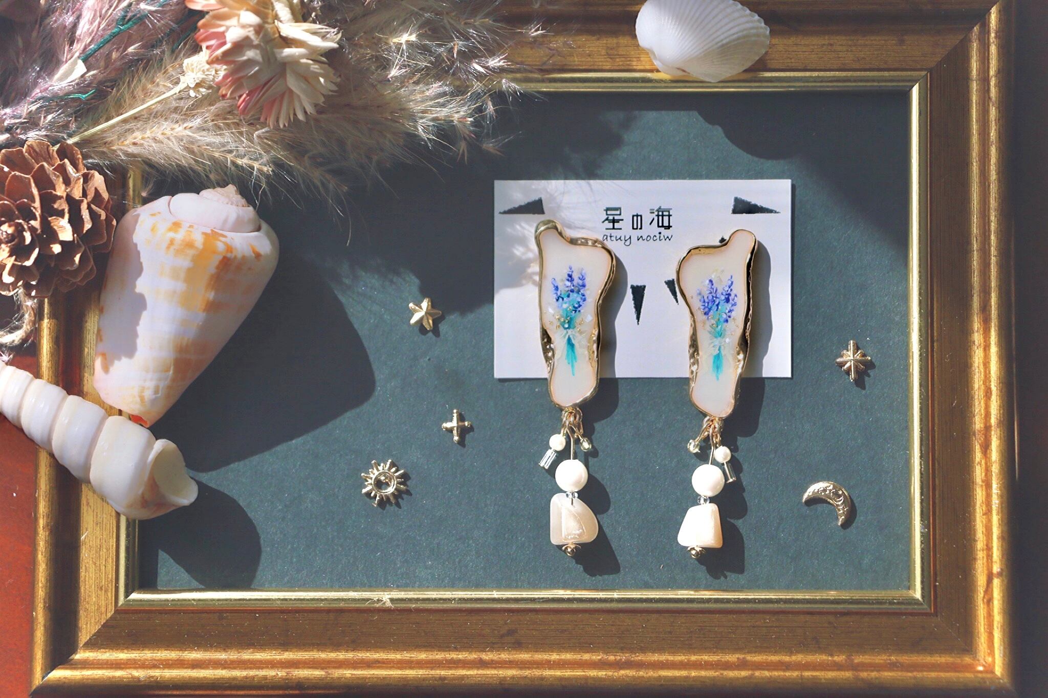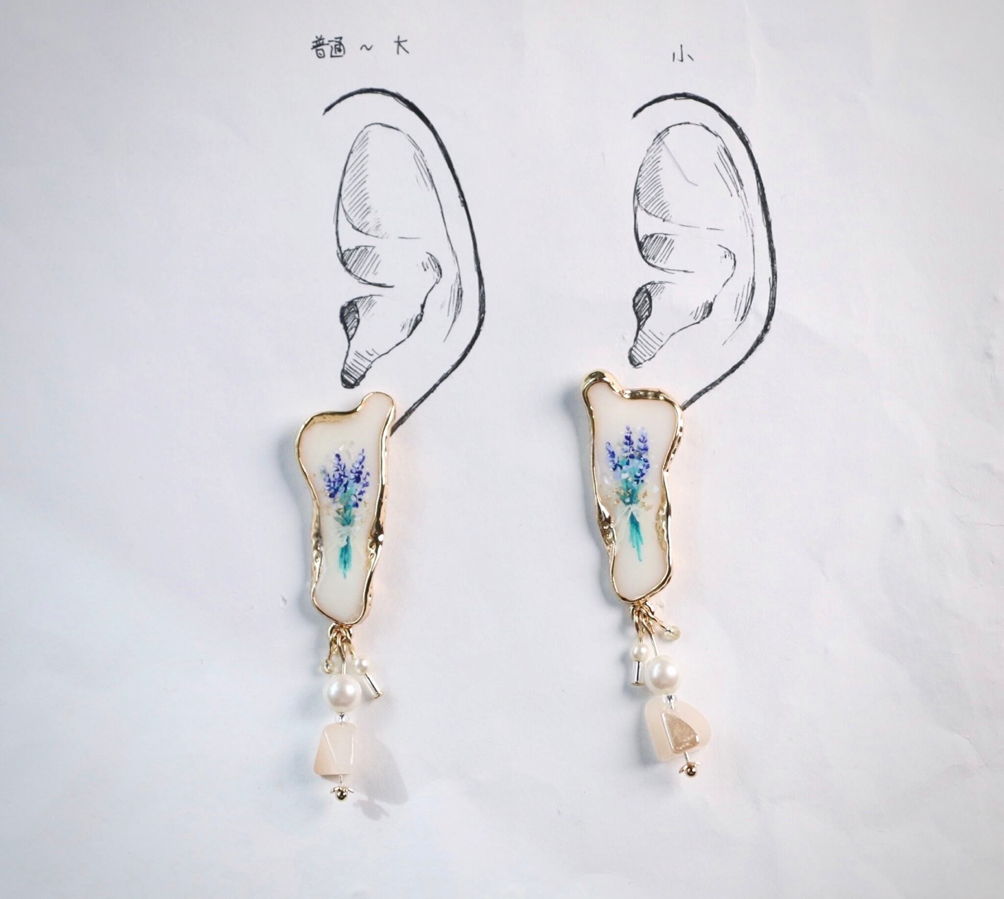 ハンドメイド ピアス 宝石 透明感 優しい パール フレンチガーリー ドライフラワー キラキラ レジン ビーズ かわいい きれい 手描き 絵付け 絵画 ヴィンテージ風 ビンテージ風 大ぶり 金 ゴールド ラベンダー 揺れる きれいめ