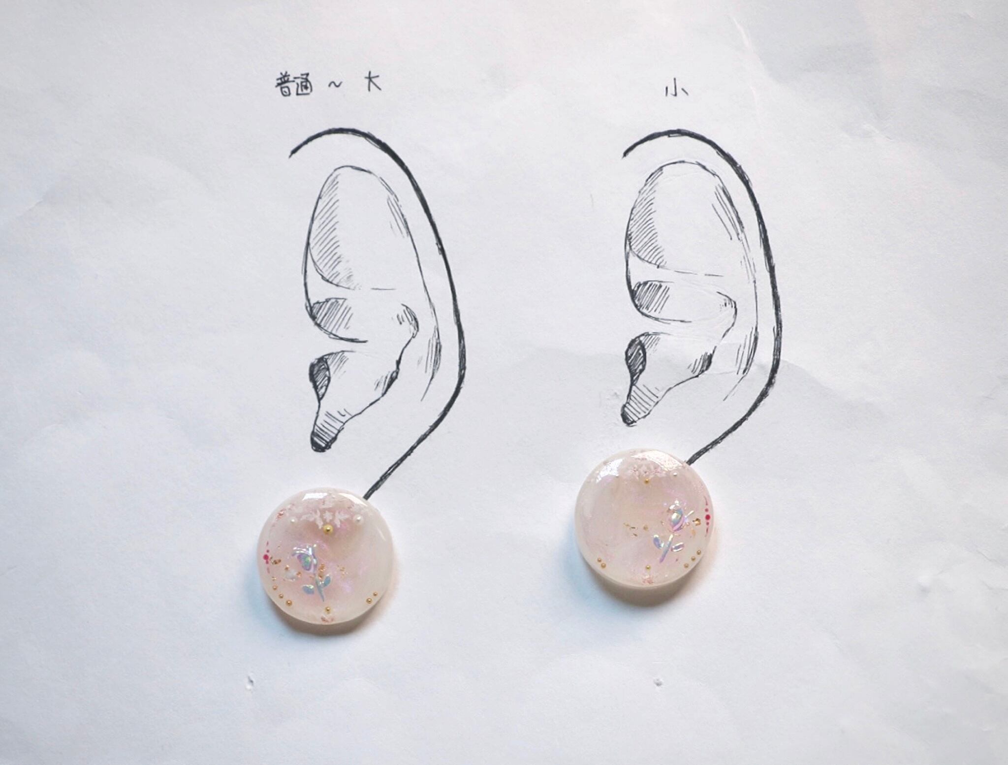 耳につけるパーツをつけていないため、台紙にはマスキングテープで留めている状態です。耳シートの左は平均的な女性の普通〜大きめの耳、右は小さめの耳のモデルとなっております。ご参照ください。