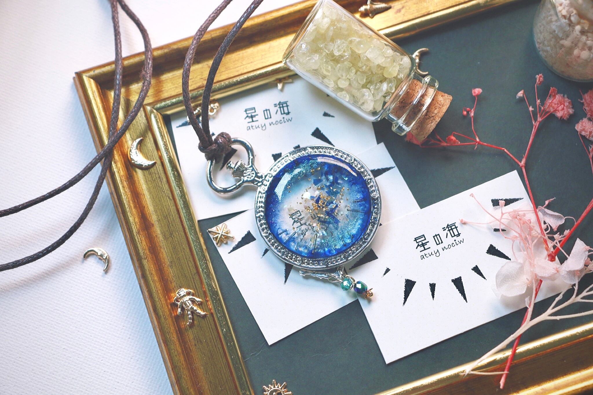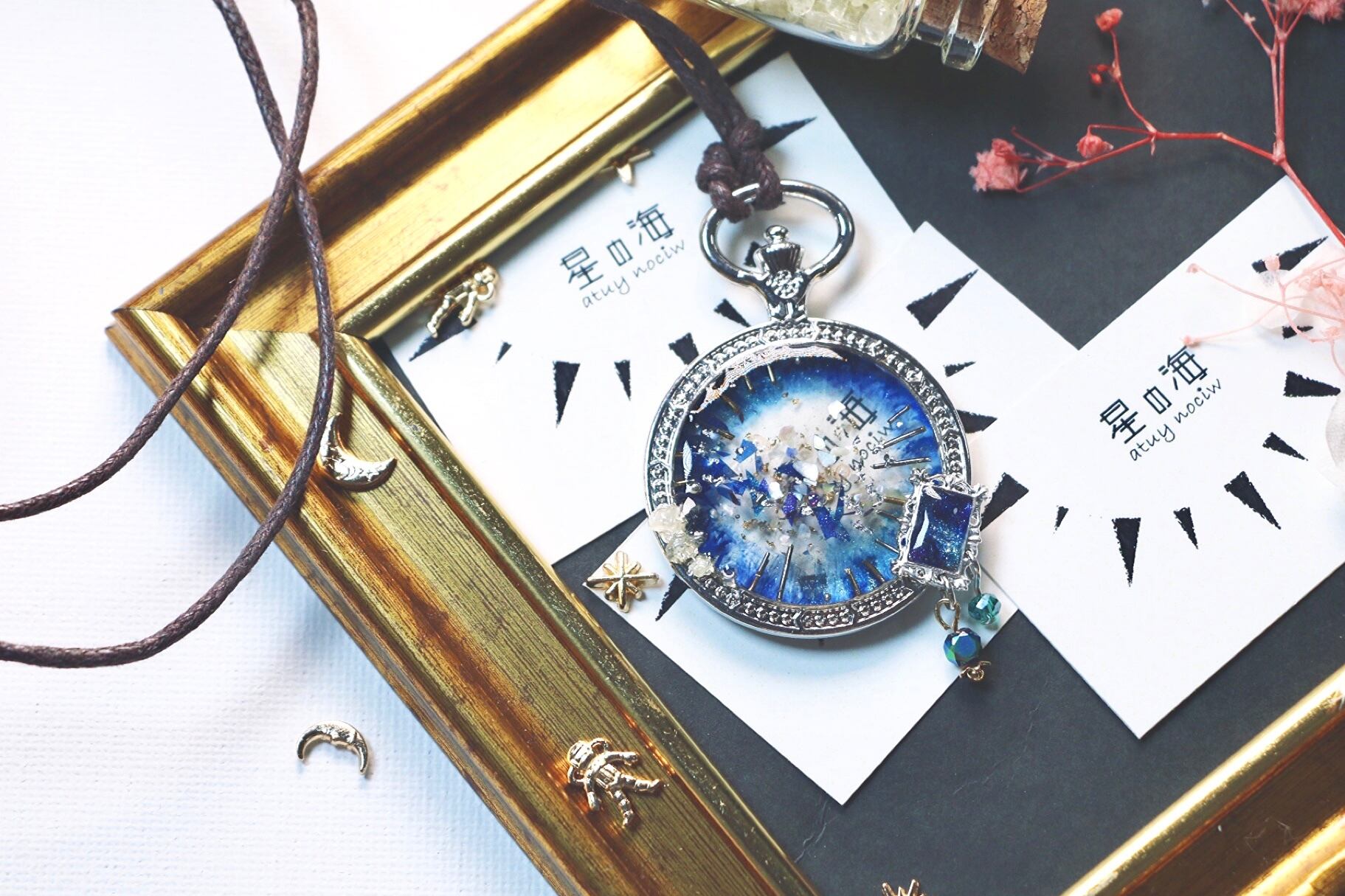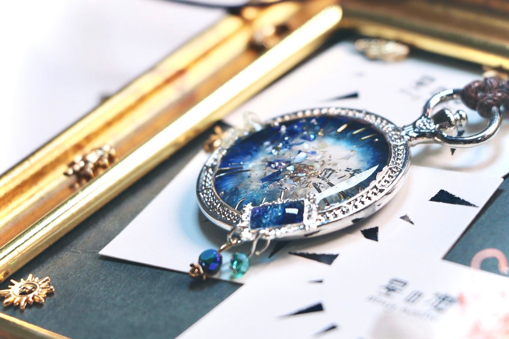 ハンドメイド ペンダント ネックレス 宝石 透明感 フ キラキラ レジン ビーズ かわいい きれい ヴィンテージ風 ビンテージ風 大ぶり 揺れる 青 宇宙 偏光 懐中時計 額縁 シルバー 銀