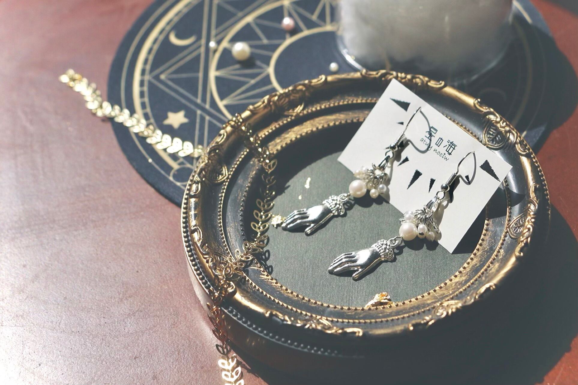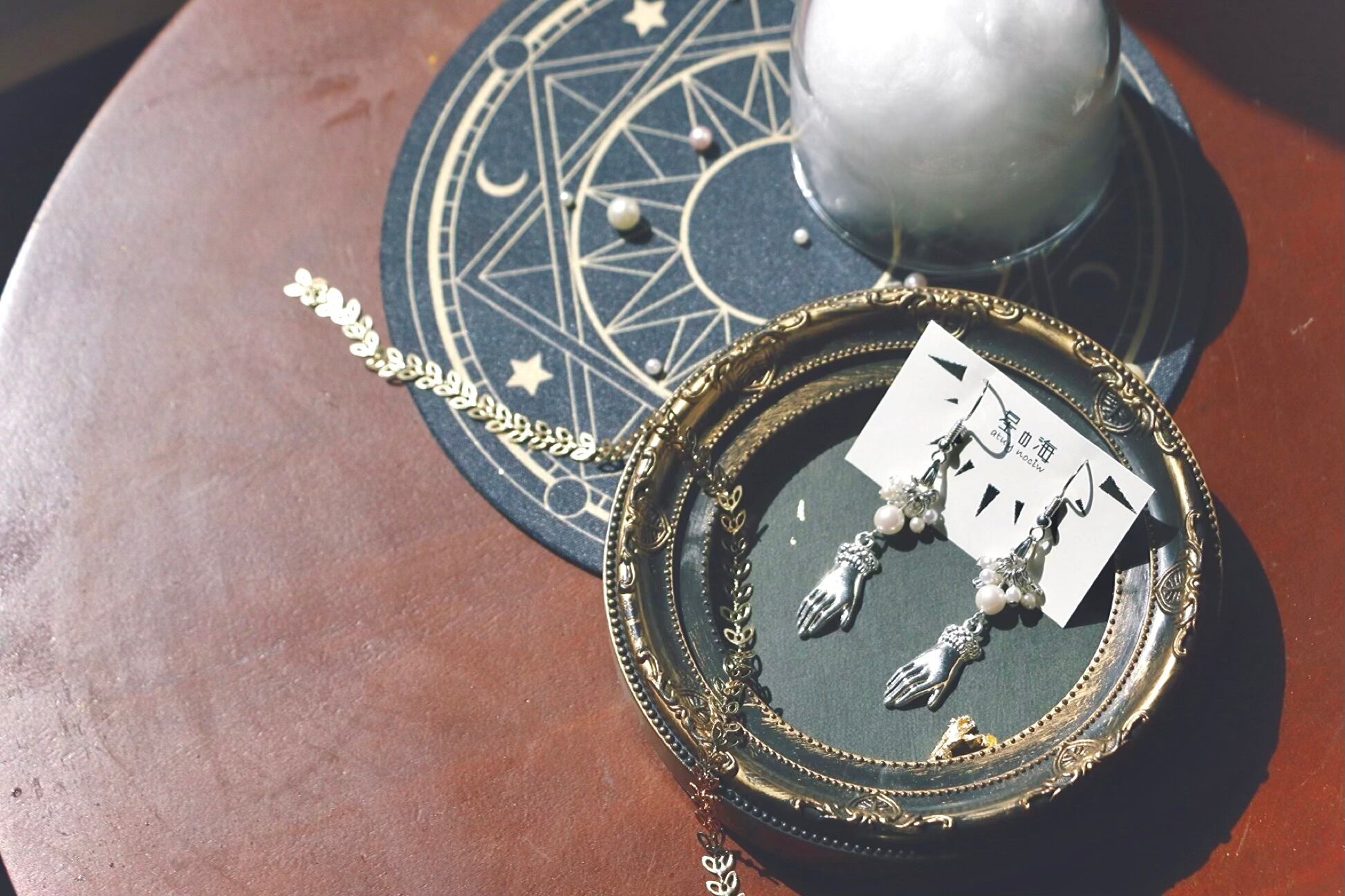手のモチーフチャームをポイントにしたパールたっぷりの作品が追加に。