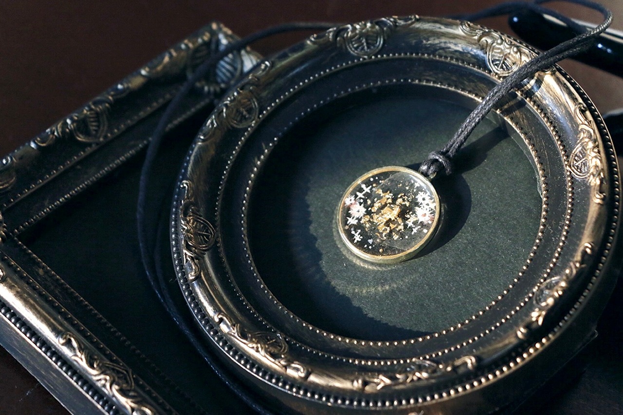 ゴールドの枠にはたっぷりのクリアを。真ん中には金箔を漂わせることで光が集まっているデザインにしています。