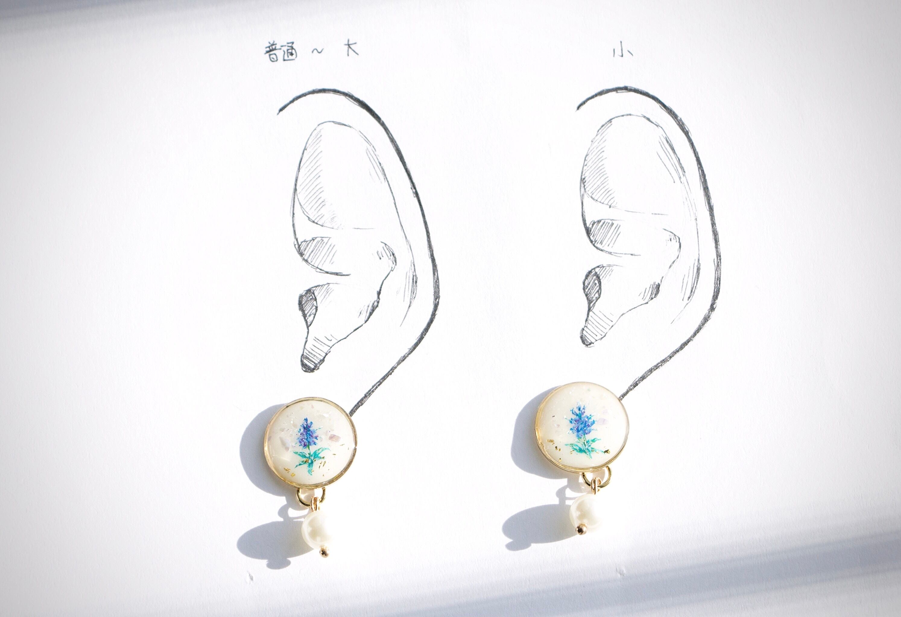 耳につけるパーツをつけていないため、台紙にはマスキングテープで留めている状態です。耳シートではピアスパーツを当てています。左は平均的な女性の普通〜大きめの耳、右は小さめの耳のモデルとなっております。ご参照ください。