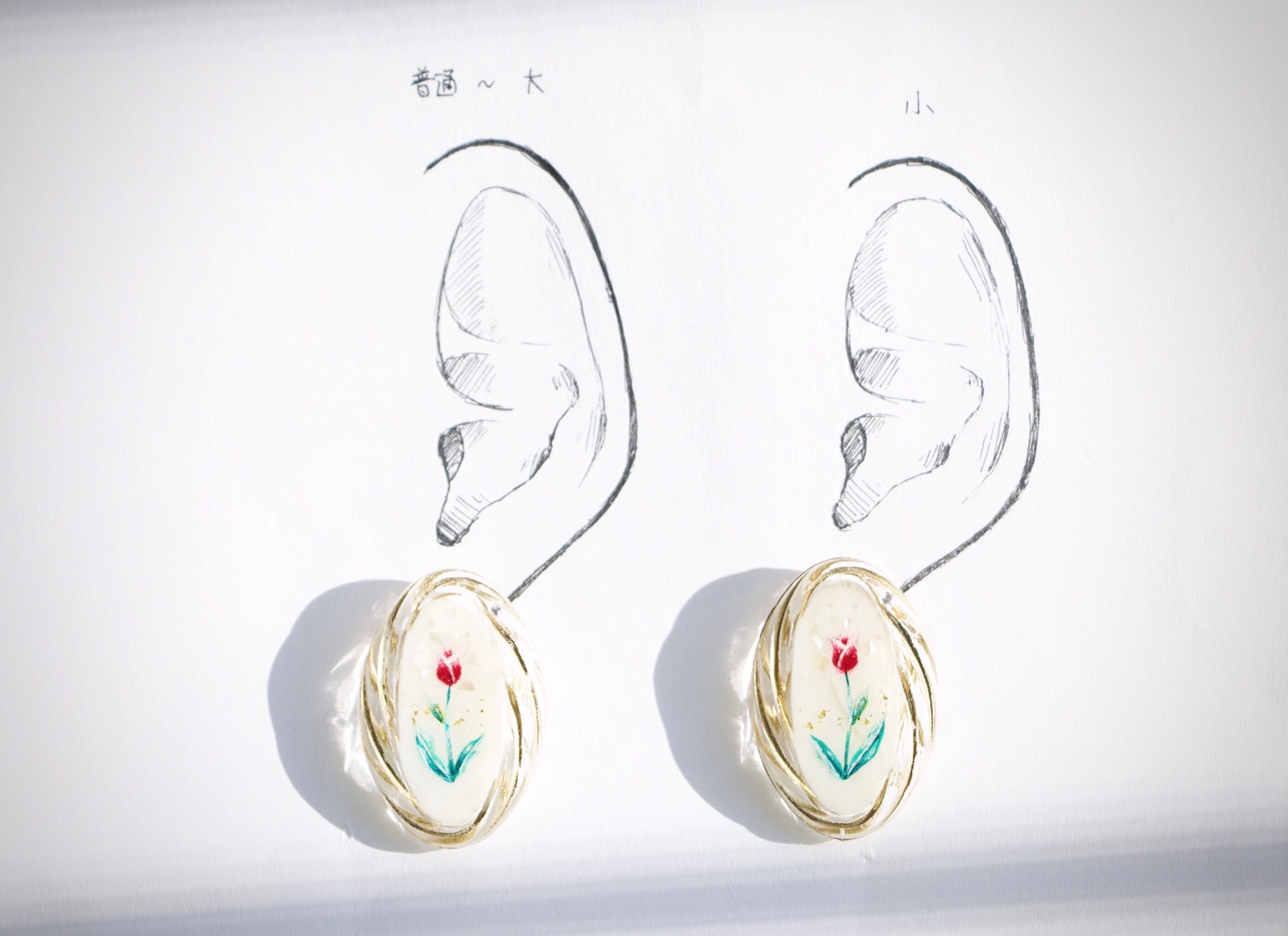 ハンドメイド アクセサリー ピアス イヤリング ノンホールピアス 植物 チューリップ ピンク 白 透明 キラキラ 大ぶり シンプル 大人っぽい 手描き かわいい きれい